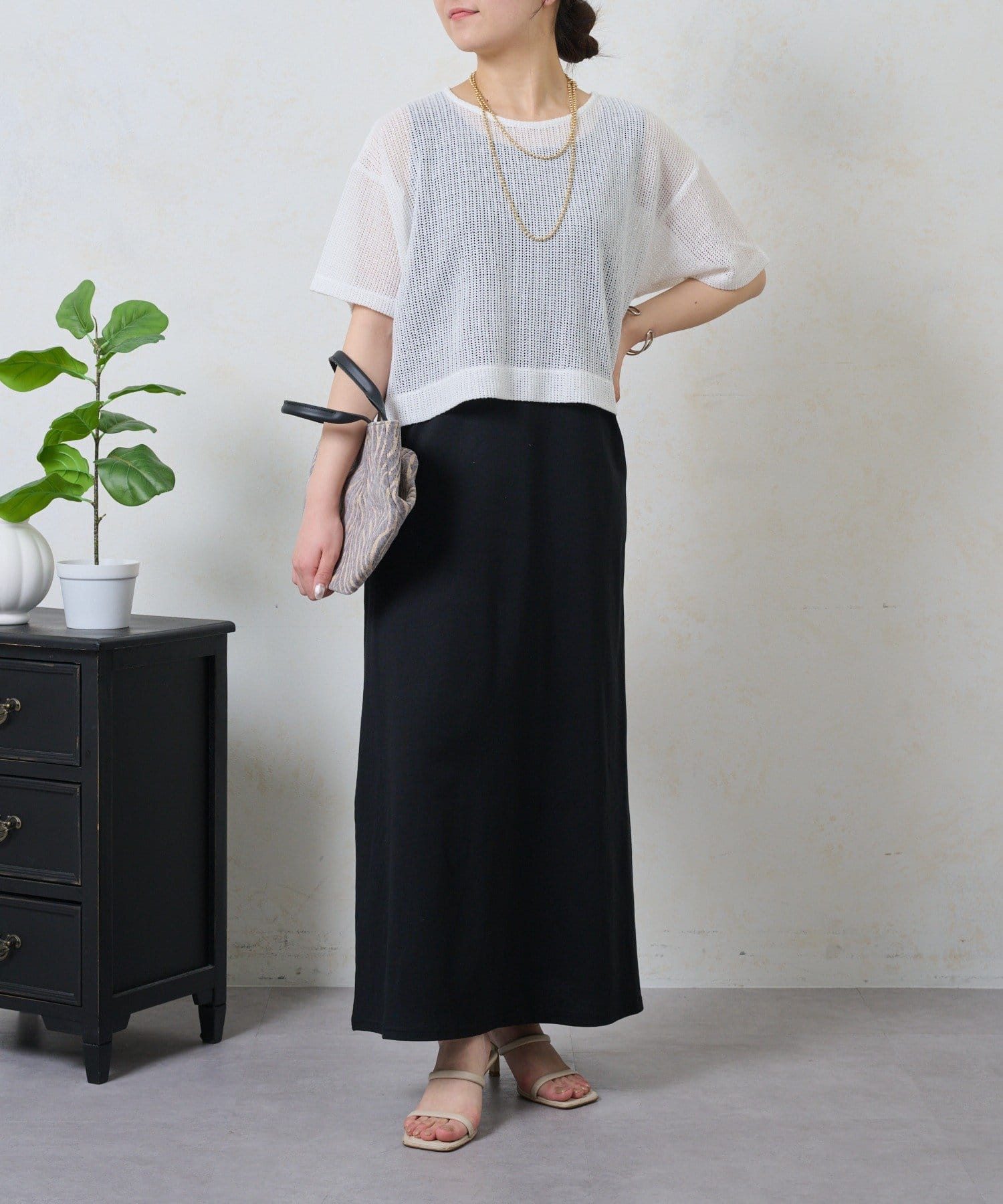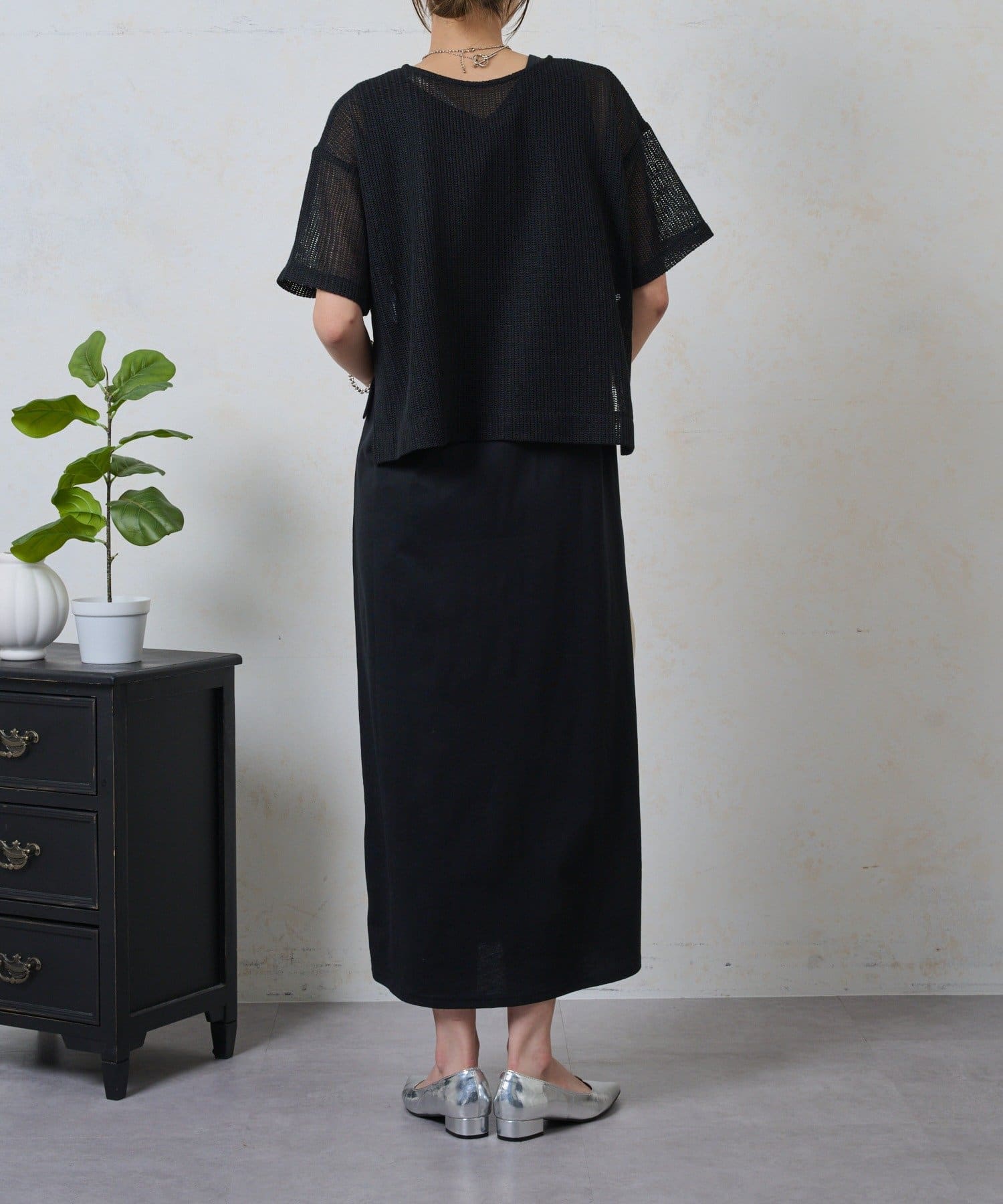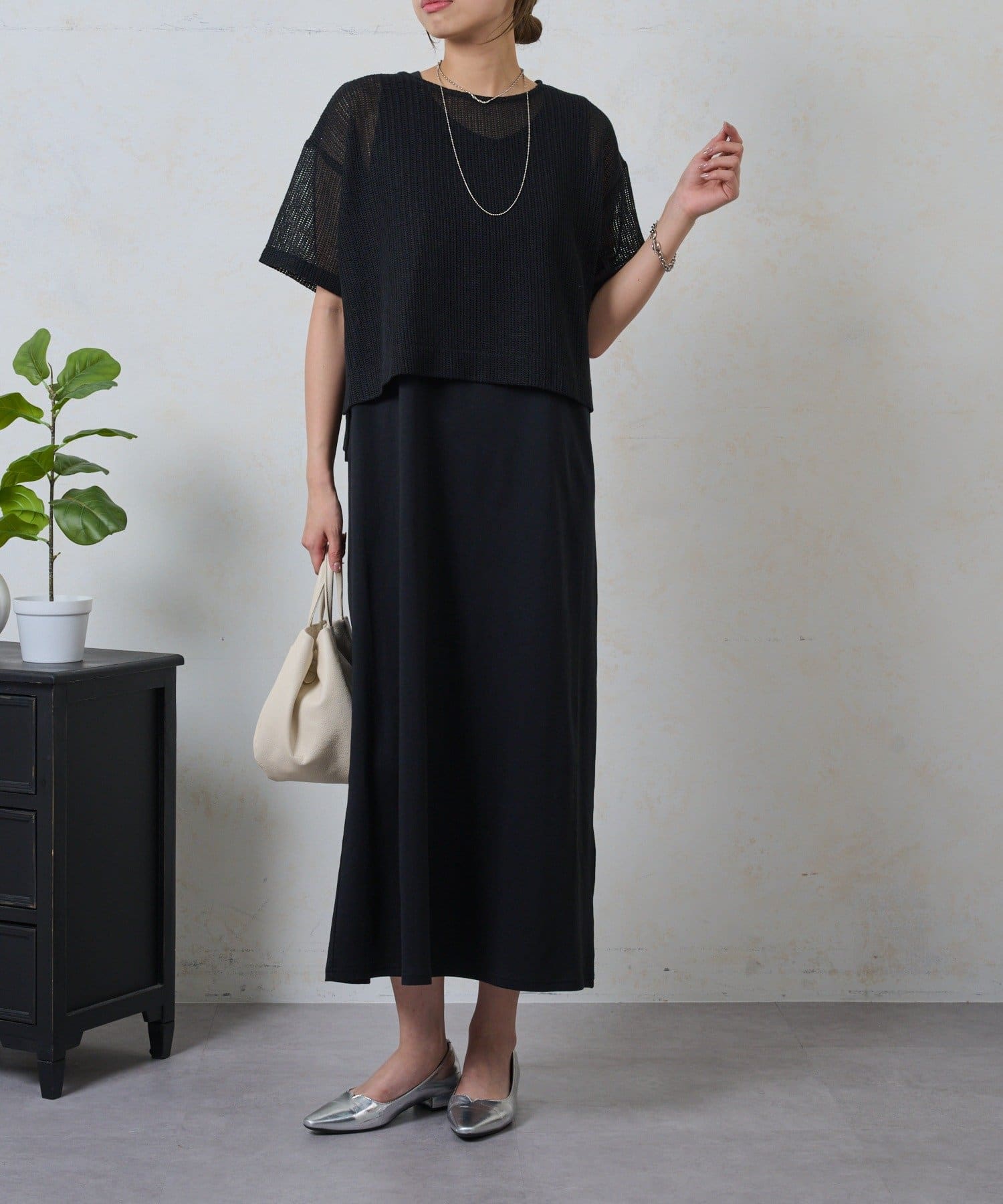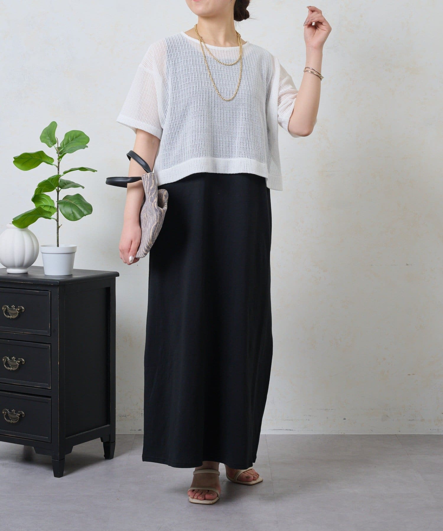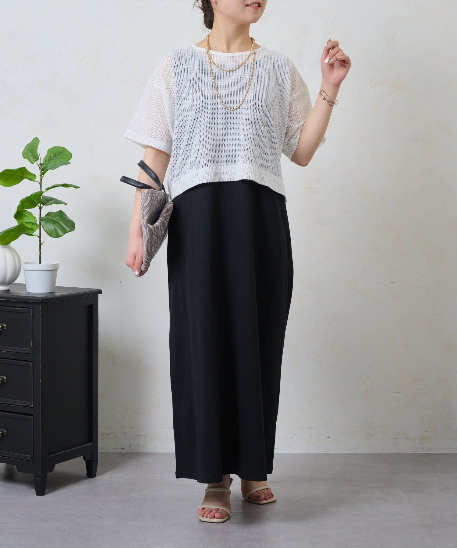 ・トレンドのレイヤードスタイルが即完成する、メッシュトップスとロングスカートのセットが登場。