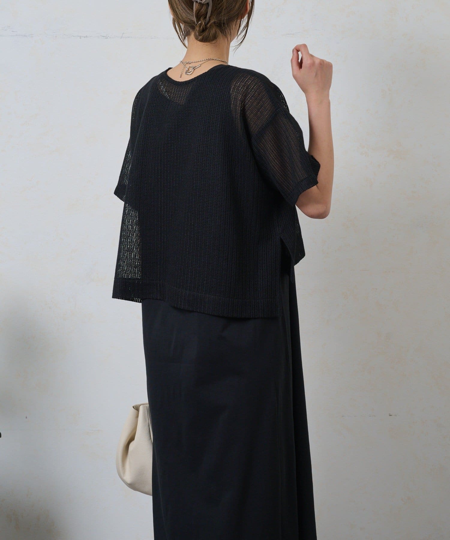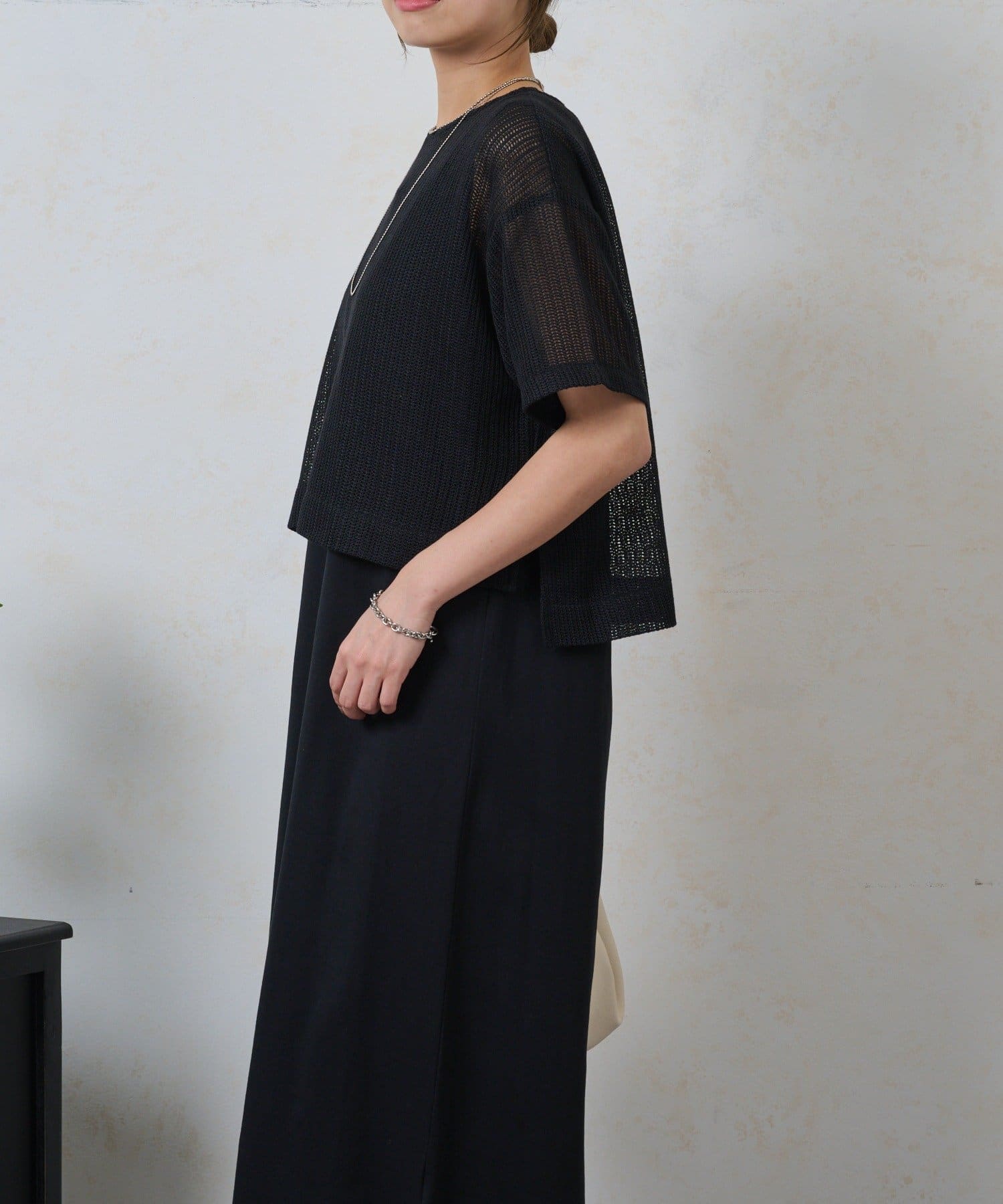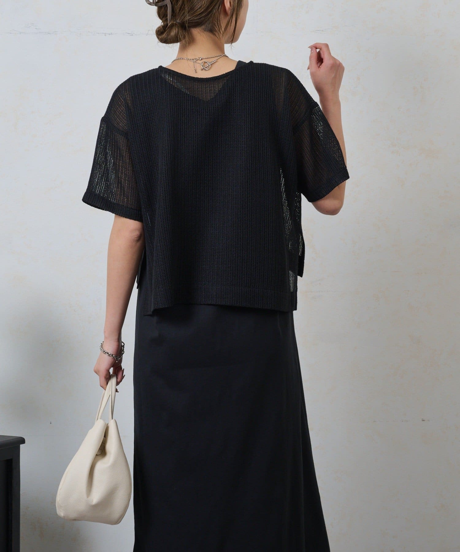 ・トップスは涼しげなメッシュ素材でこれからの季節にぴったり。お手持ちのキャミソールやタンクトップとのレイヤードで、様々な表情を楽しめます。
