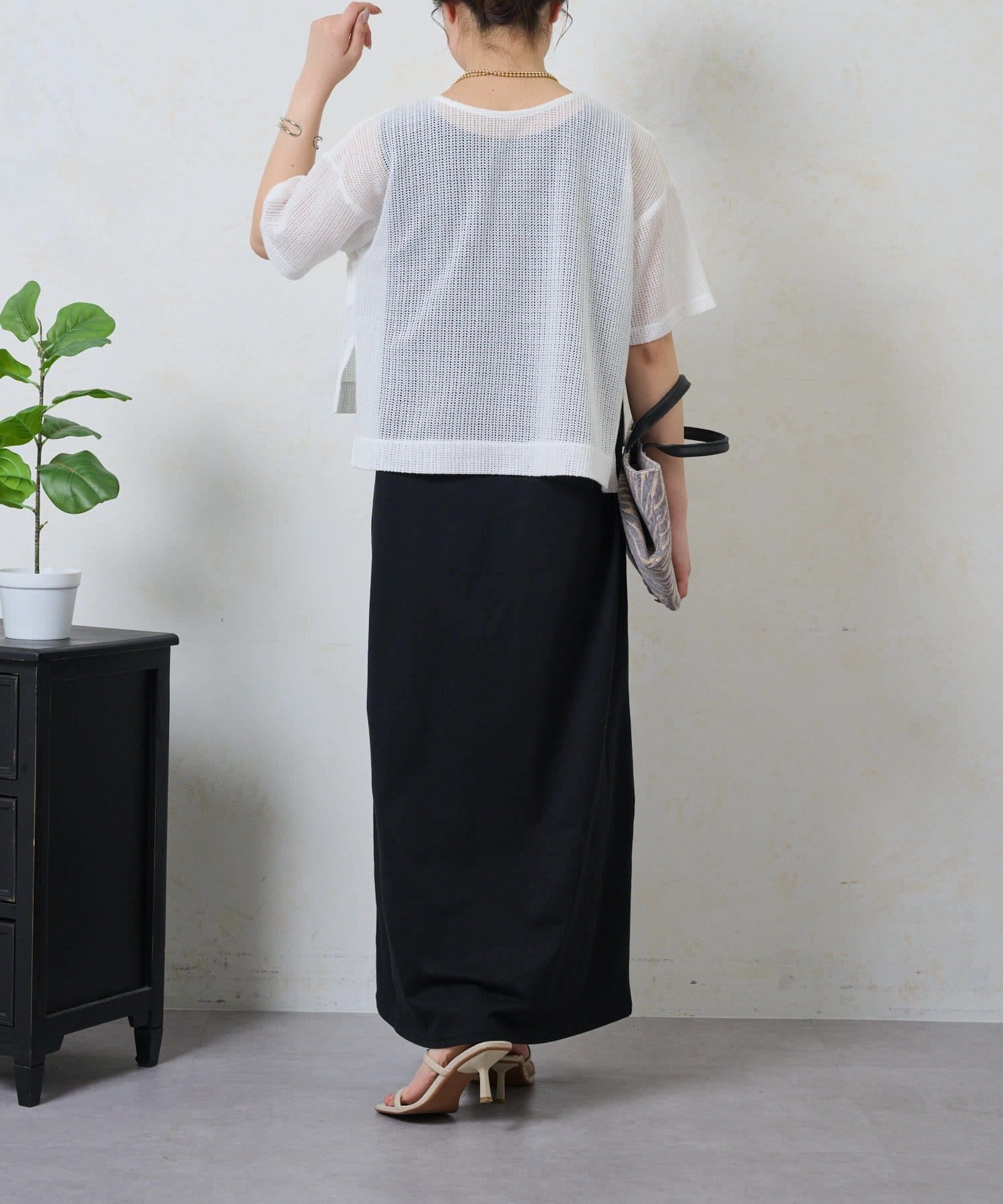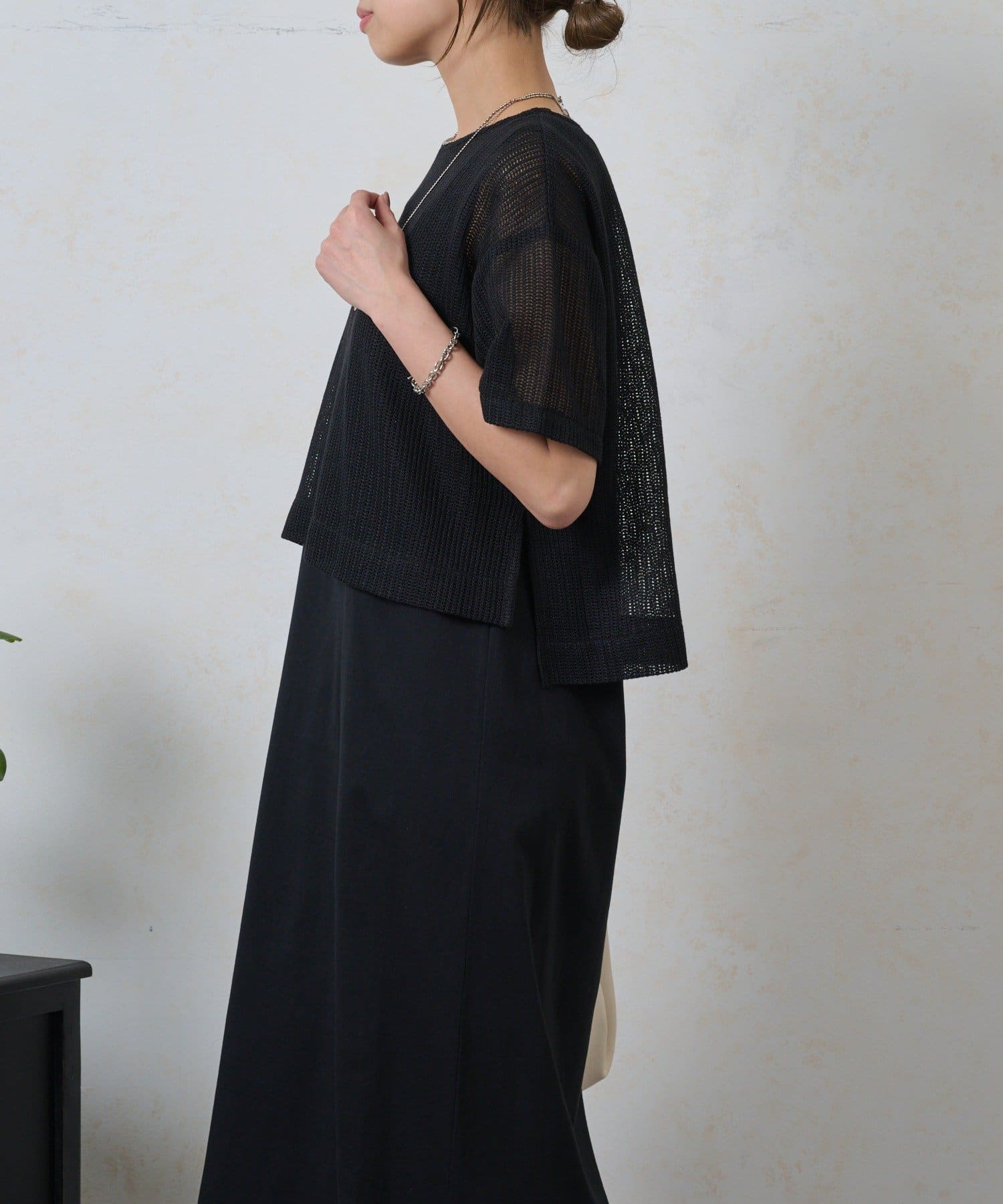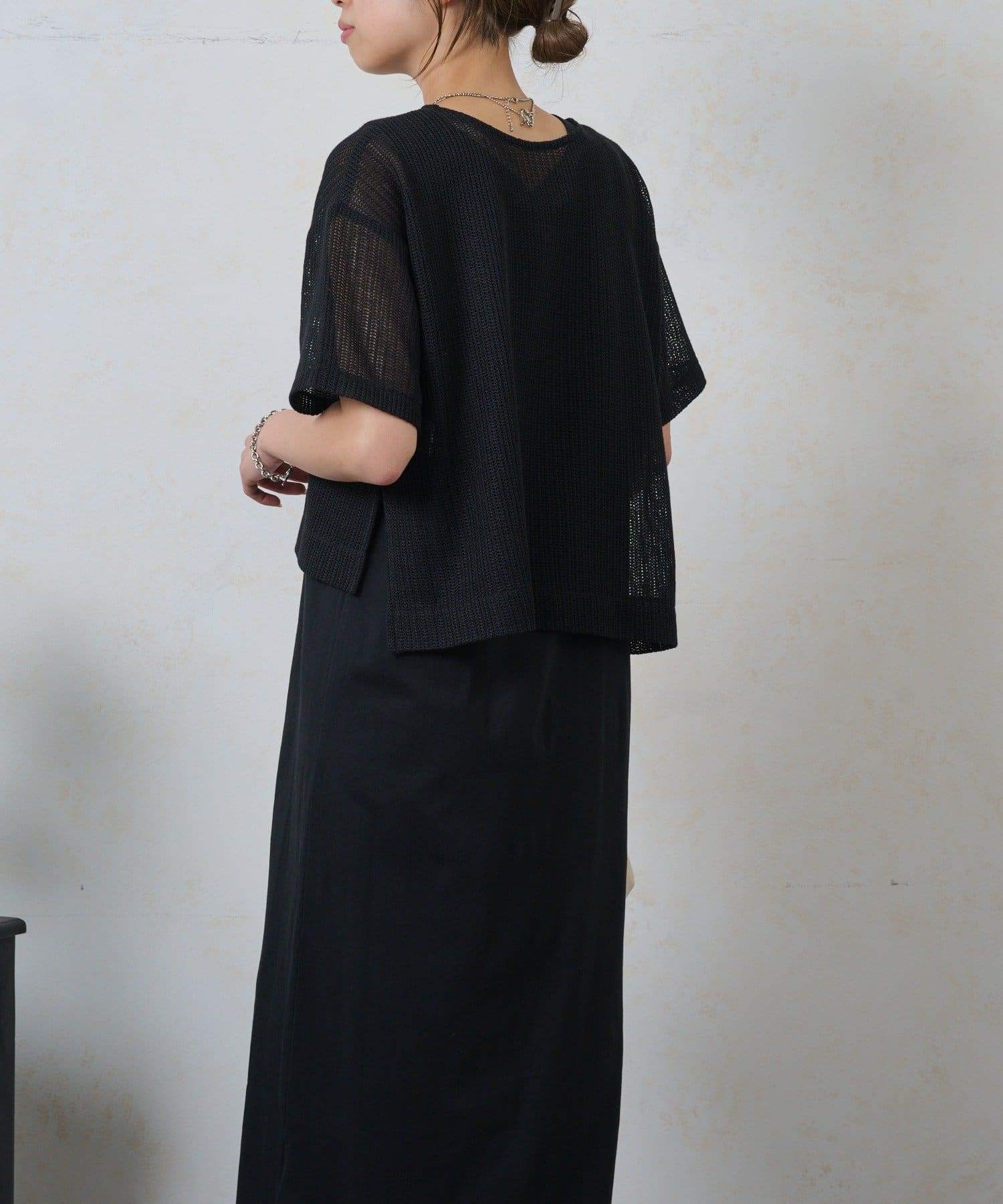 ・トップスは涼しげなメッシュ素材でこれからの季節にぴったり。お手持ちのキャミソールやタンクトップとのレイヤードで、様々な表情を楽しめます。