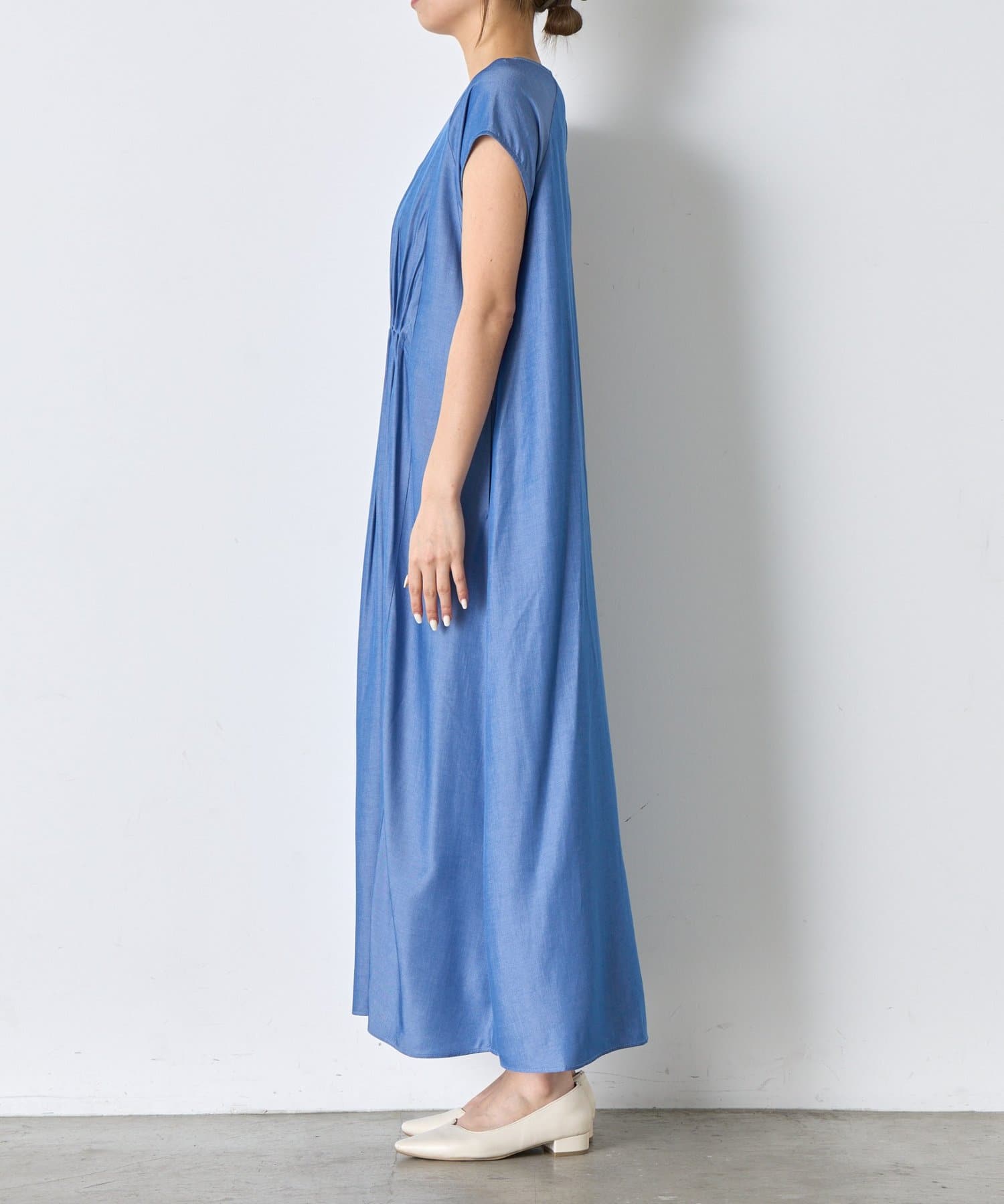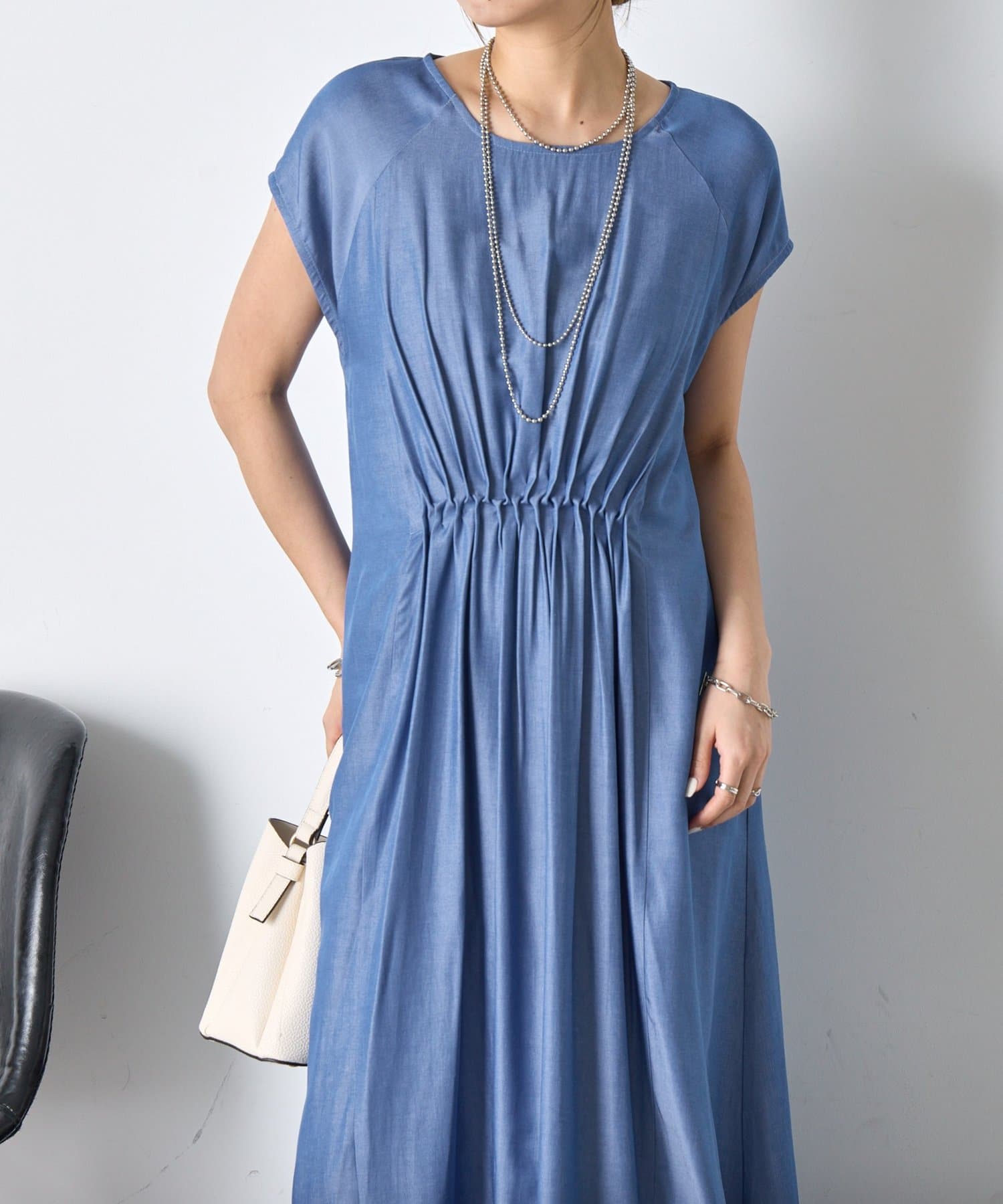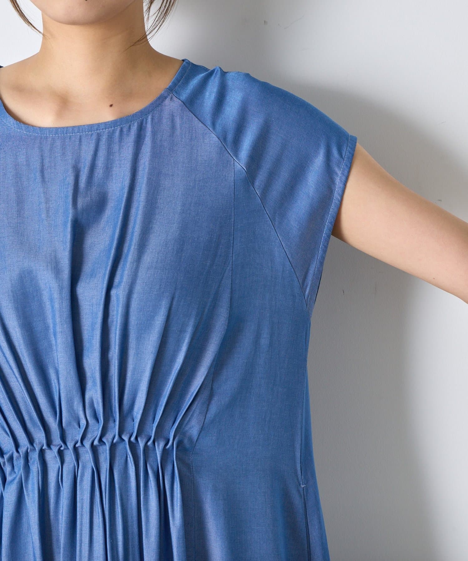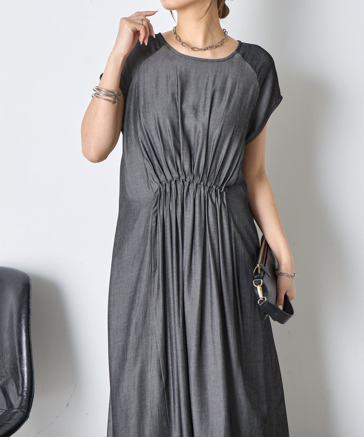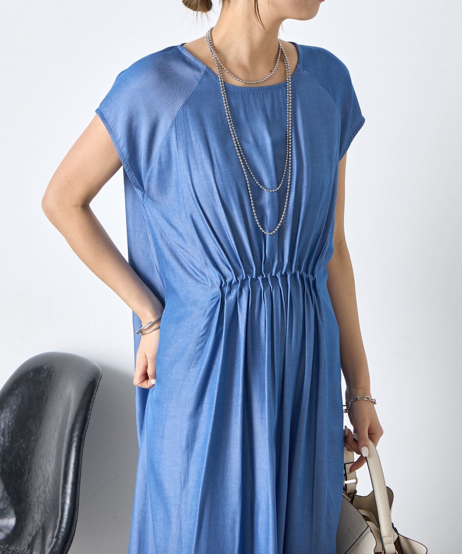 ・胸元のギャザーが、女性らしい柔らかなドレープを生み出し、上品でフェミニンな印象を与えます。
