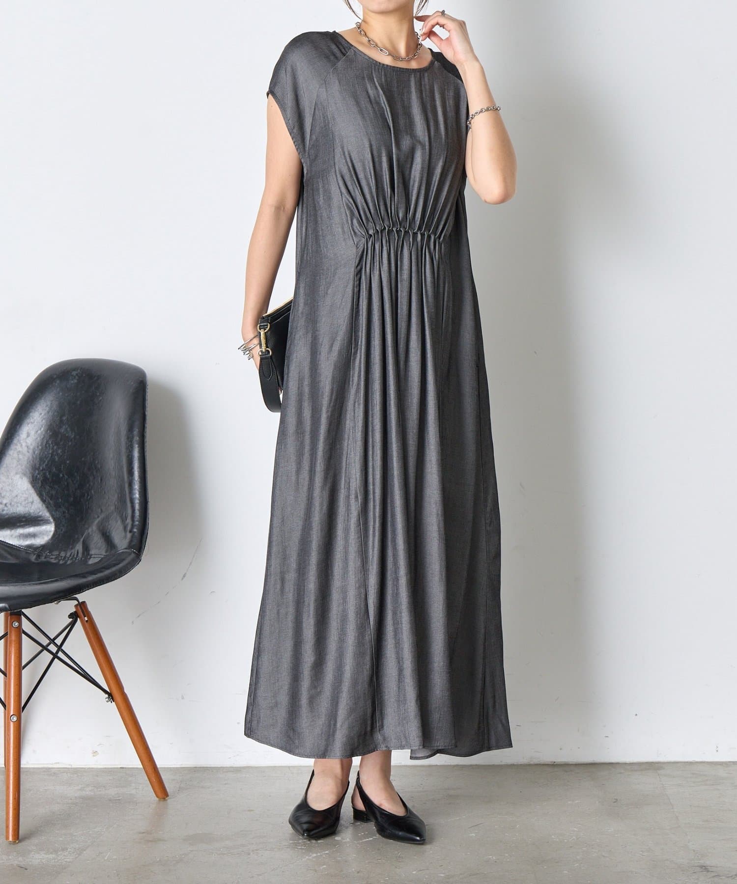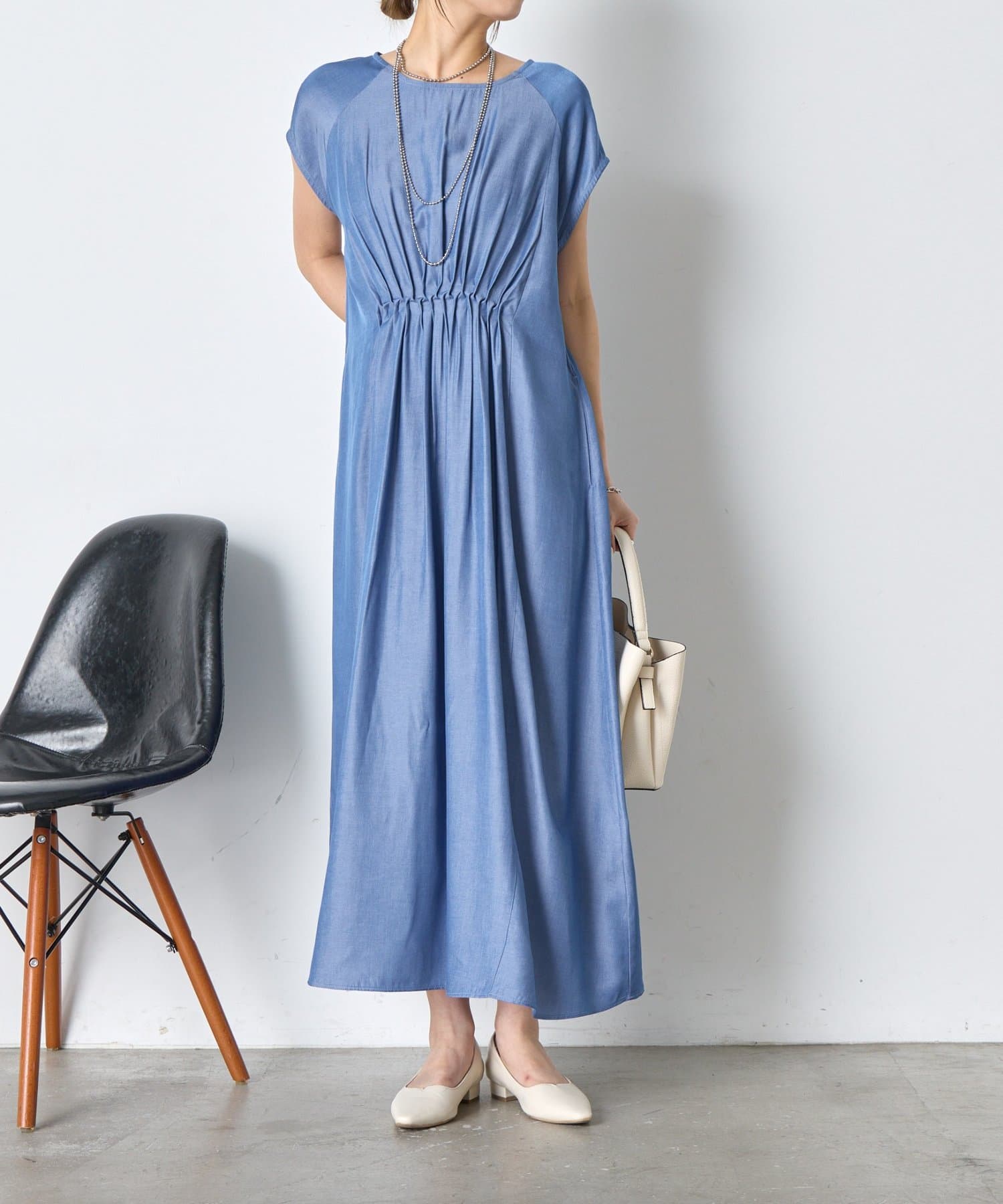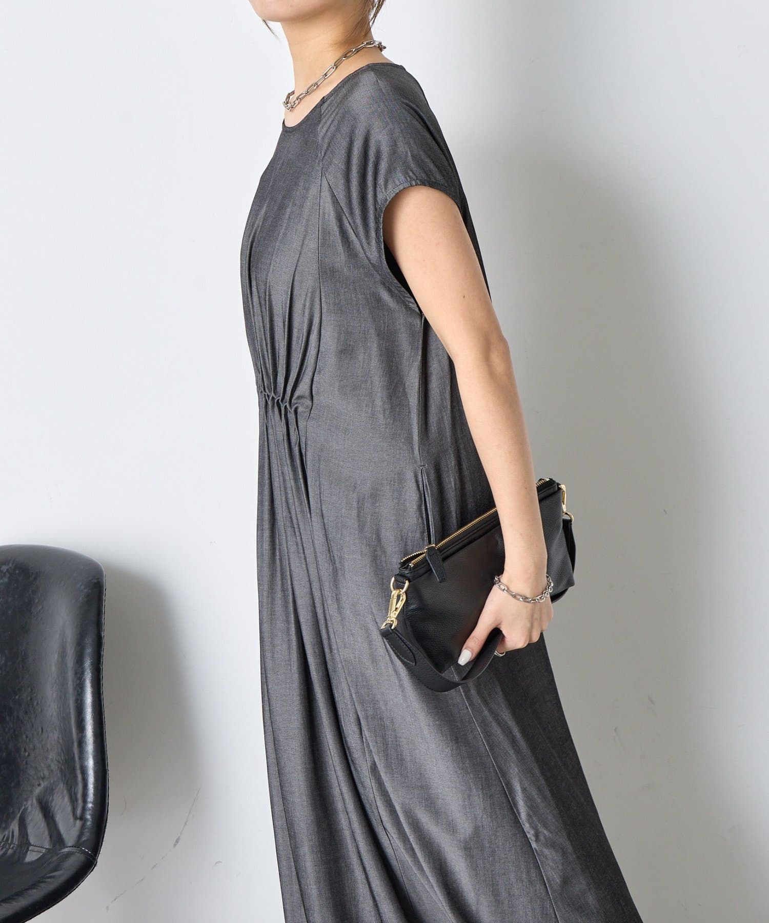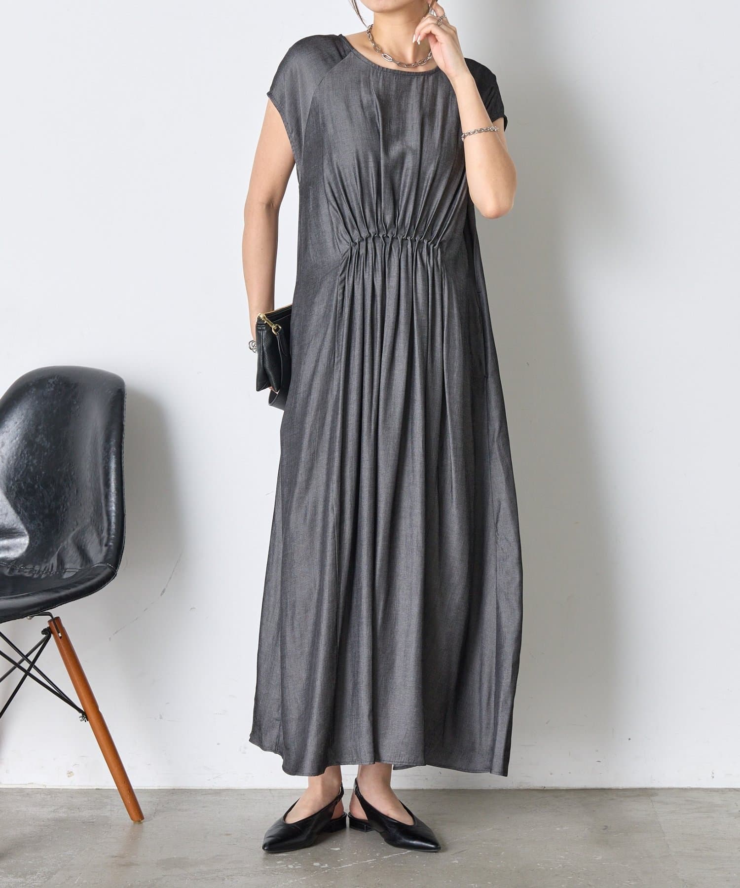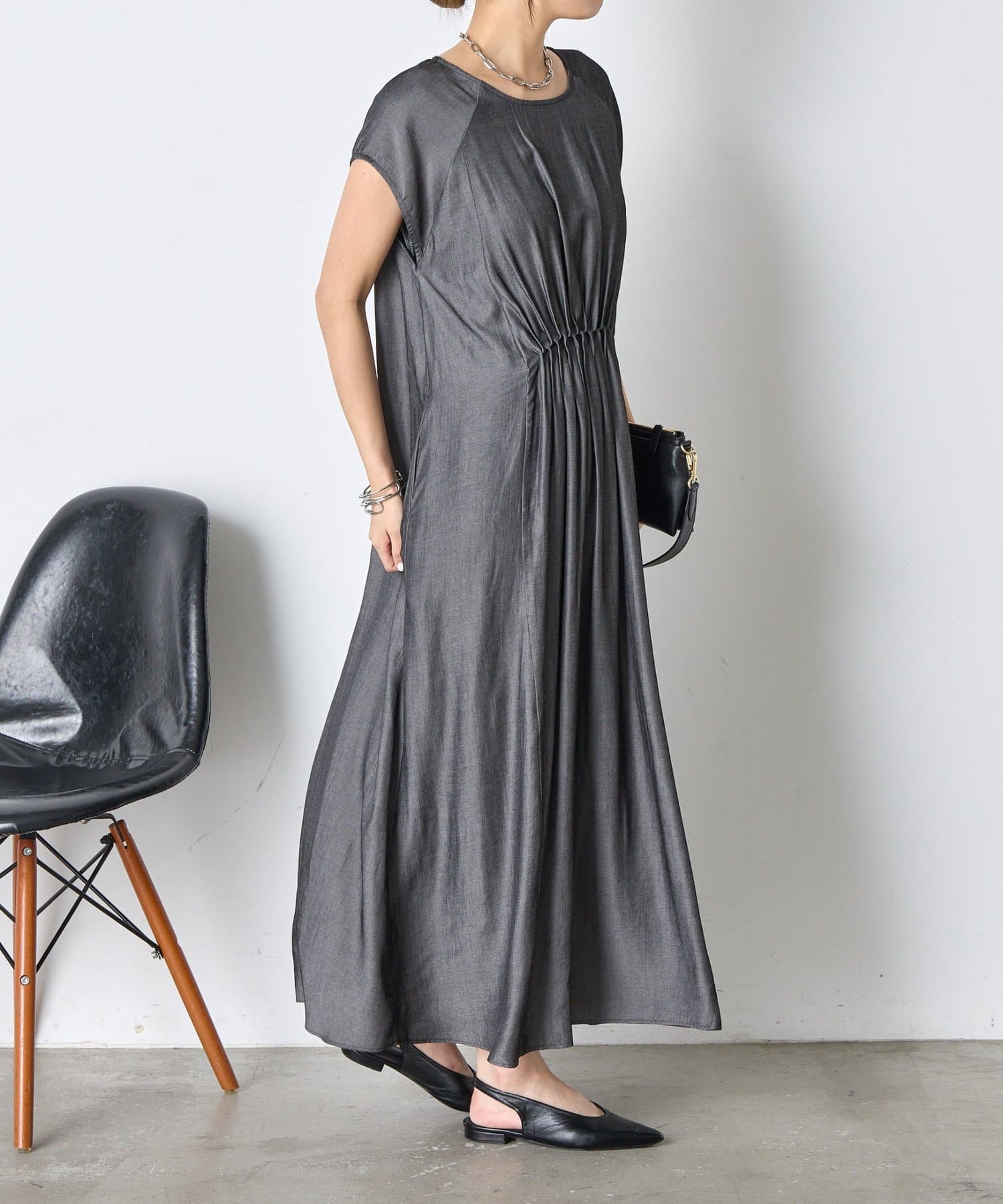 ・胸元のギャザーが、女性らしい柔らかなドレープを生み出し、上品でフェミニンな印象を与えます。