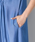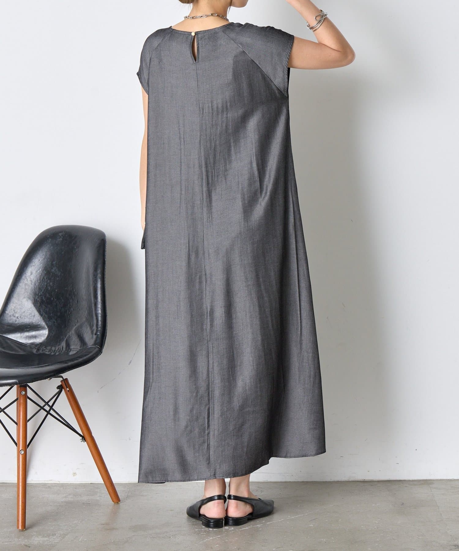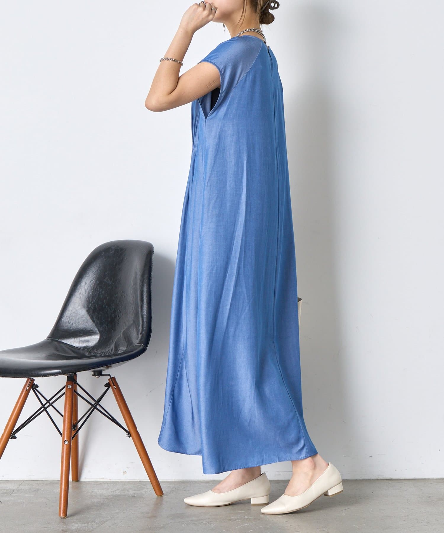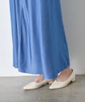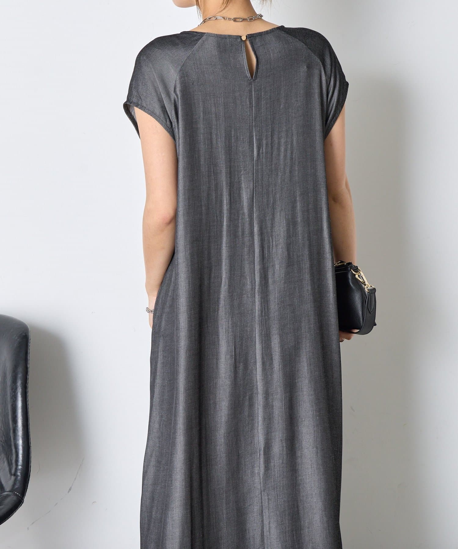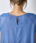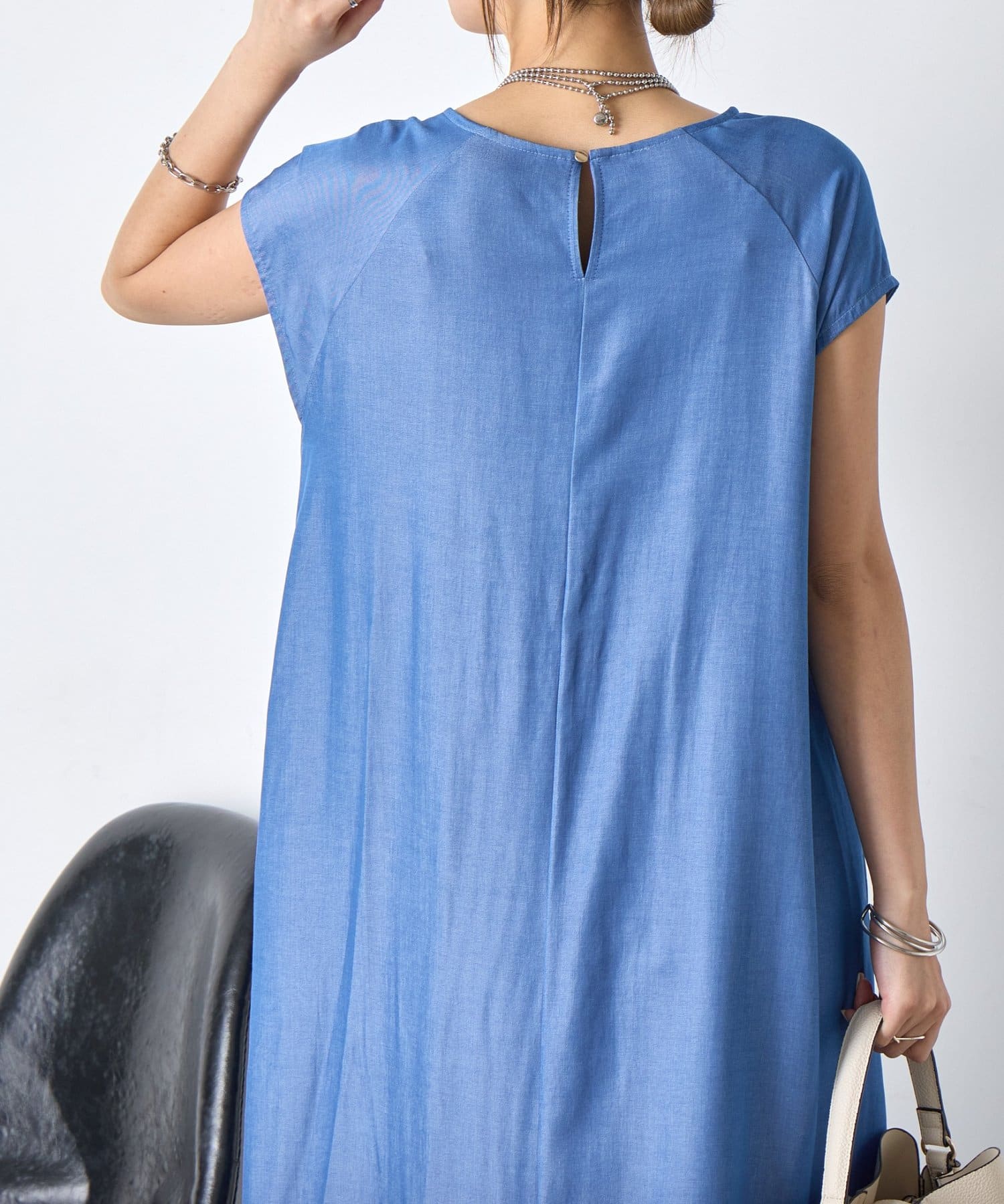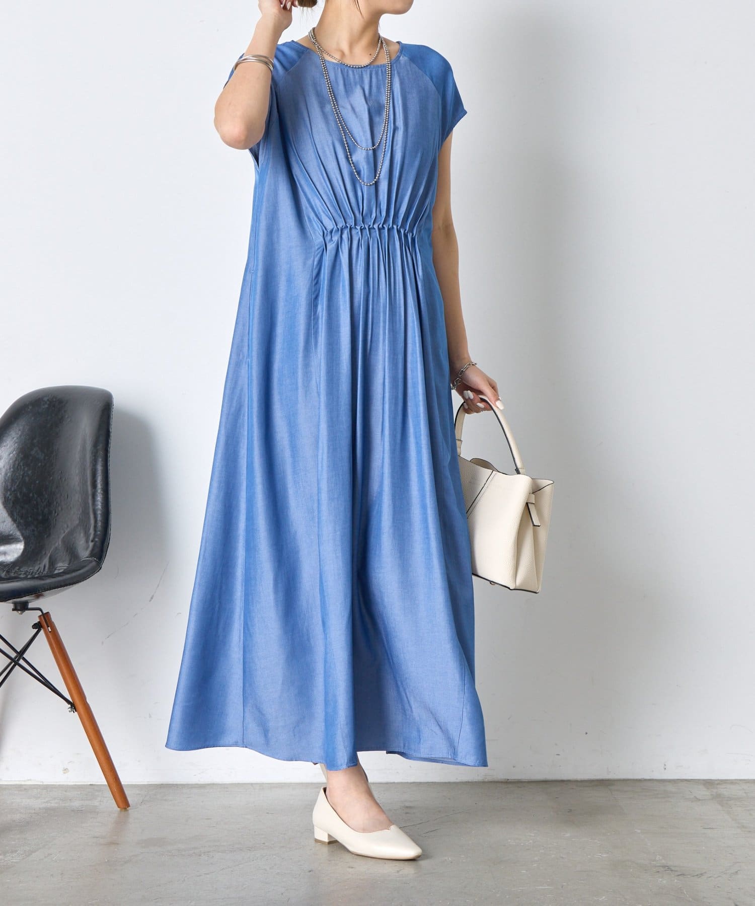 ・胸元のギャザーが、女性らしい柔らかなドレープを生み出し、上品でフェミニンな印象を与えます。