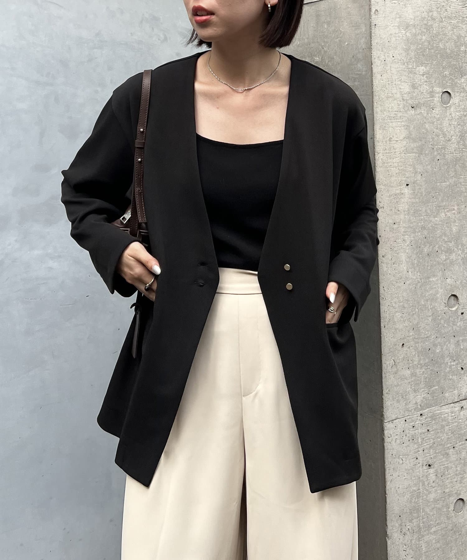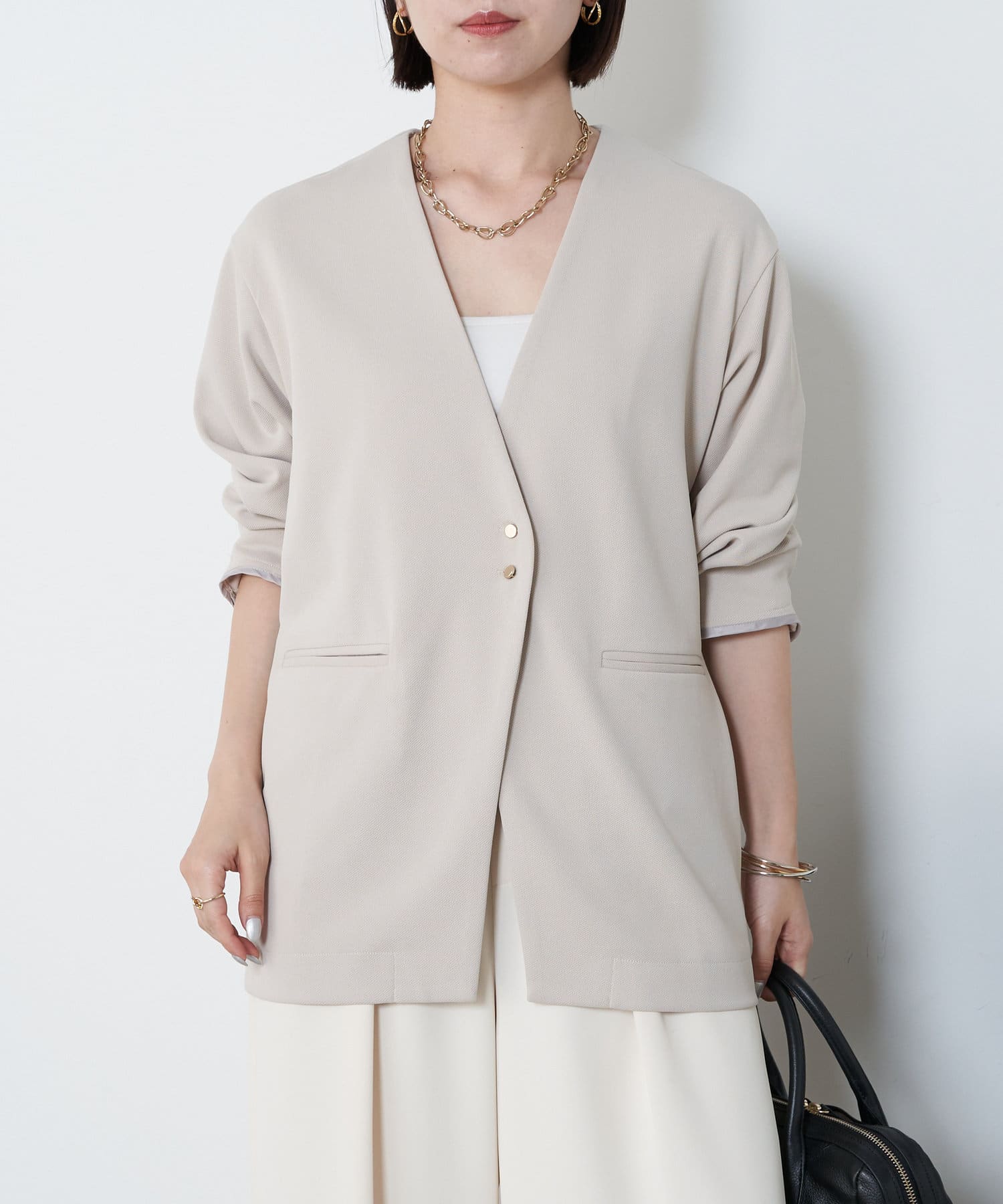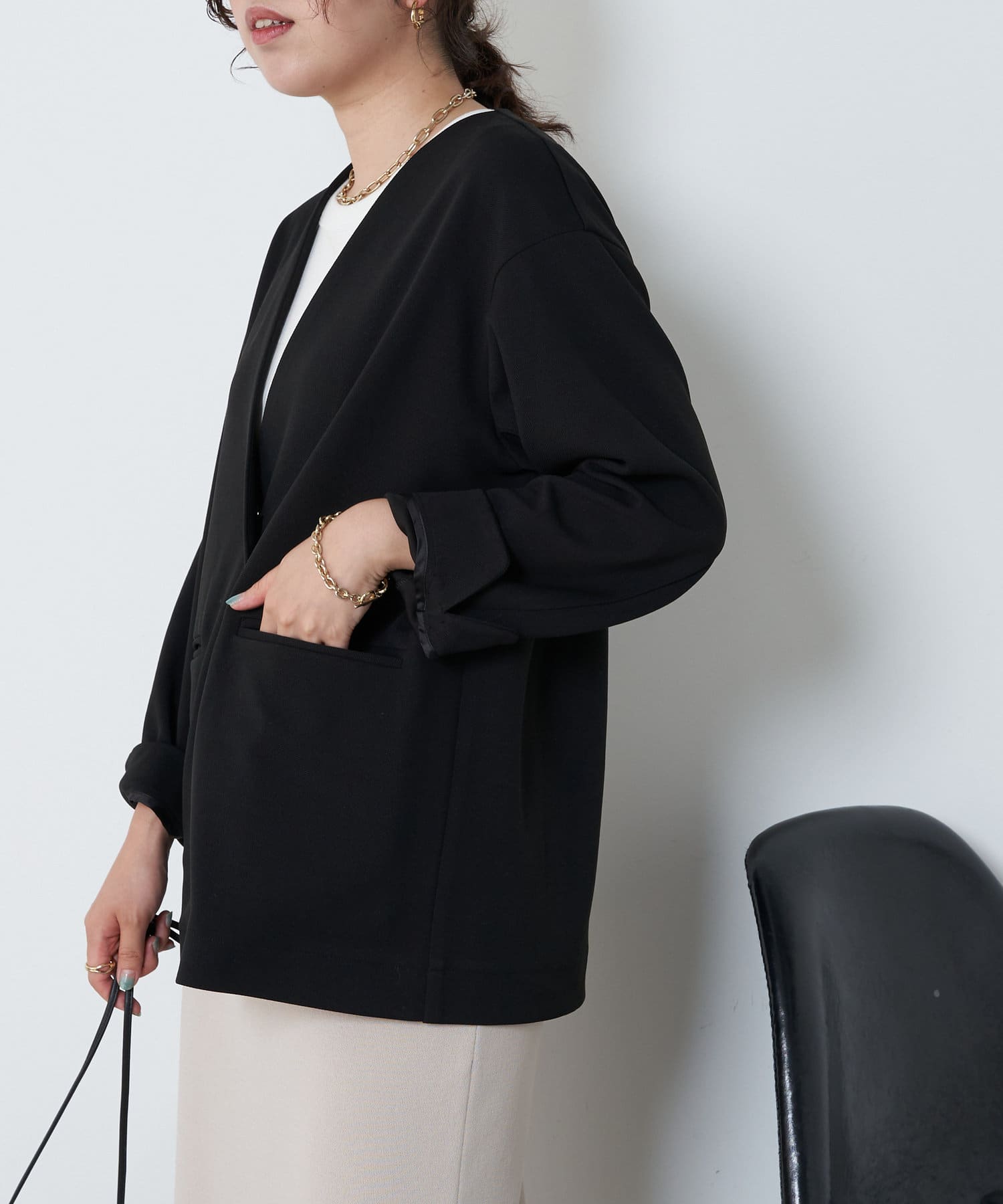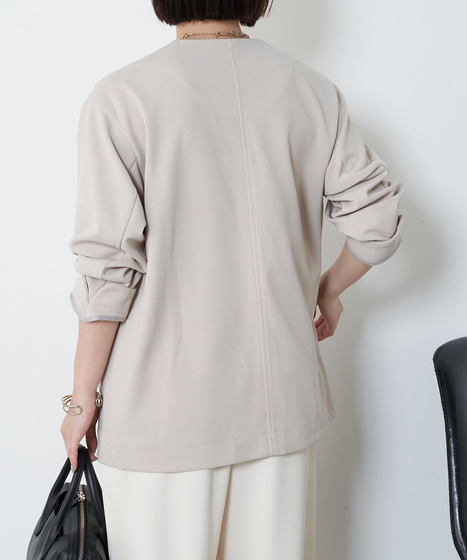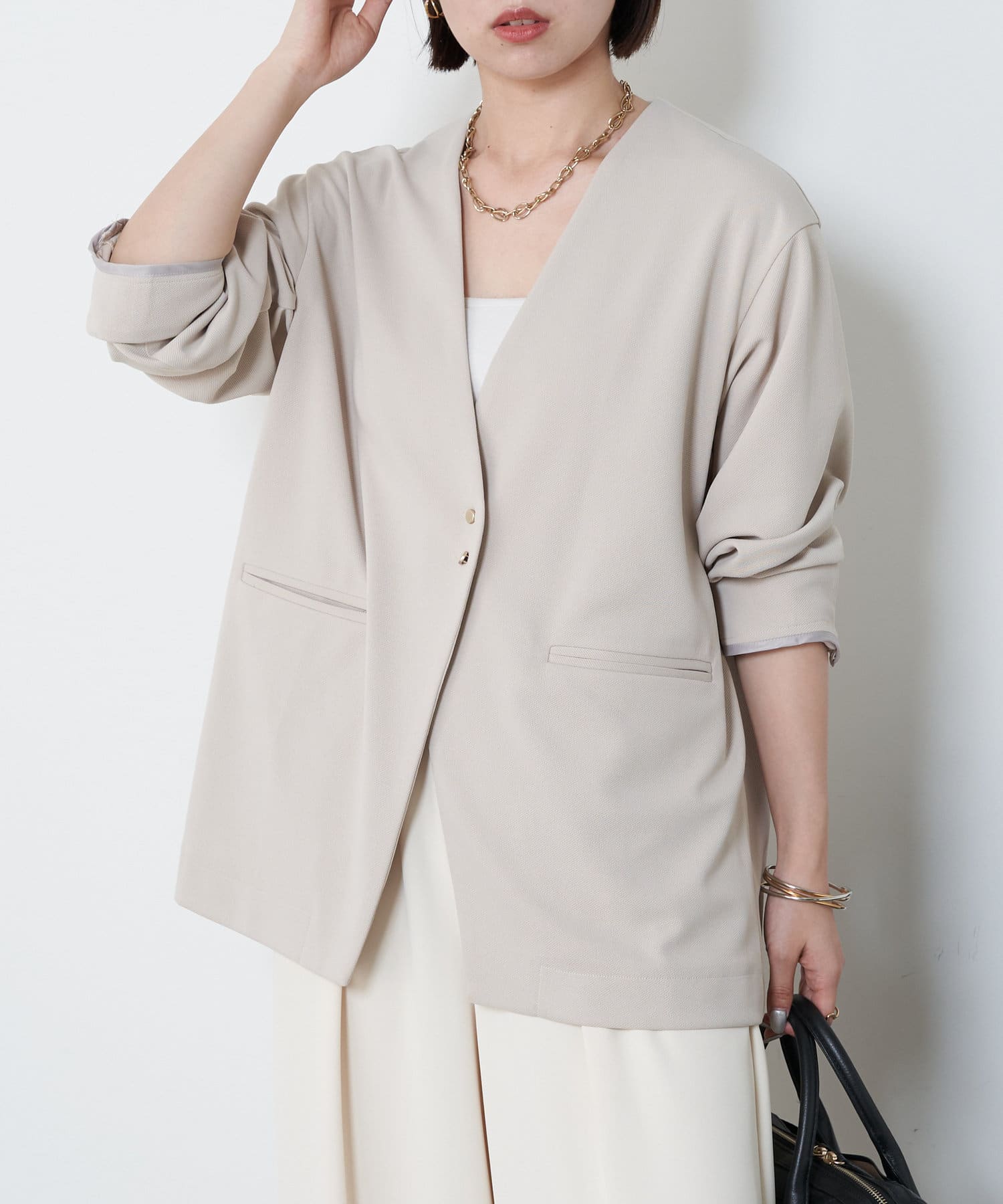 ・オンオフ分けて着回しできる大人なノーカラージャケットが登場!