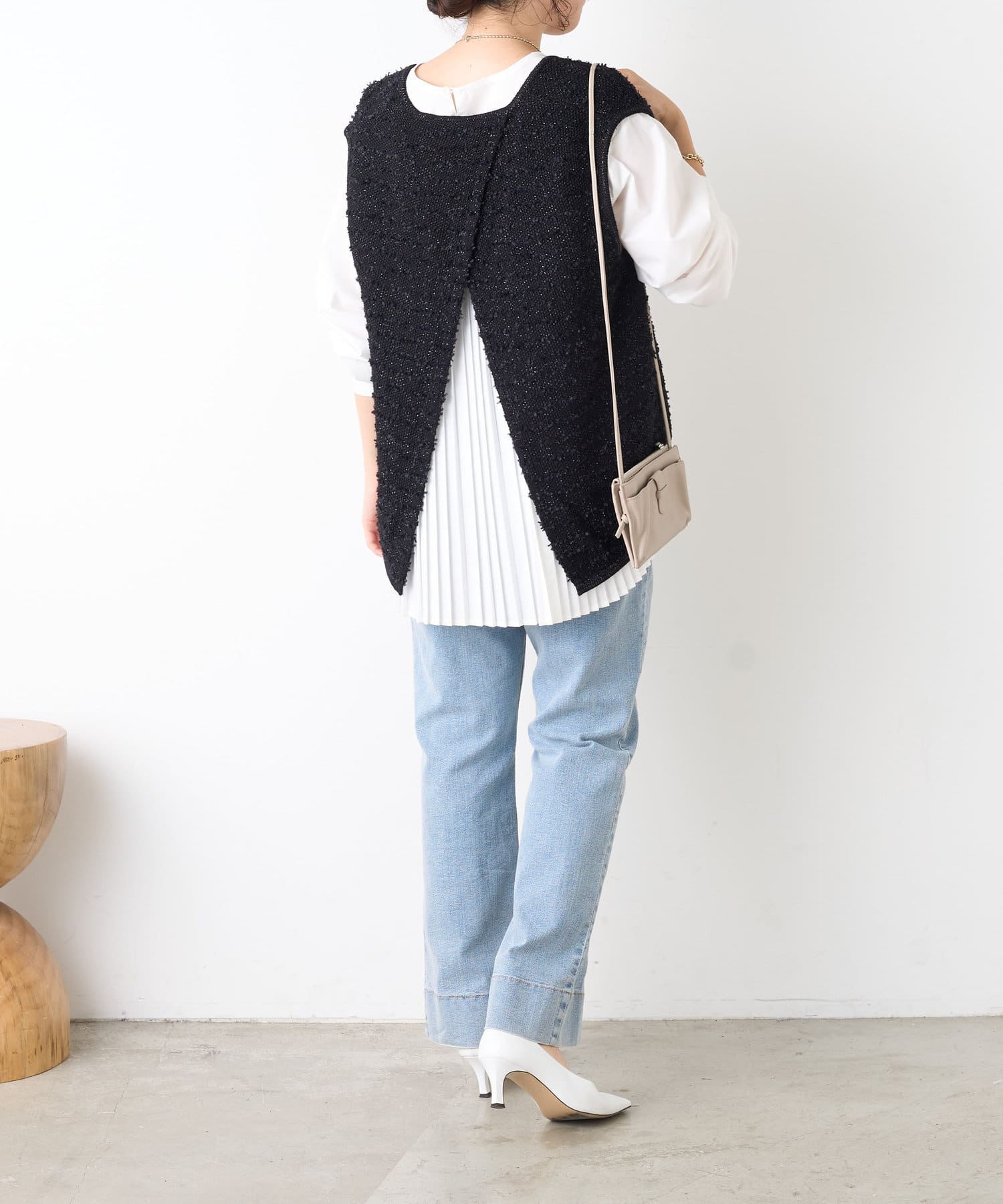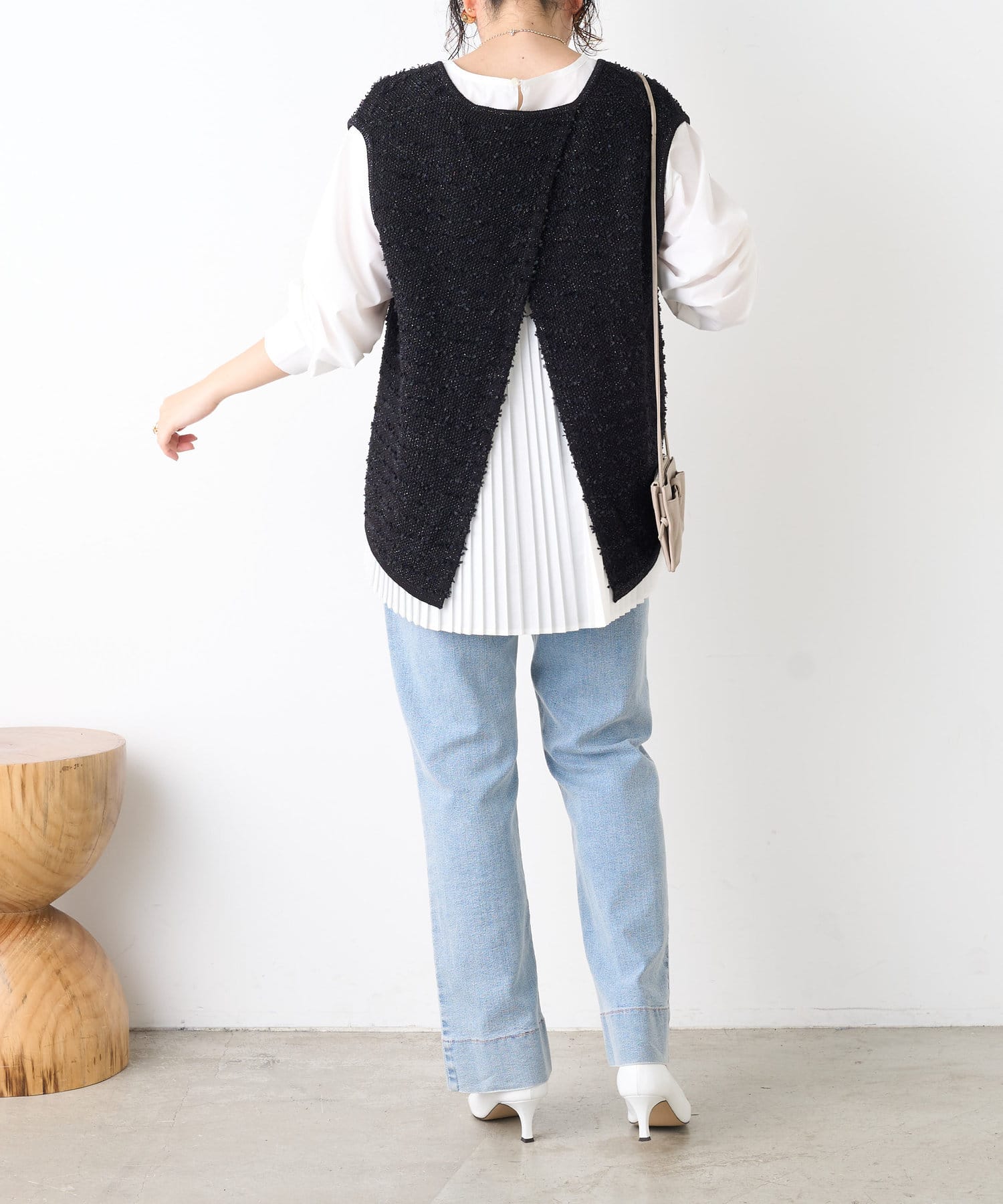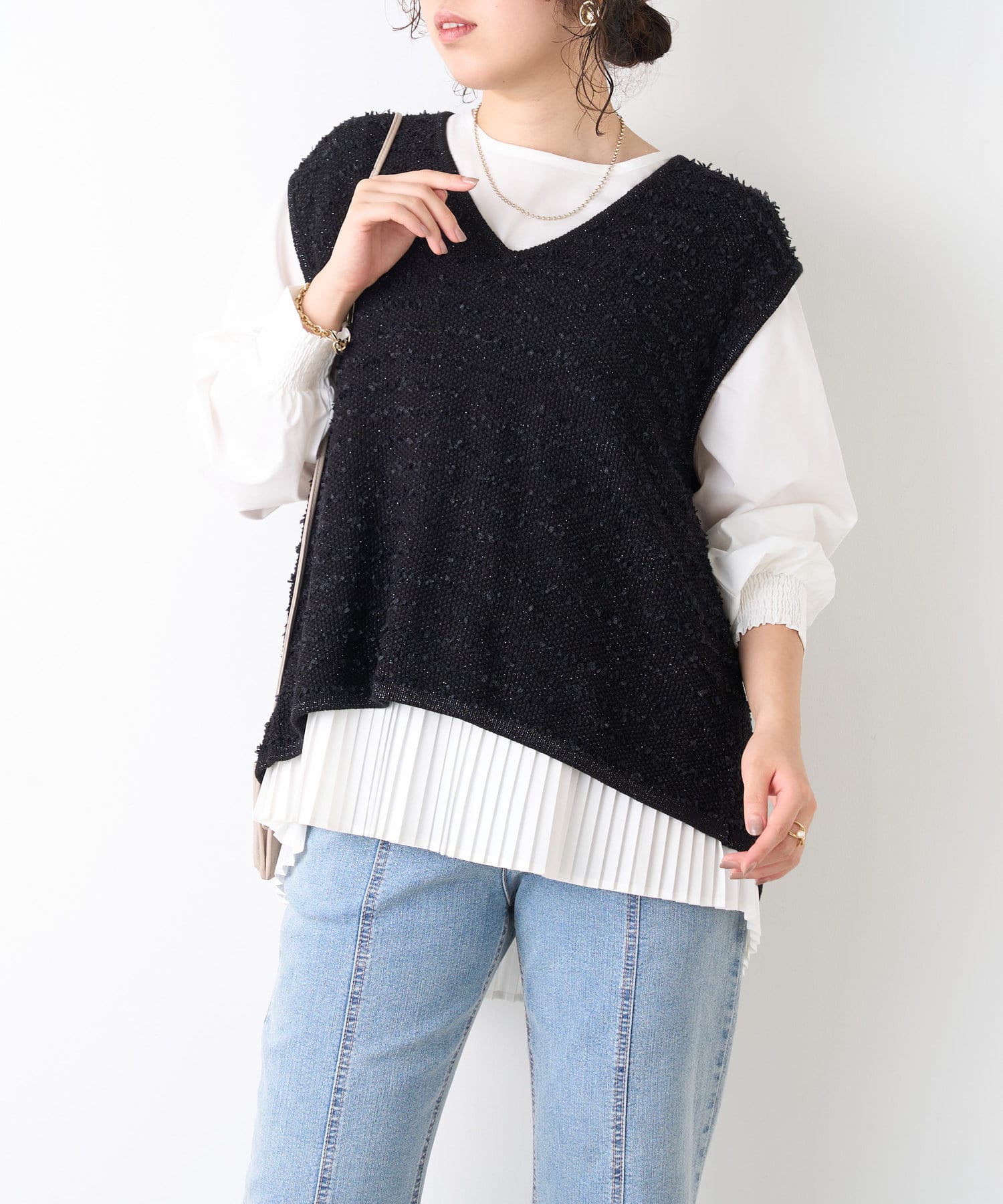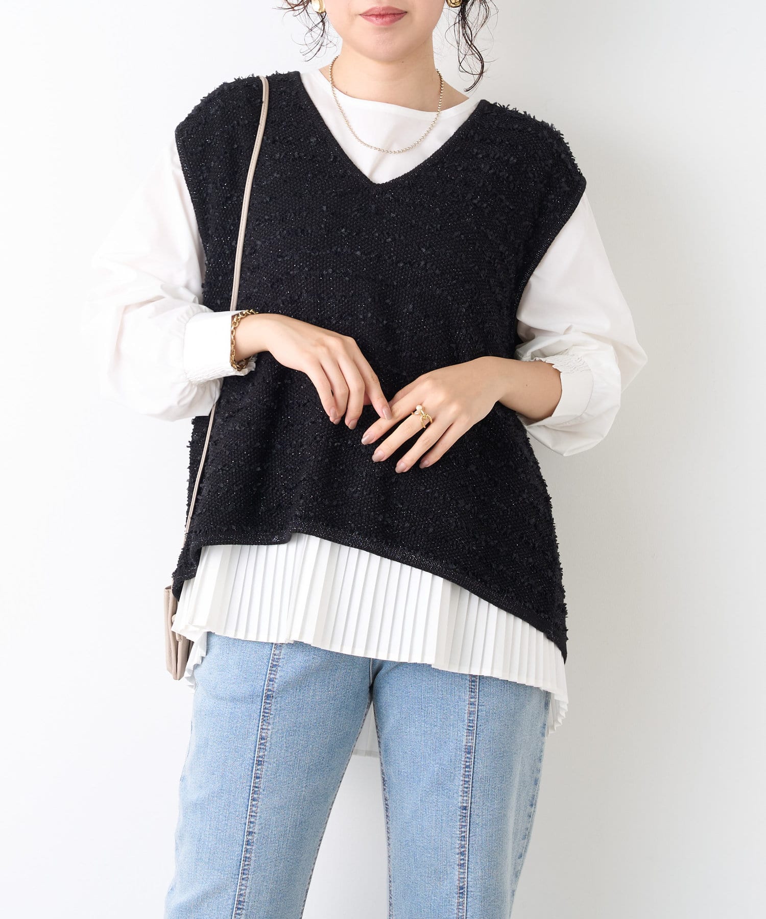 ・ベストはフリンジとラメがミックスされたデザイン。コンパクトな着丈でインナーとのバランスがとりやすい◎