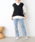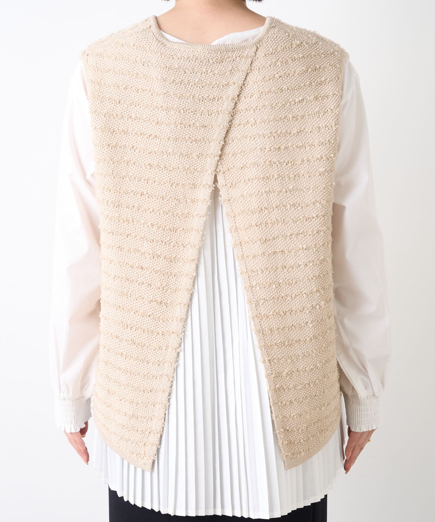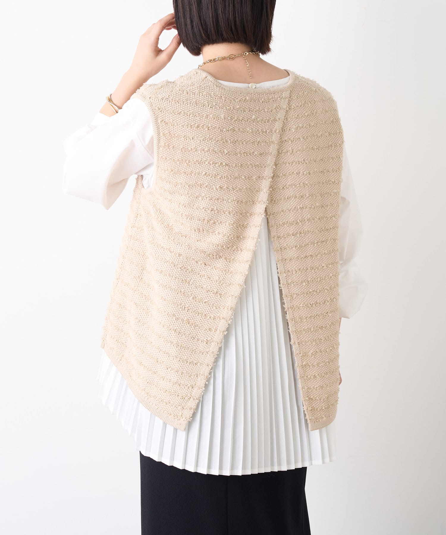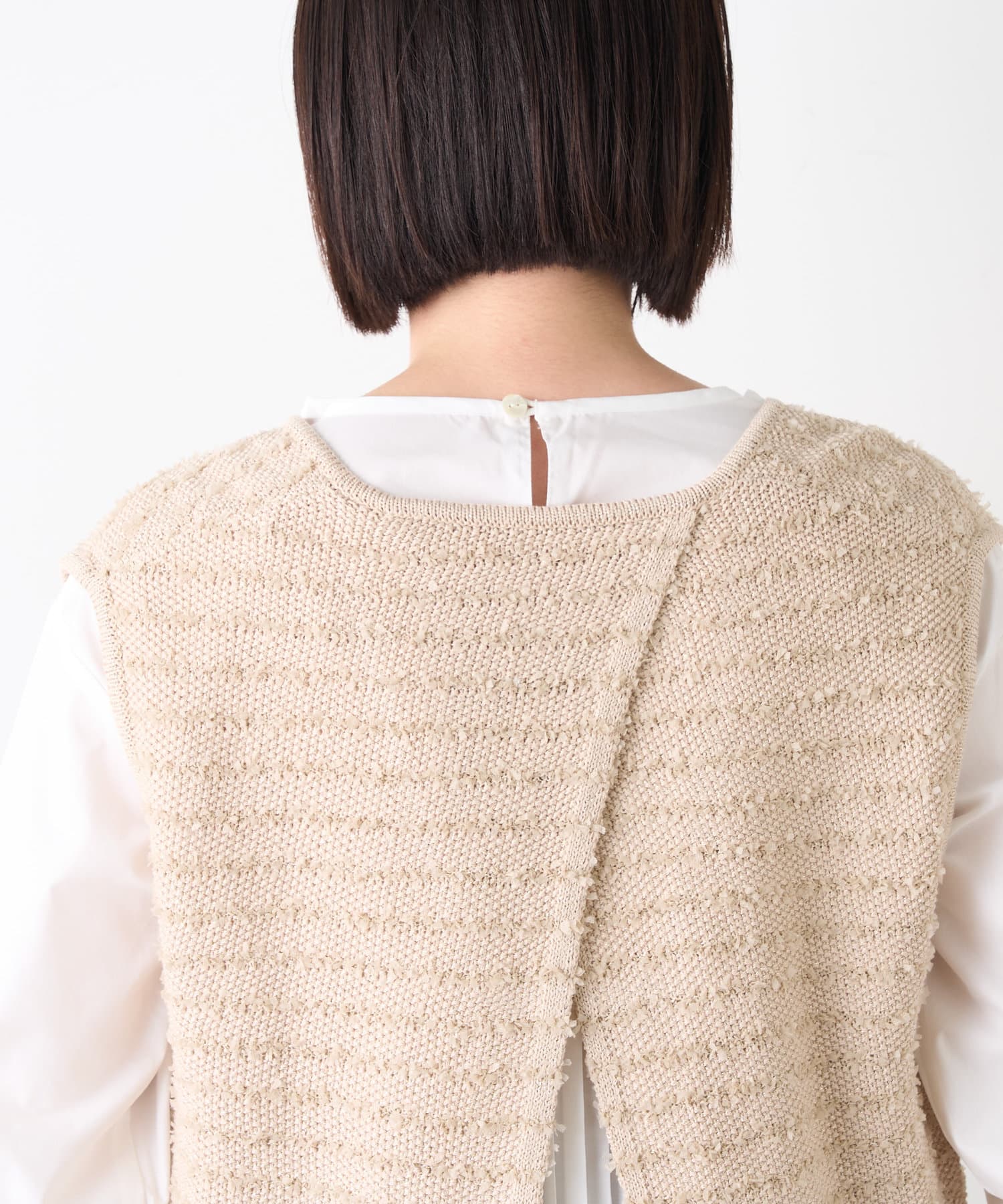 ・ベストはフリンジとラメがミックスされたデザイン。コンパクトな着丈でインナーとのバランスがとりやすい◎