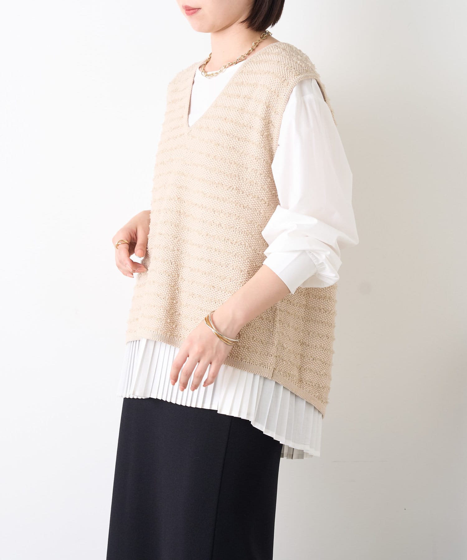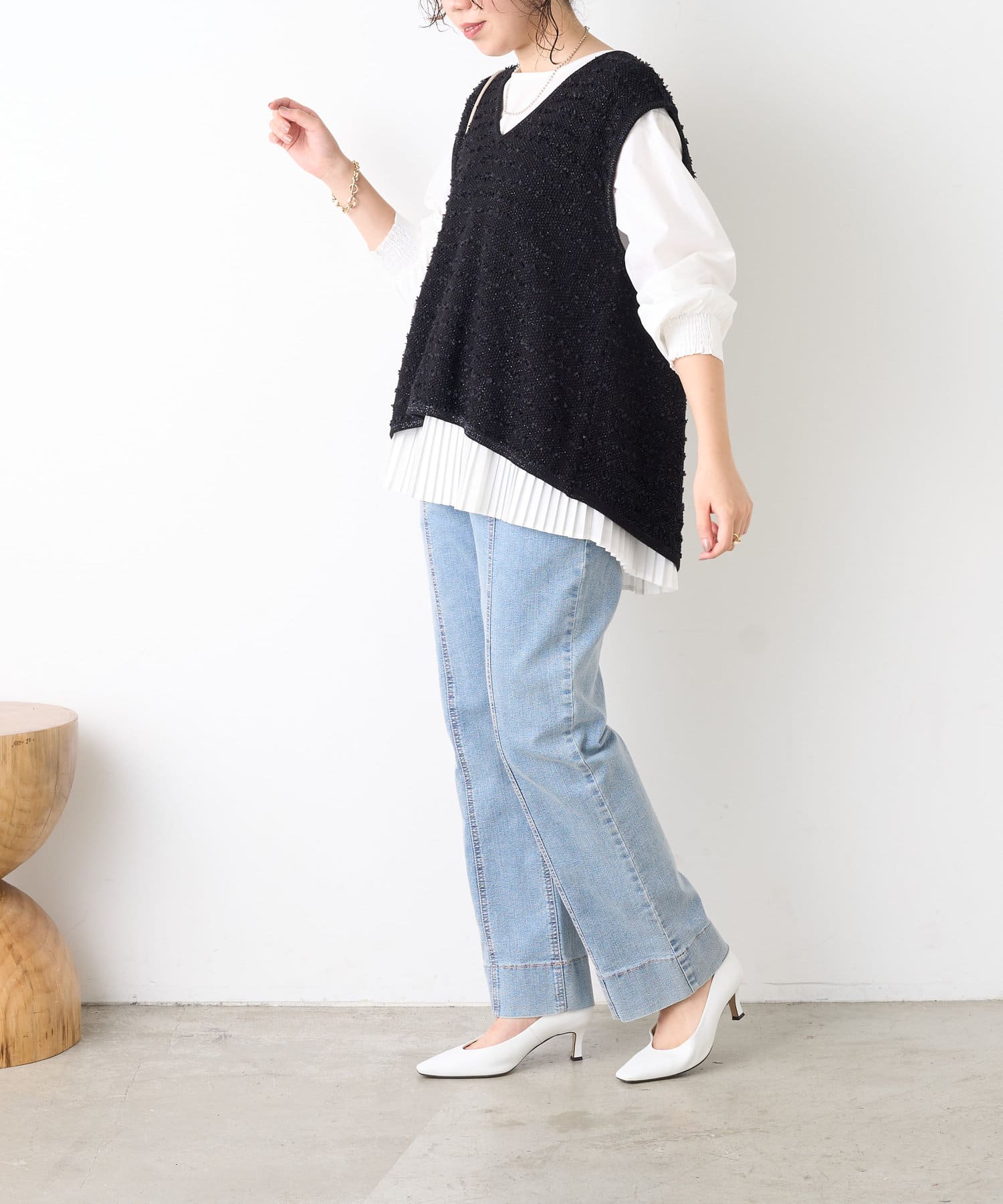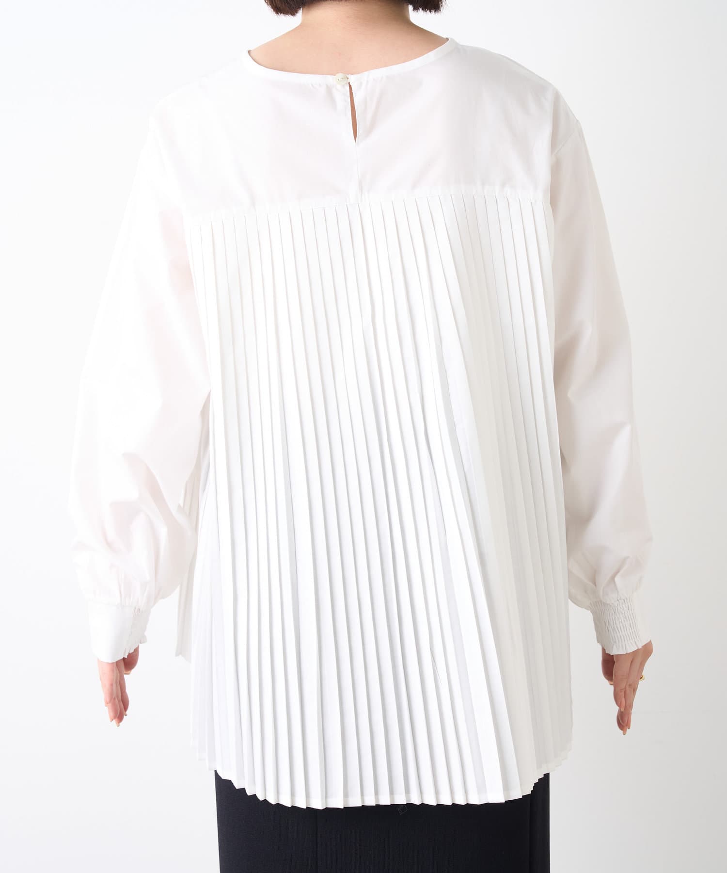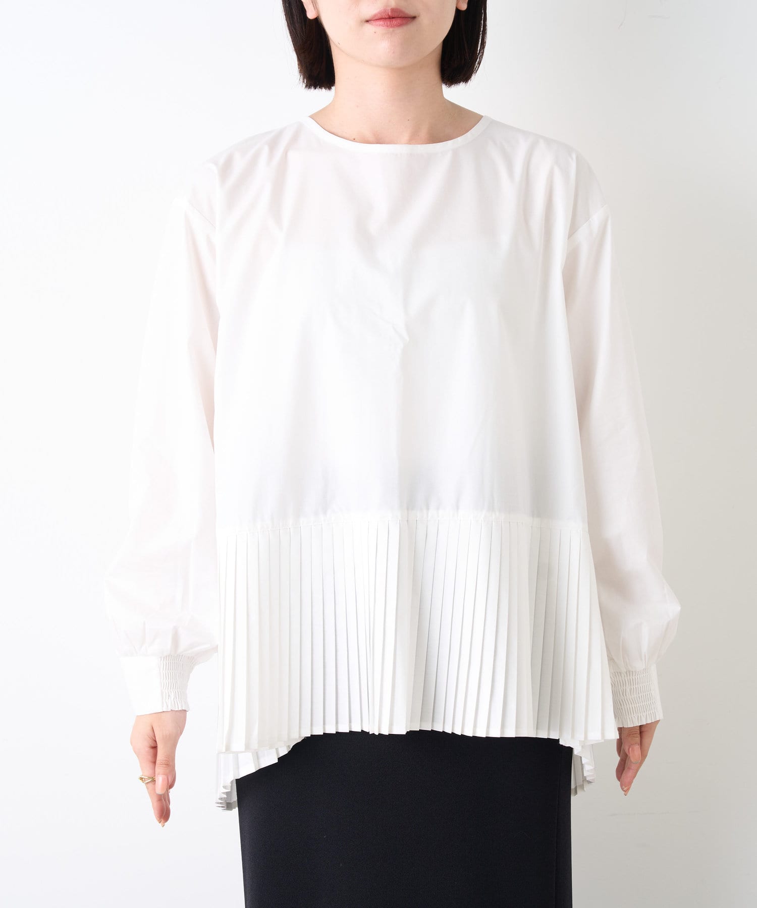 ・シャツには女性らしいプリーツデザインが施され、ベーシックながら遊び心ある一枚。