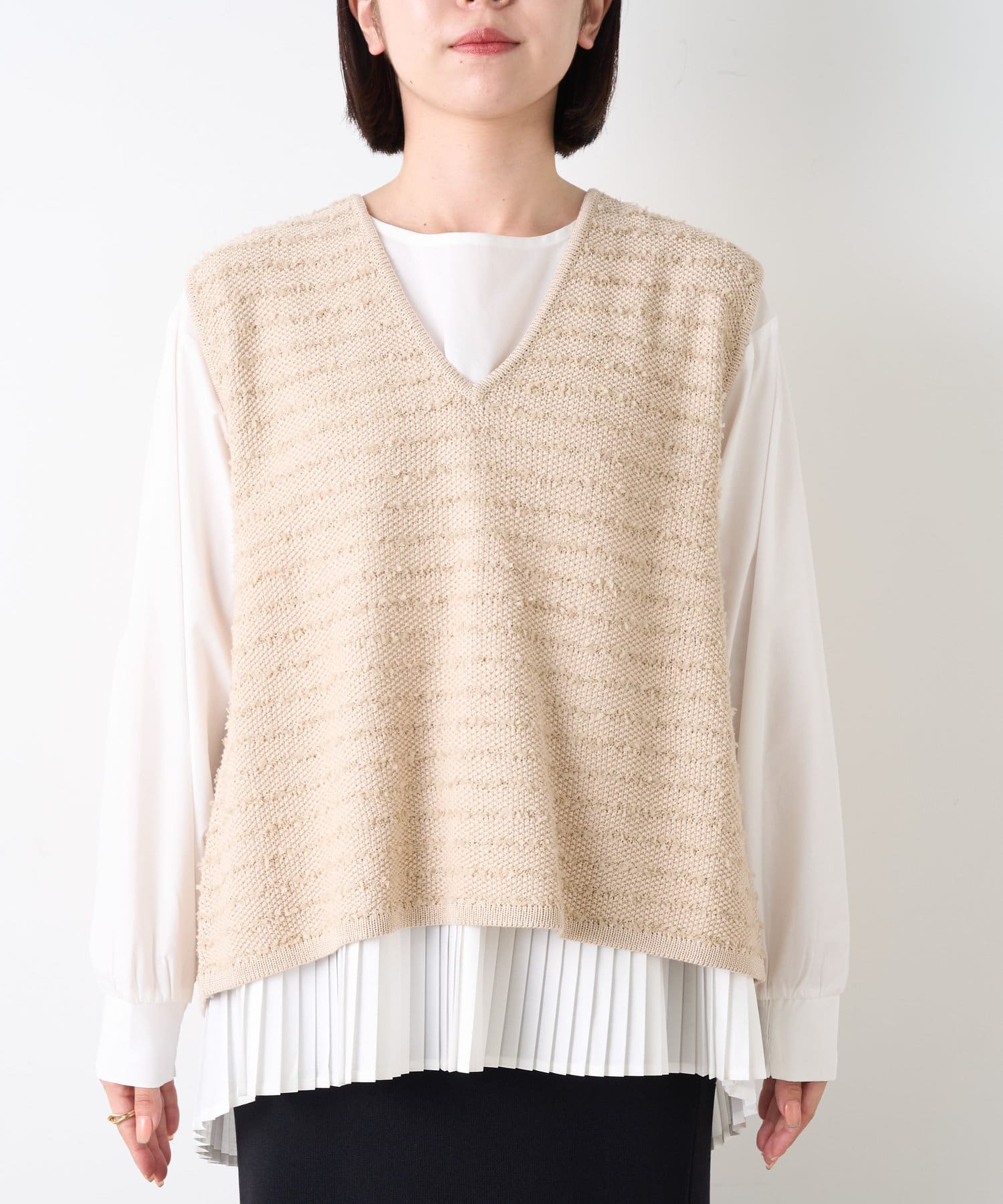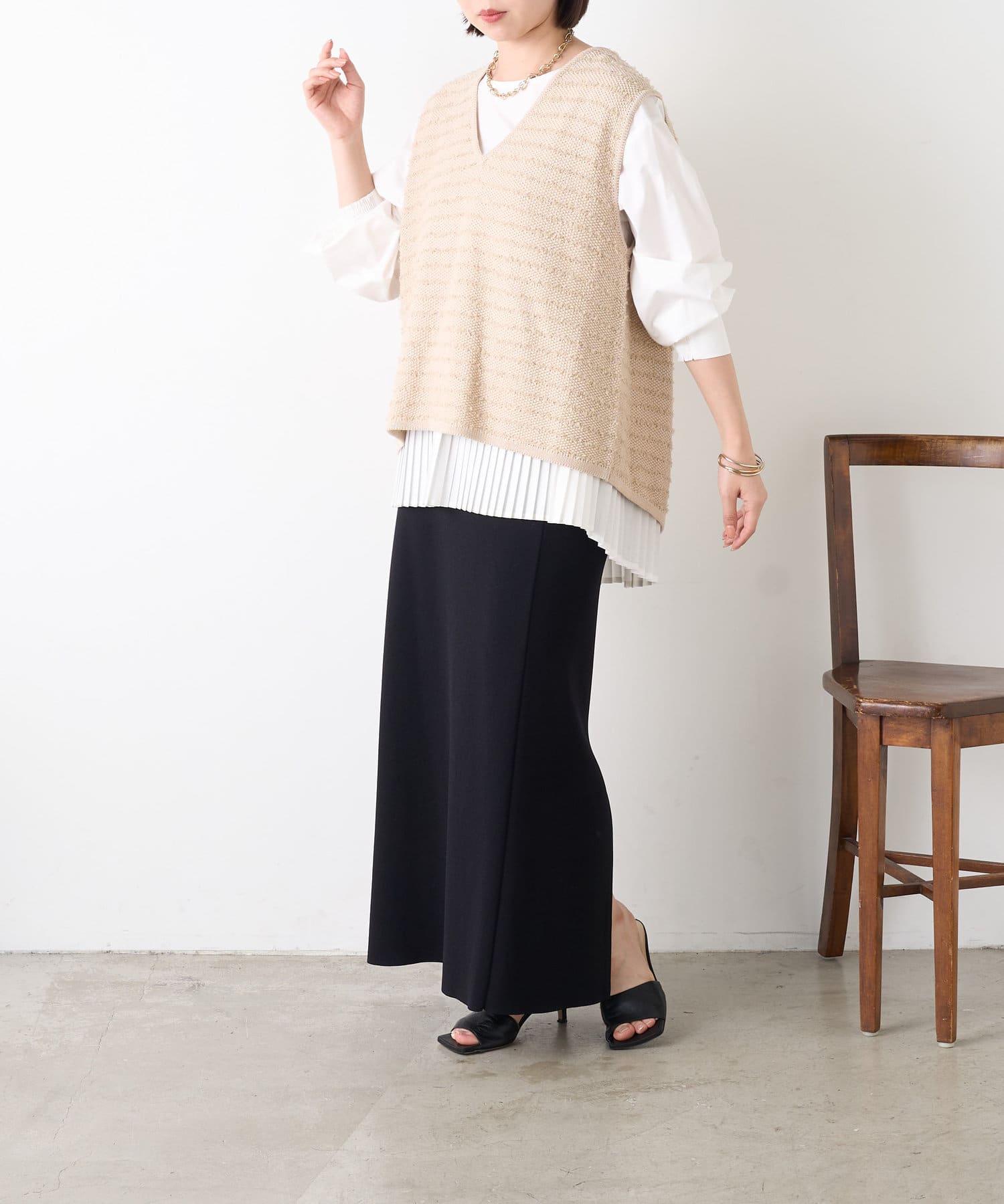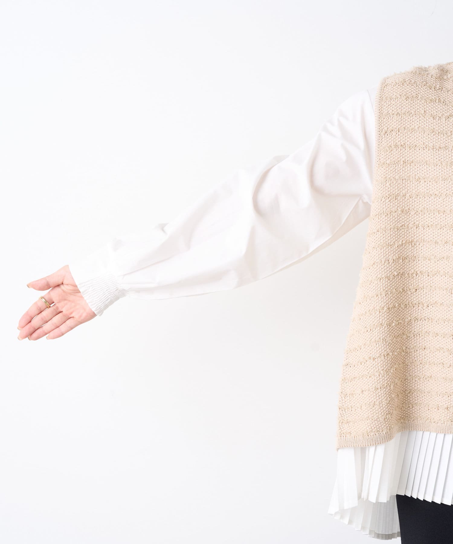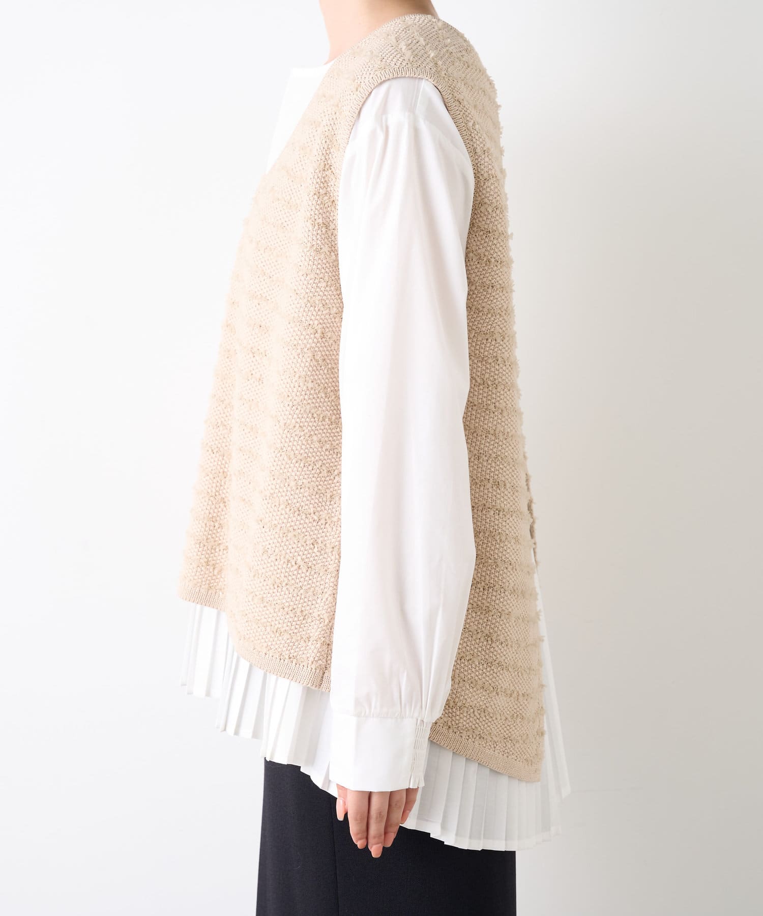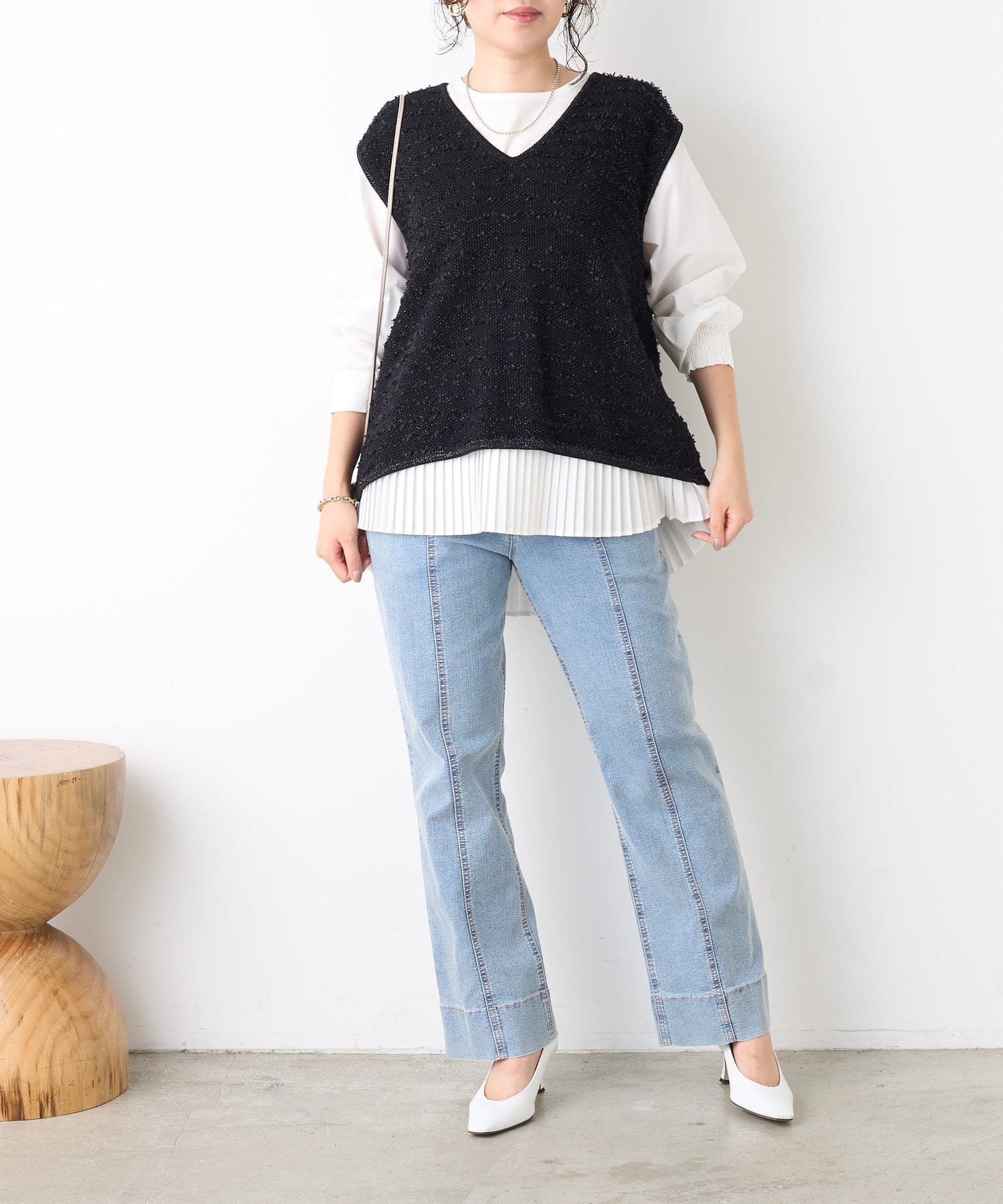 ・シャツには女性らしいプリーツデザインが施され、ベーシックながら遊び心ある一枚。