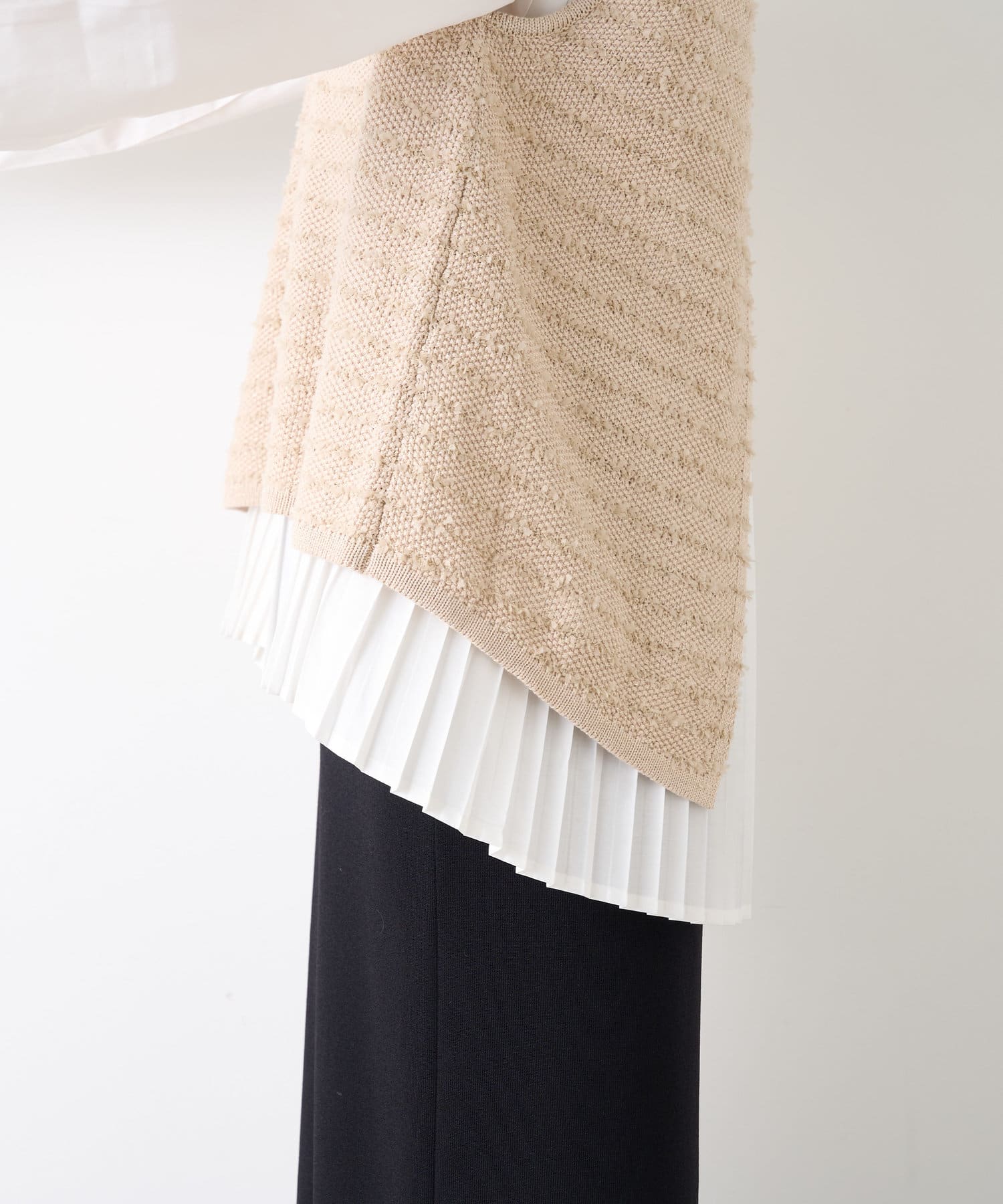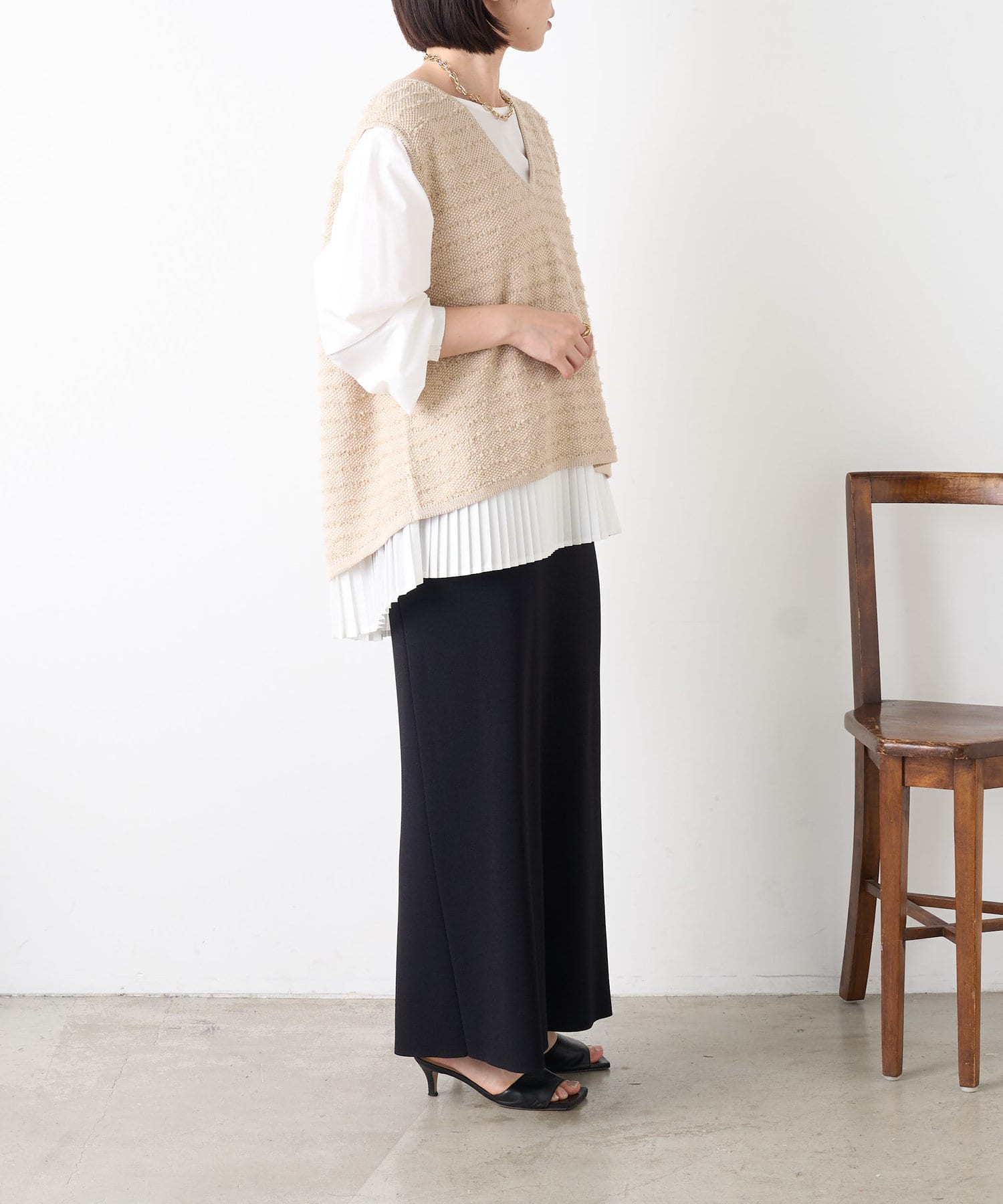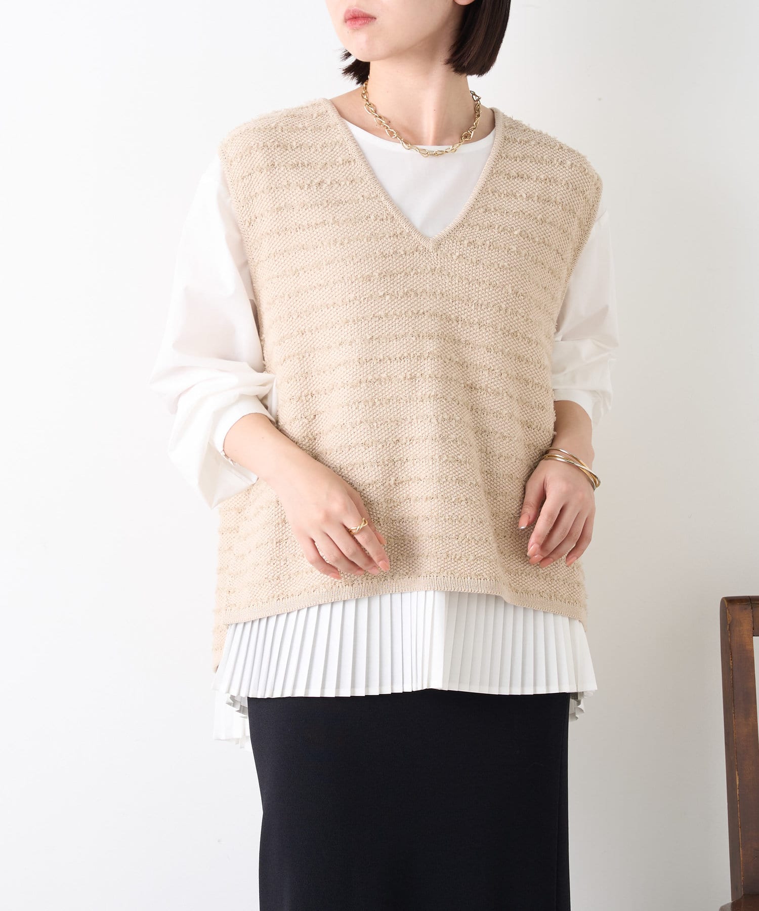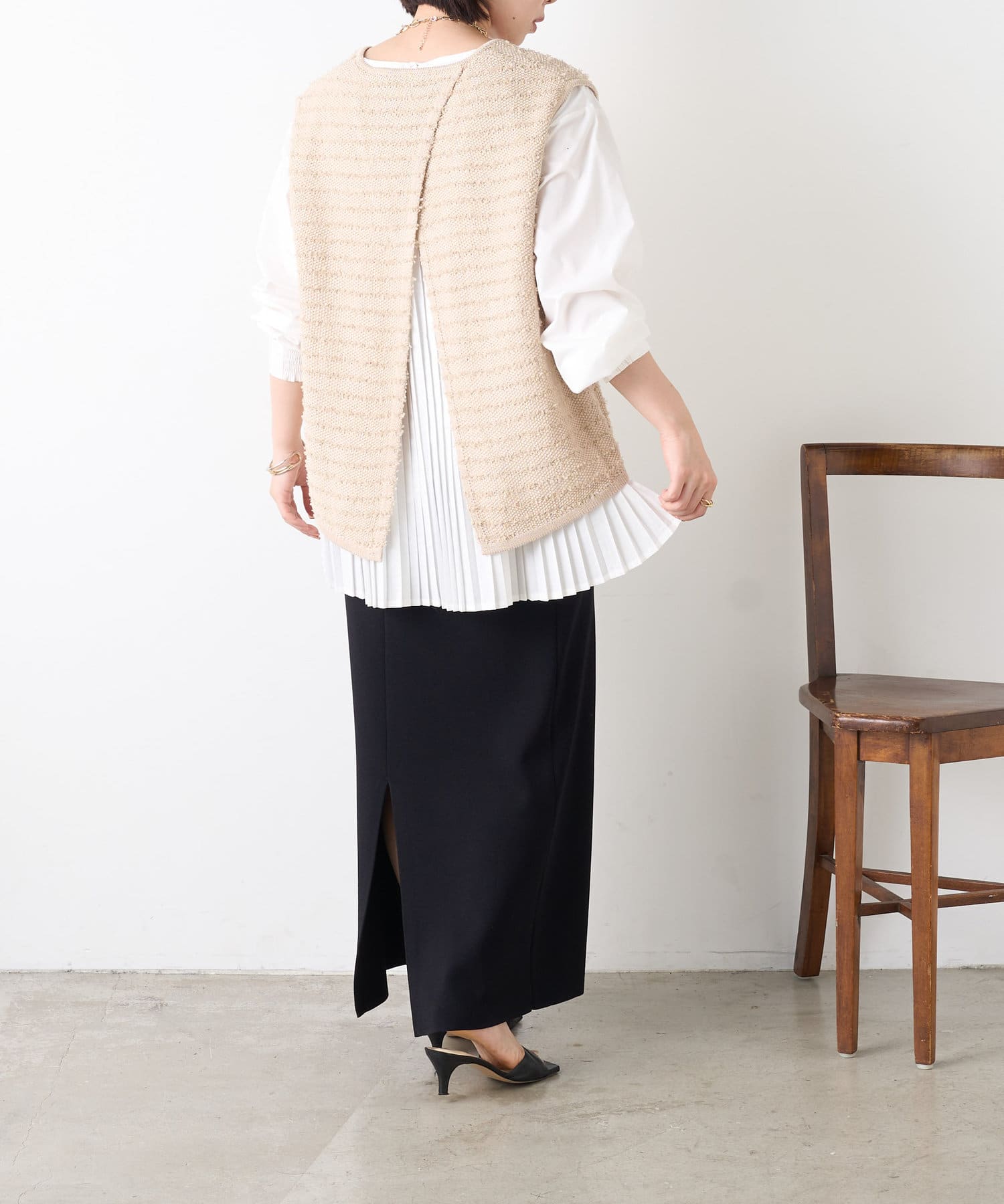 ・シャツには女性らしいプリーツデザインが施され、ベーシックながら遊び心ある一枚。