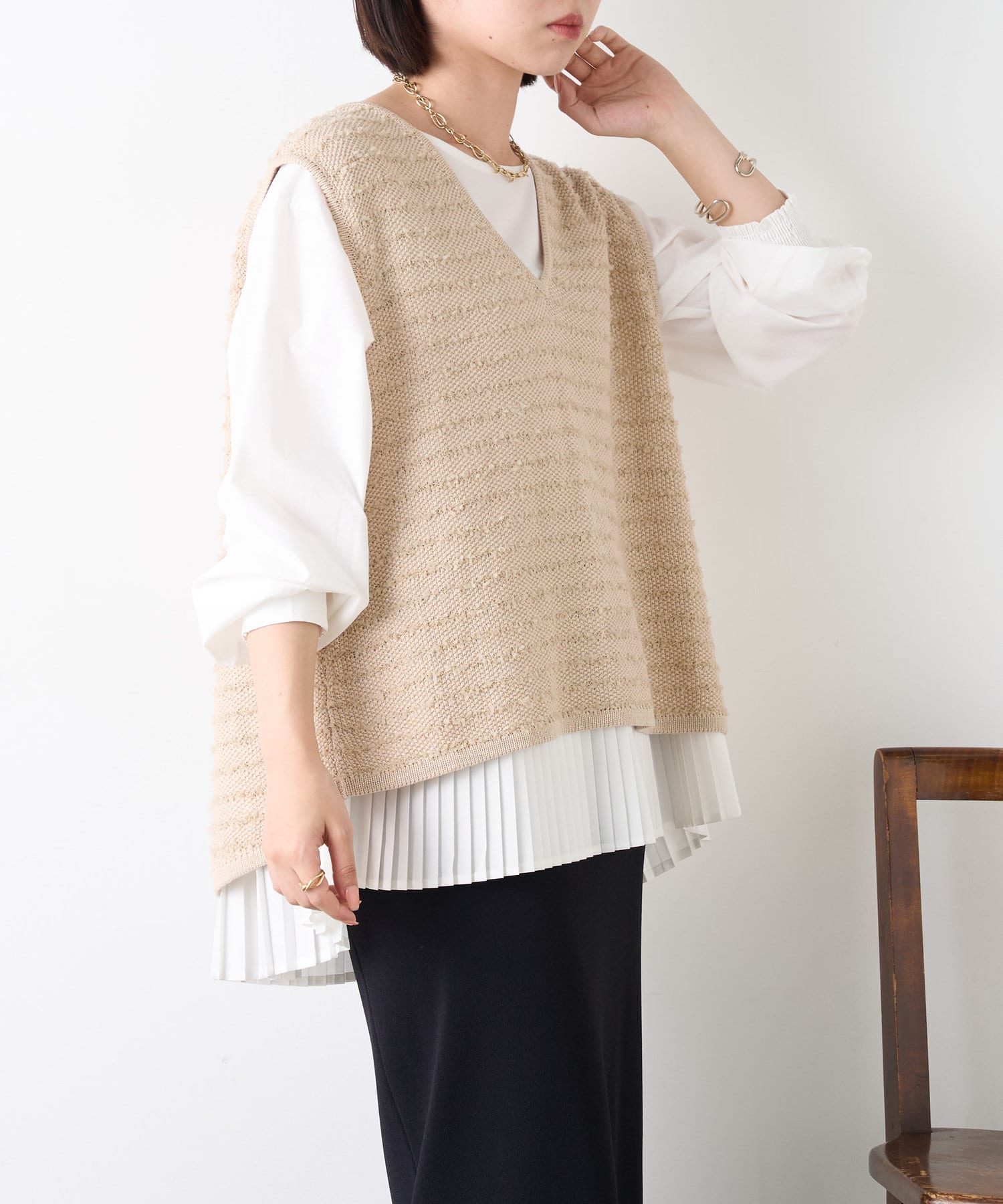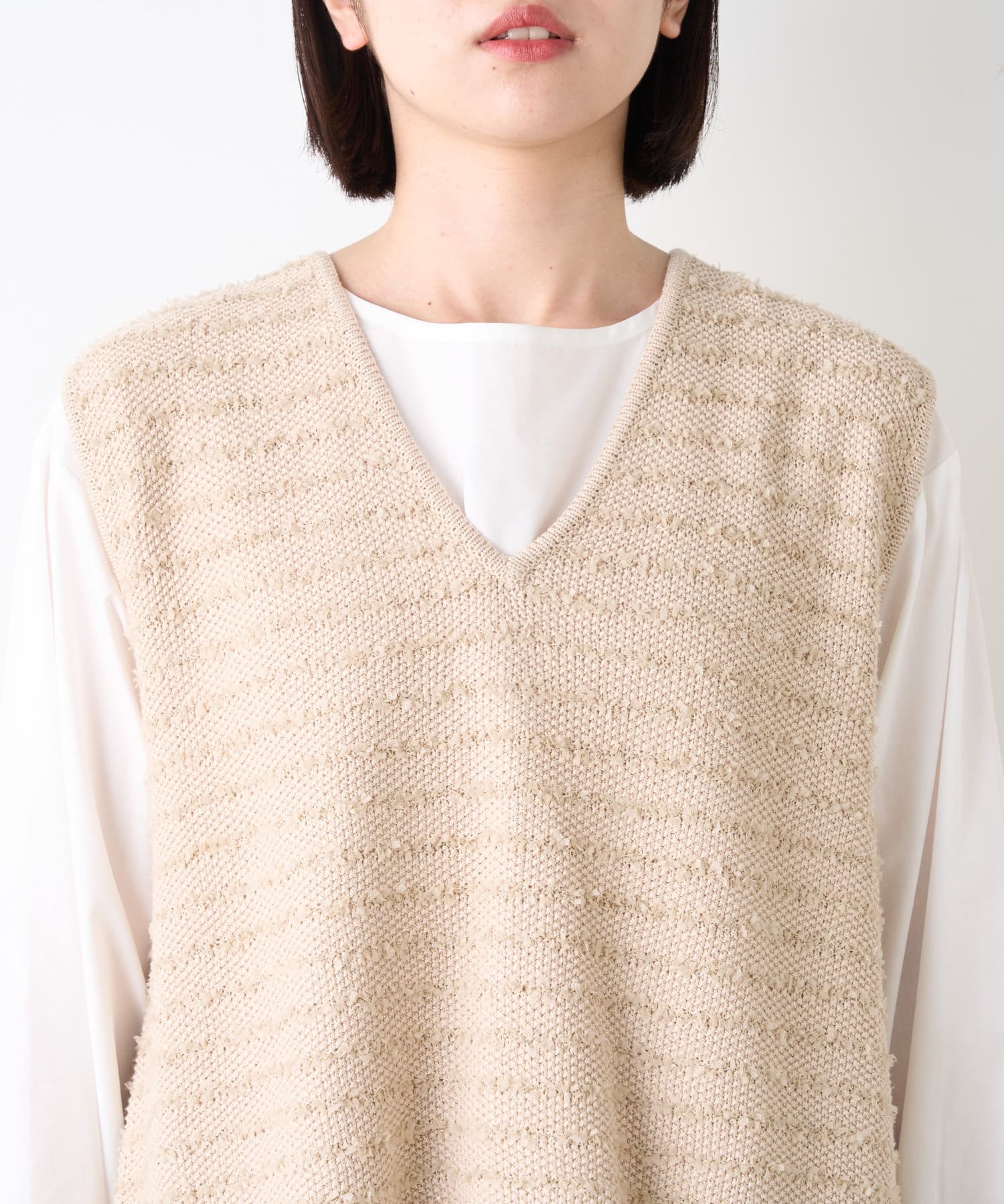 ・ベーシックなノーカラーシャツ×ニットベストのセットアイテムが登場。
