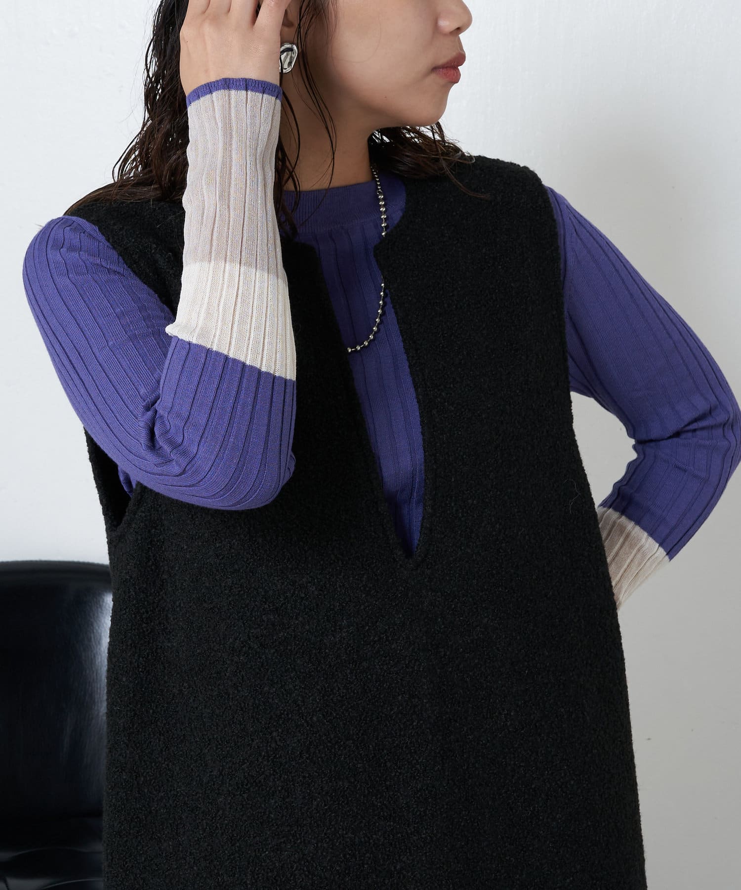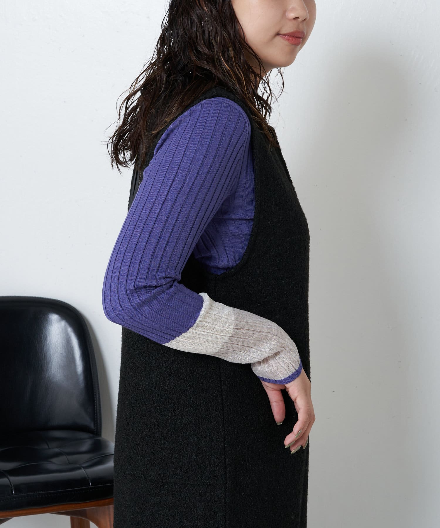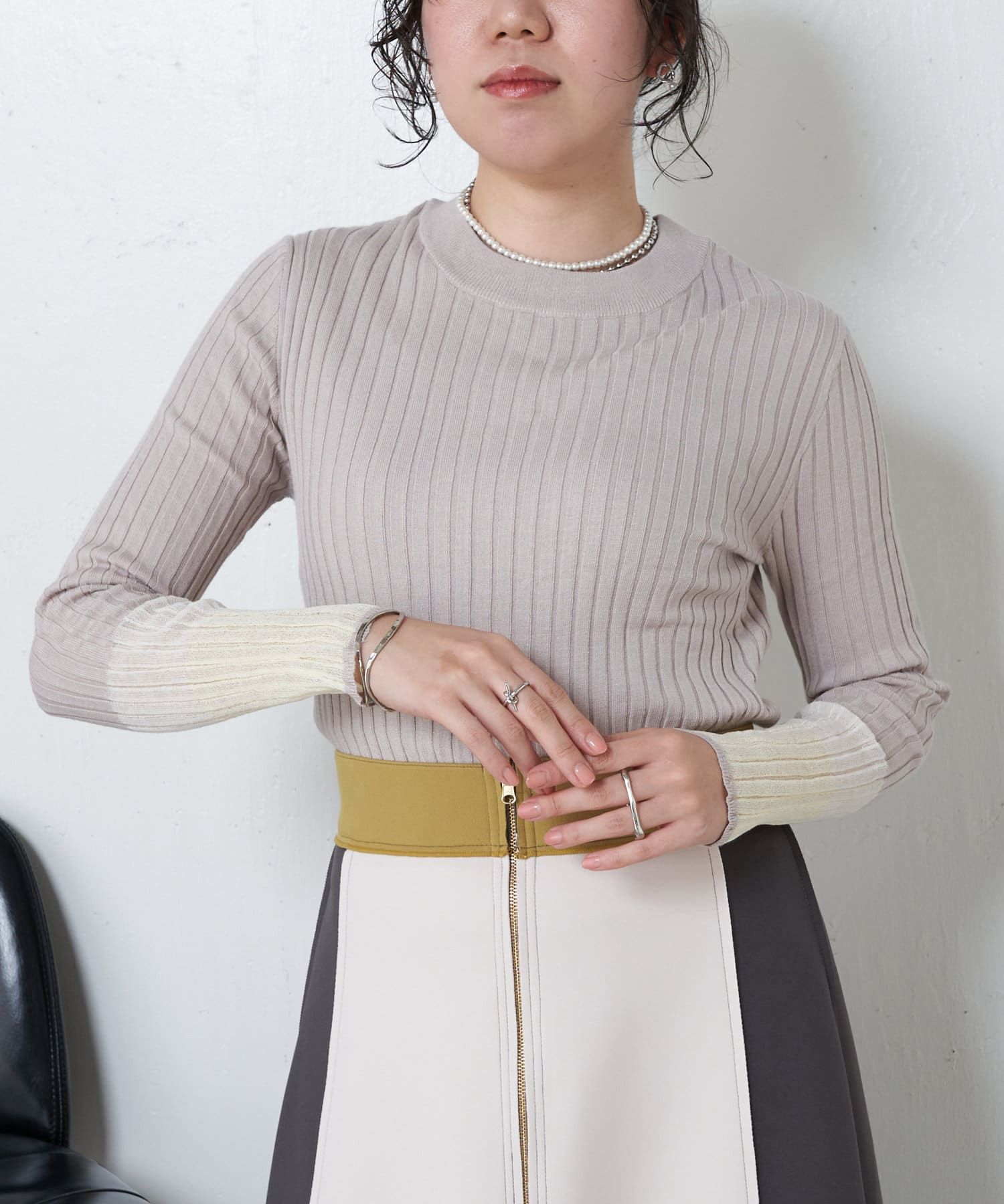 3配色袖シアーニット