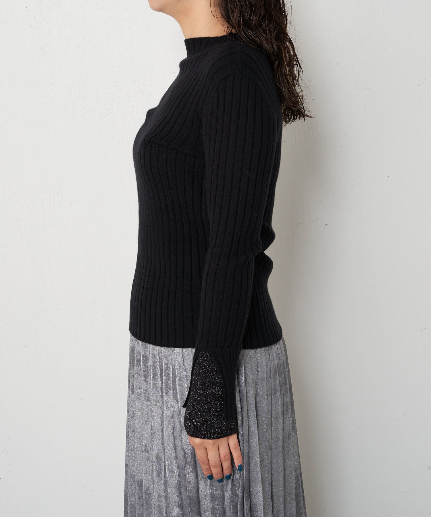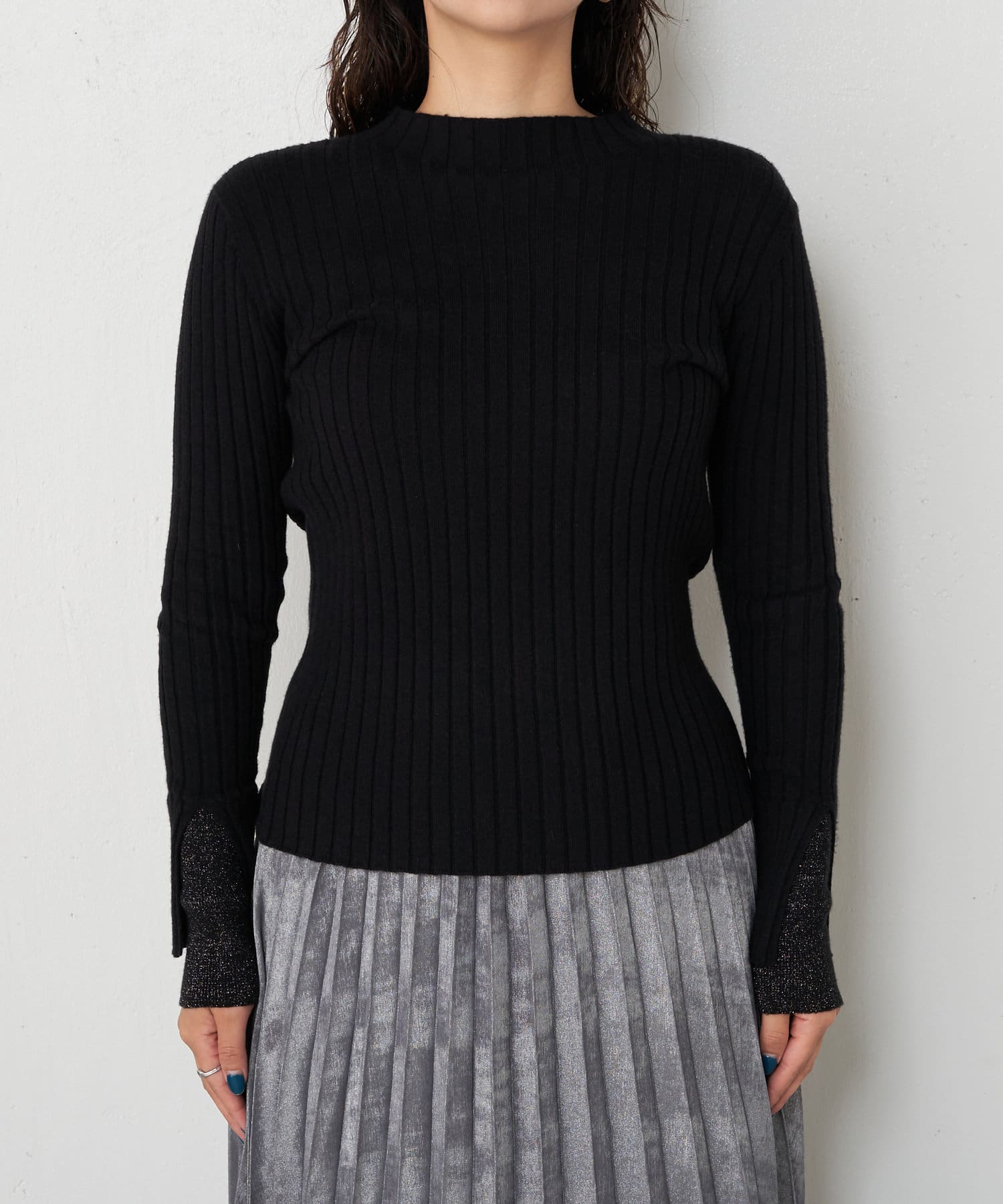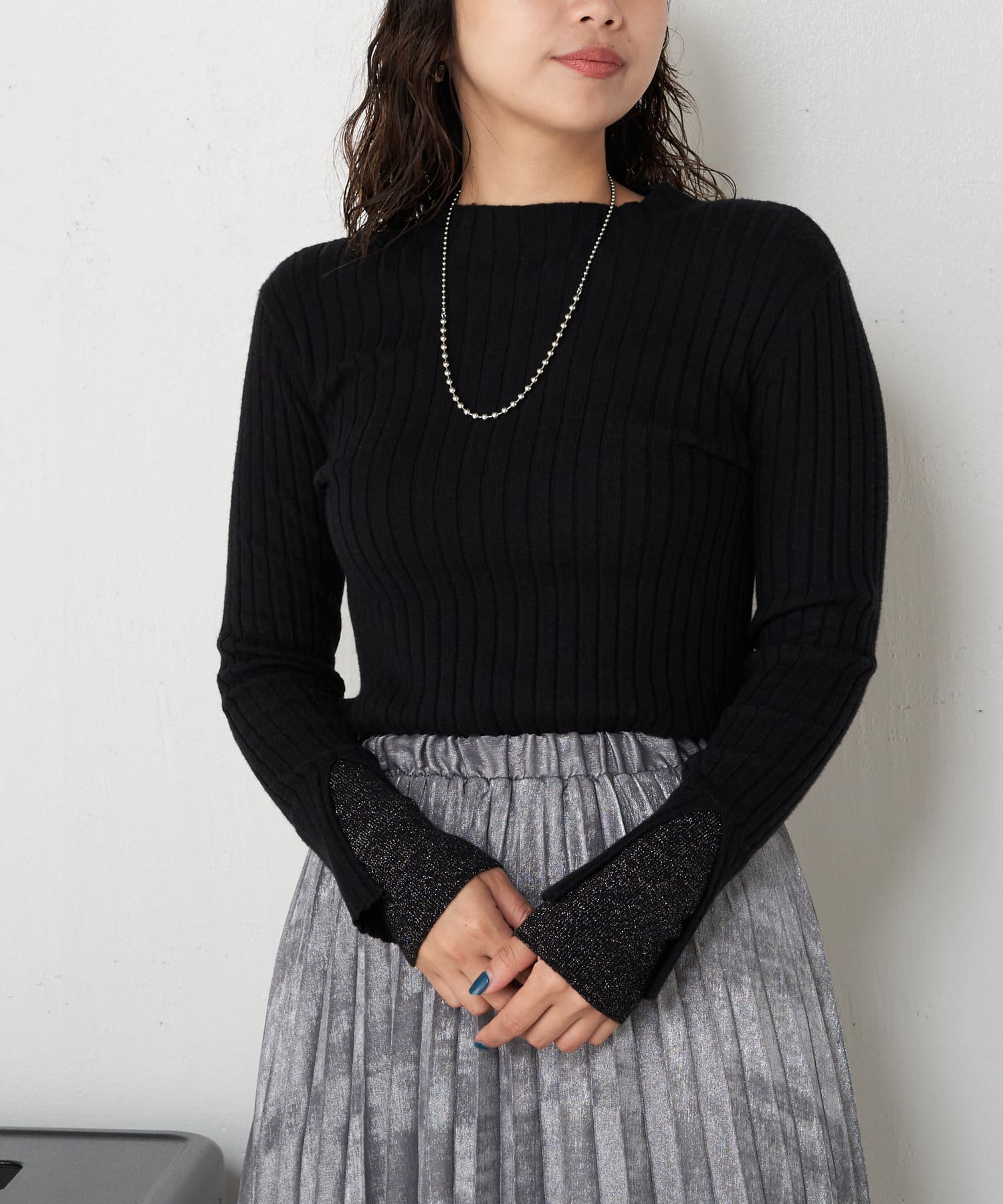 袖口レイヤードラメリブニット