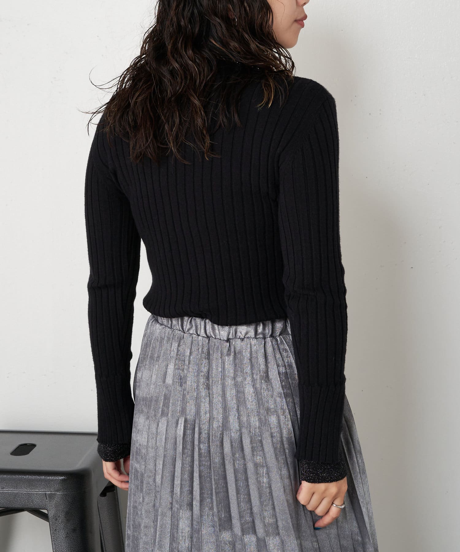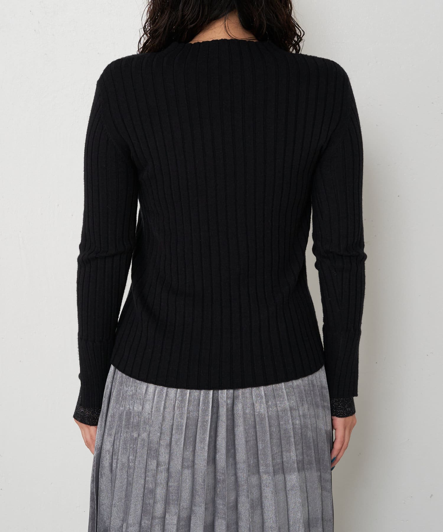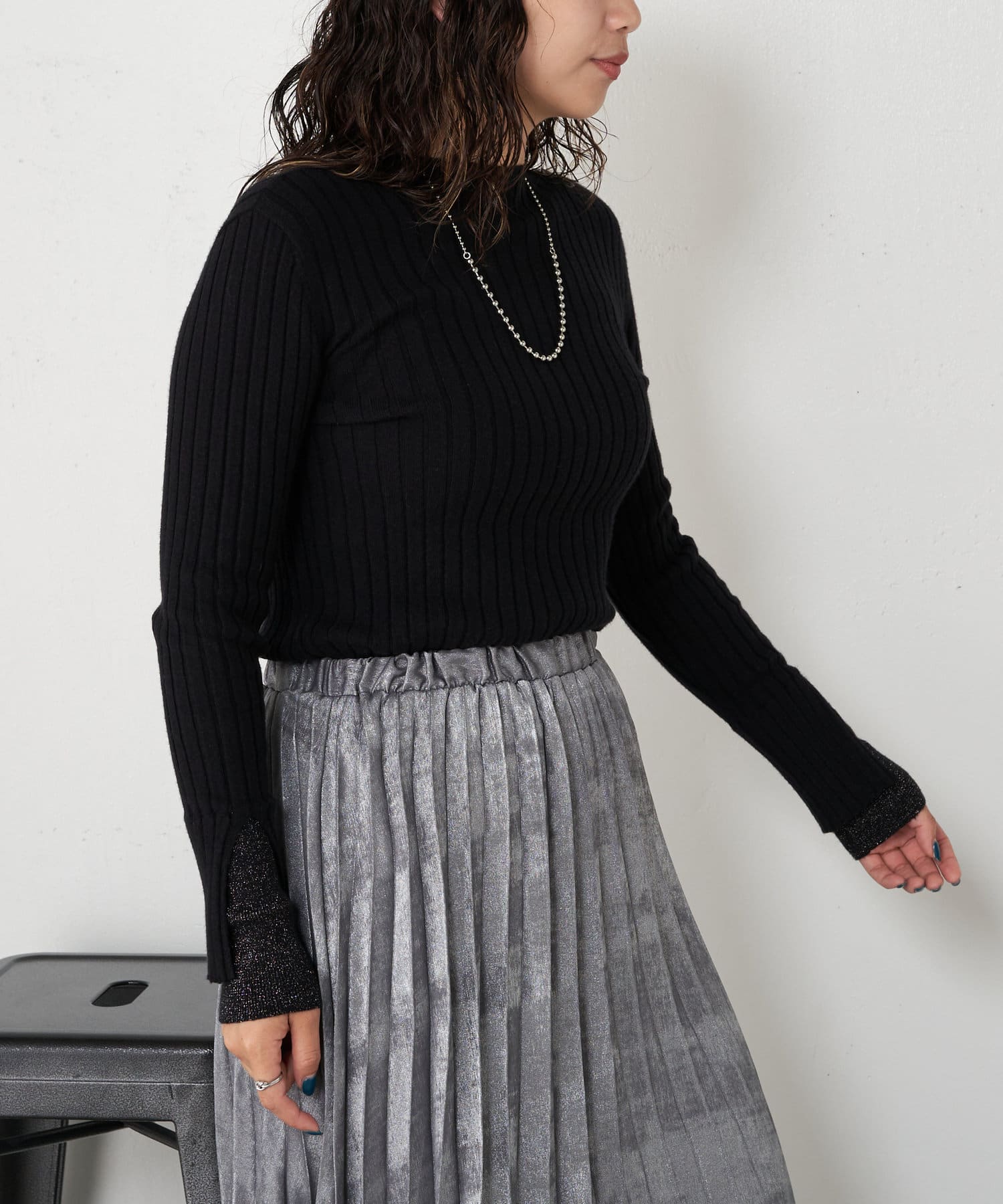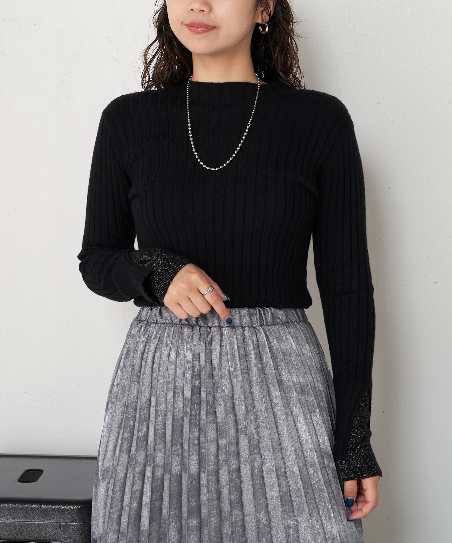 袖口レイヤードラメリブニット