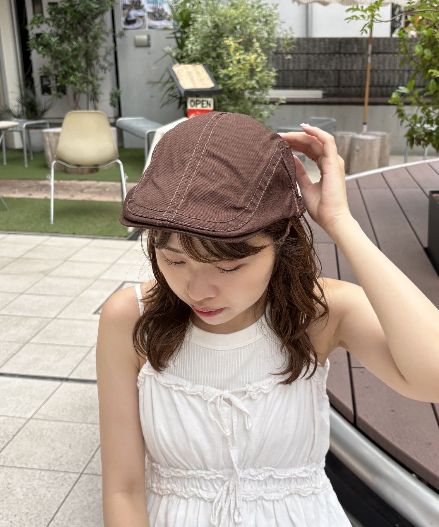今季トレンドのハンチングキャップ。