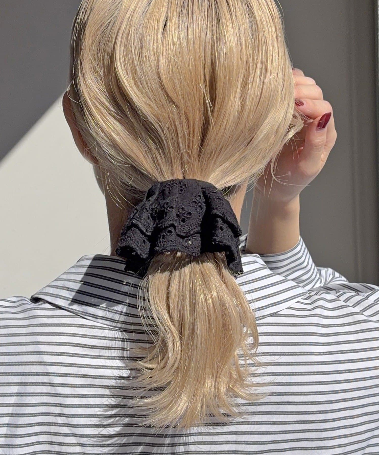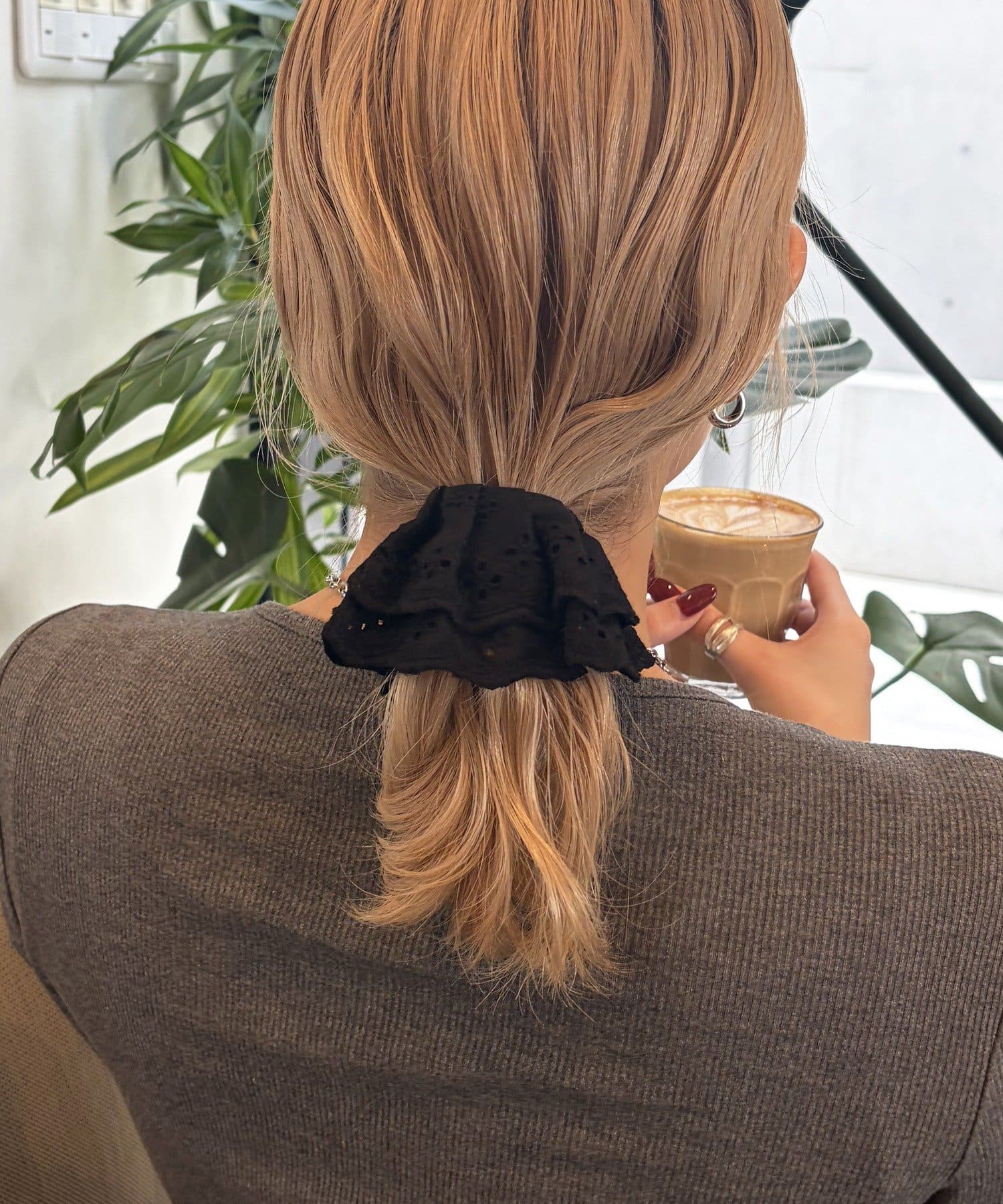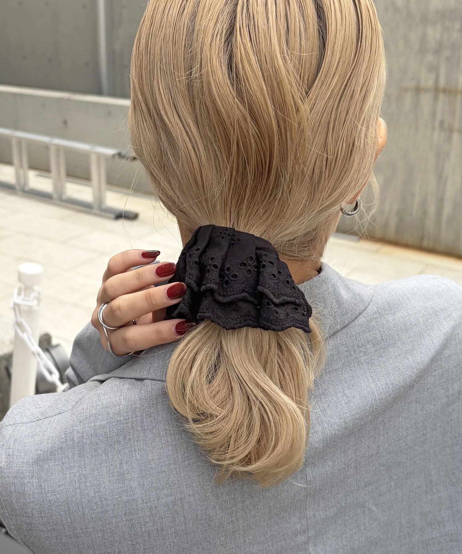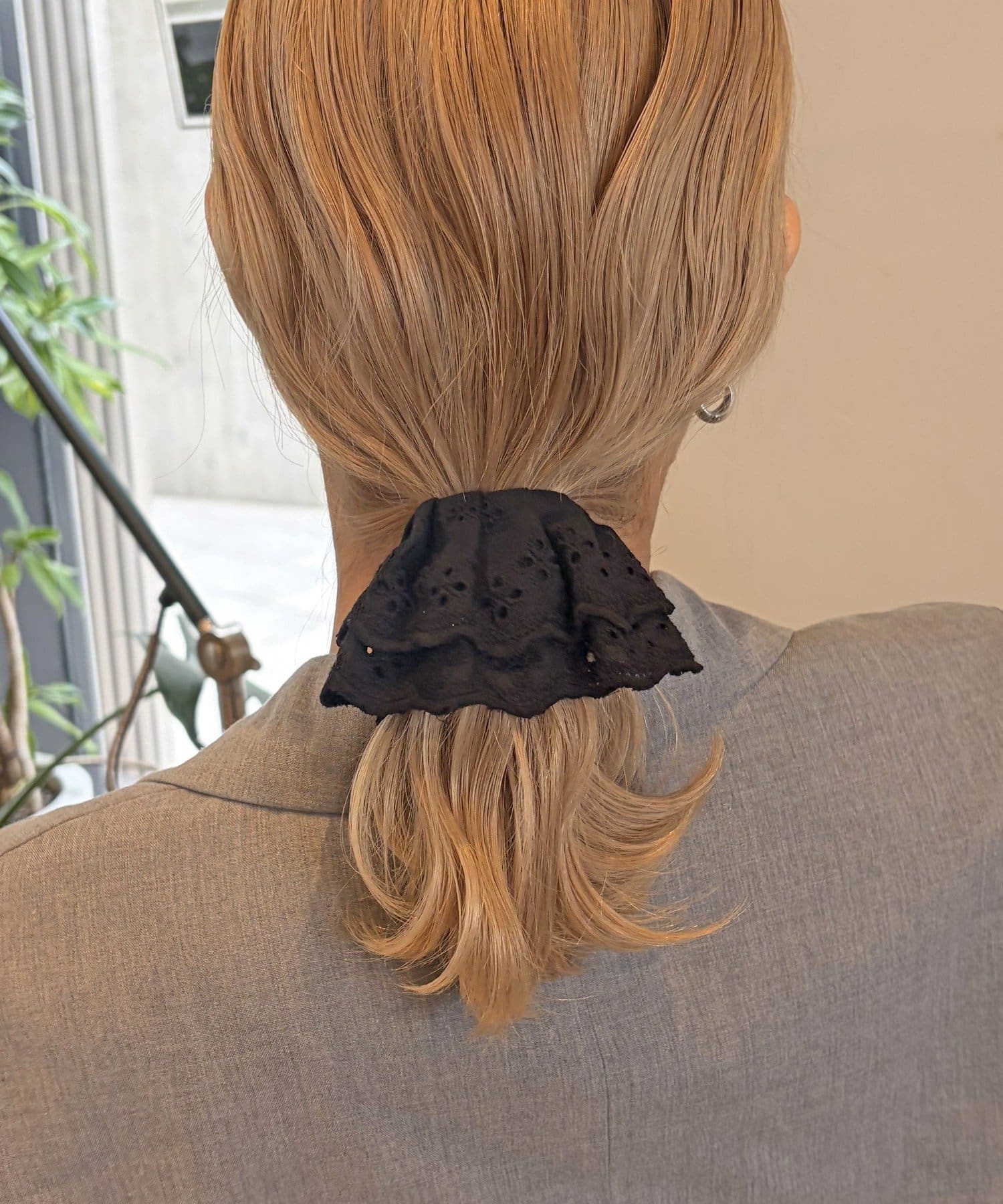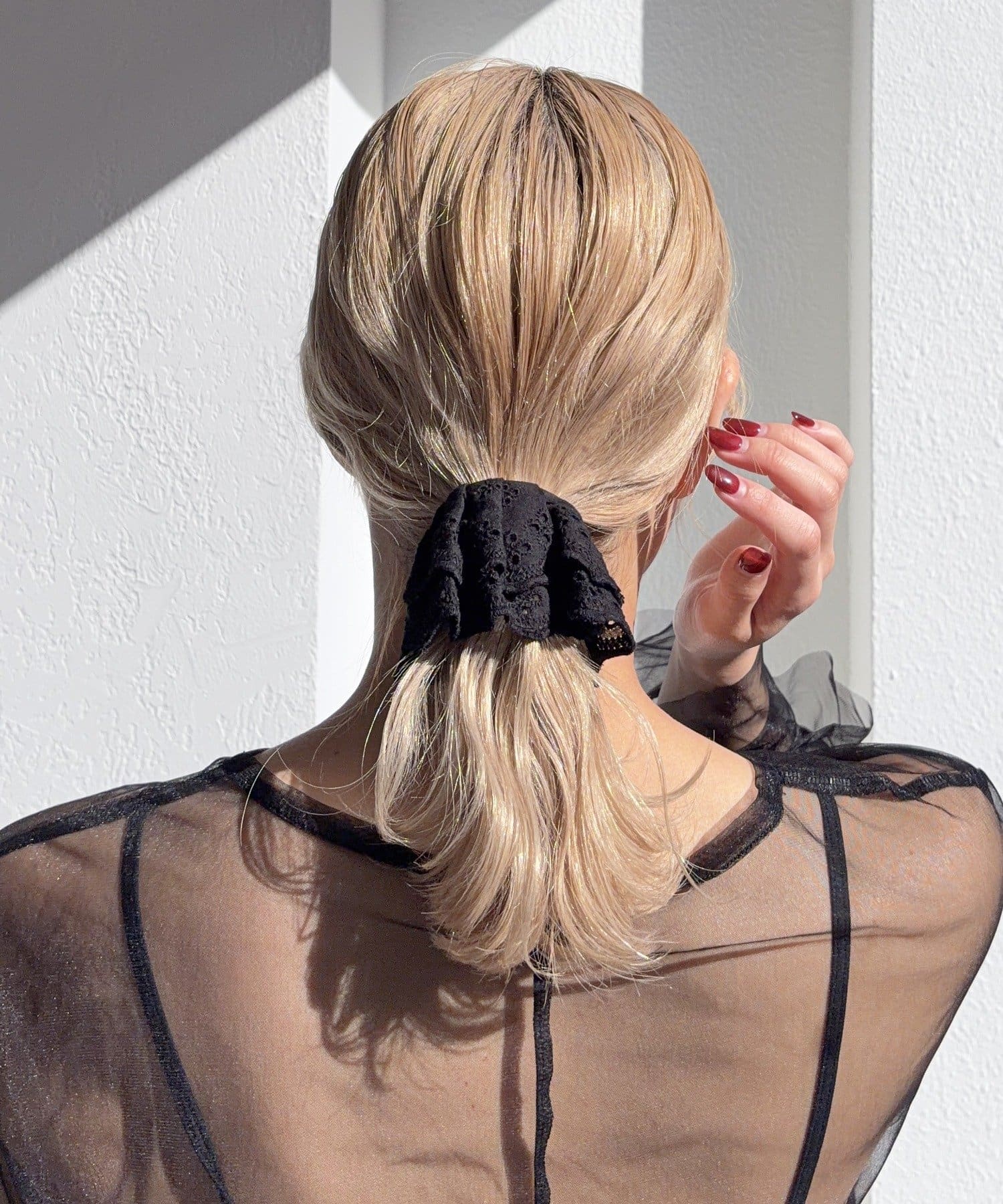 〇ゴムで結んだ髪にフックを引っ掛けるだけで手軽にアレンジが完成