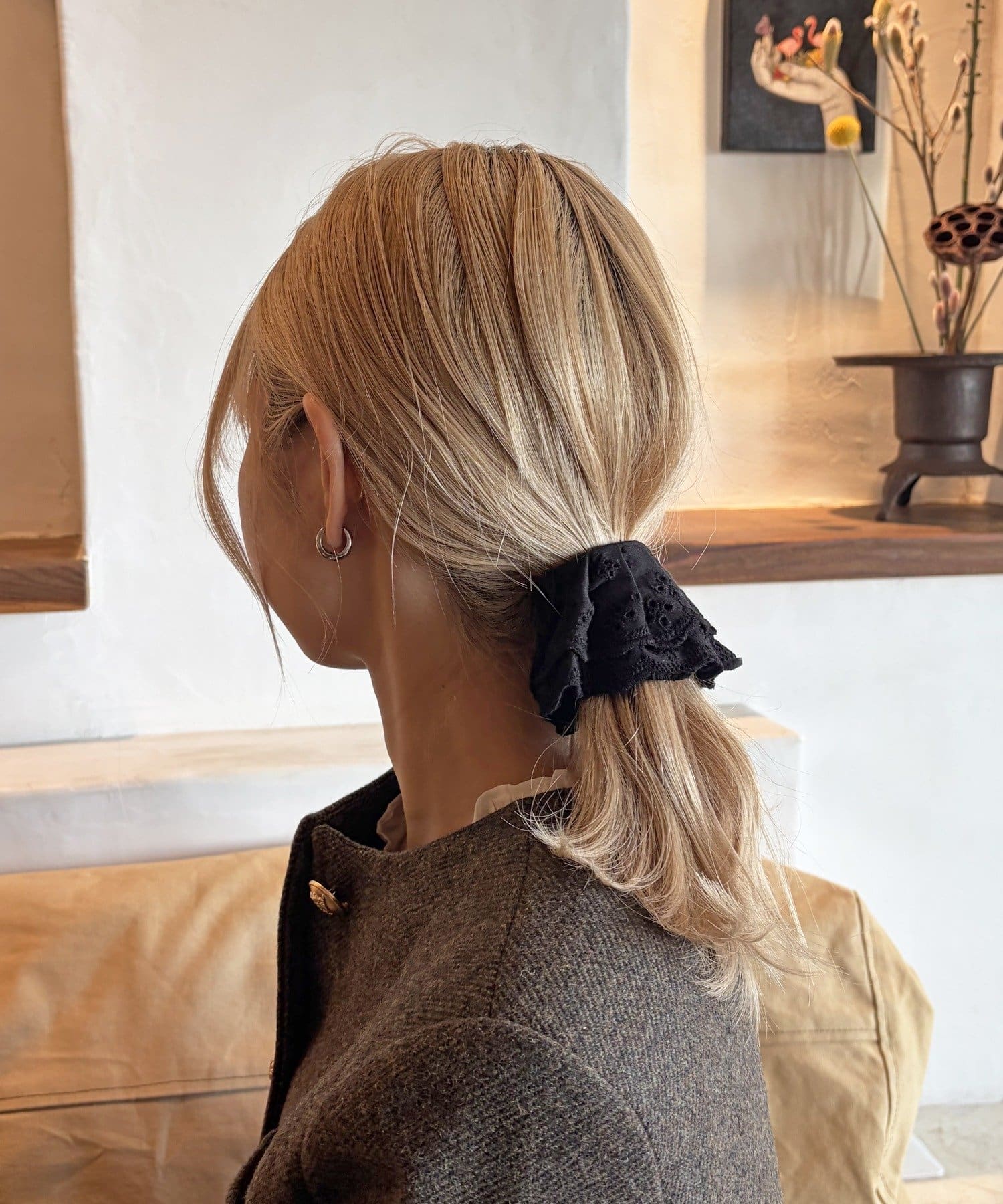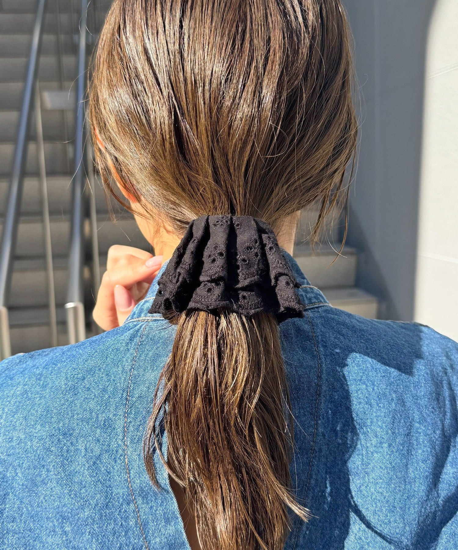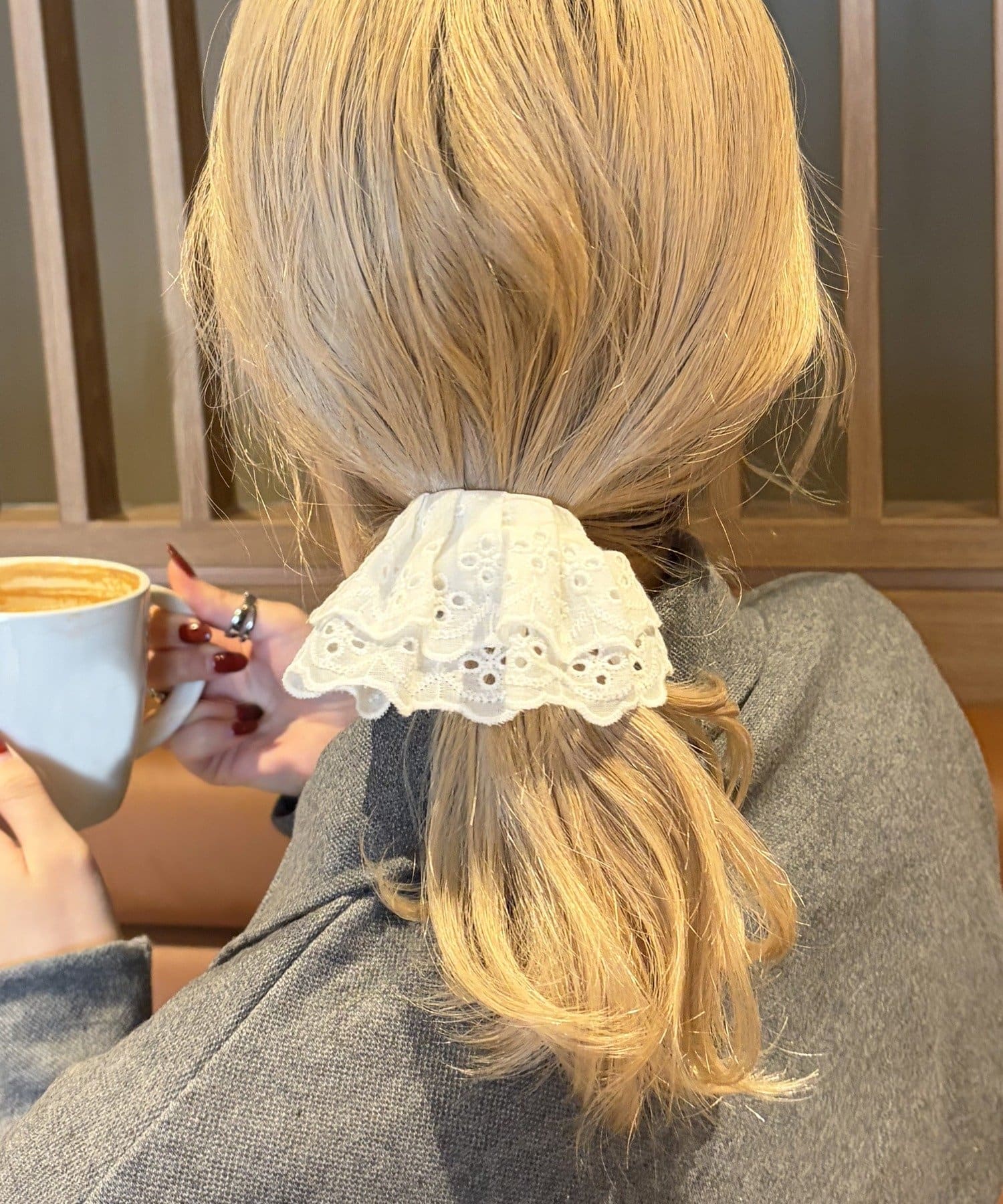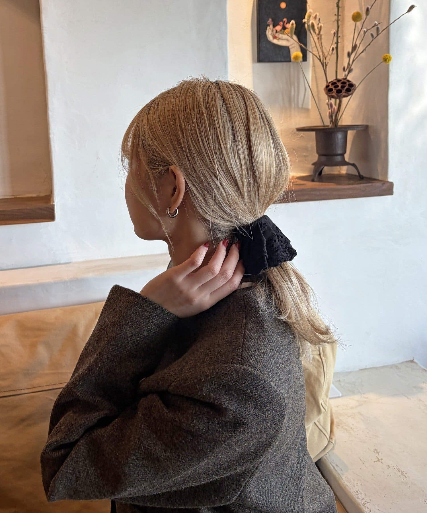 〇ゴムで結んだ髪にフックを引っ掛けるだけで手軽にアレンジが完成