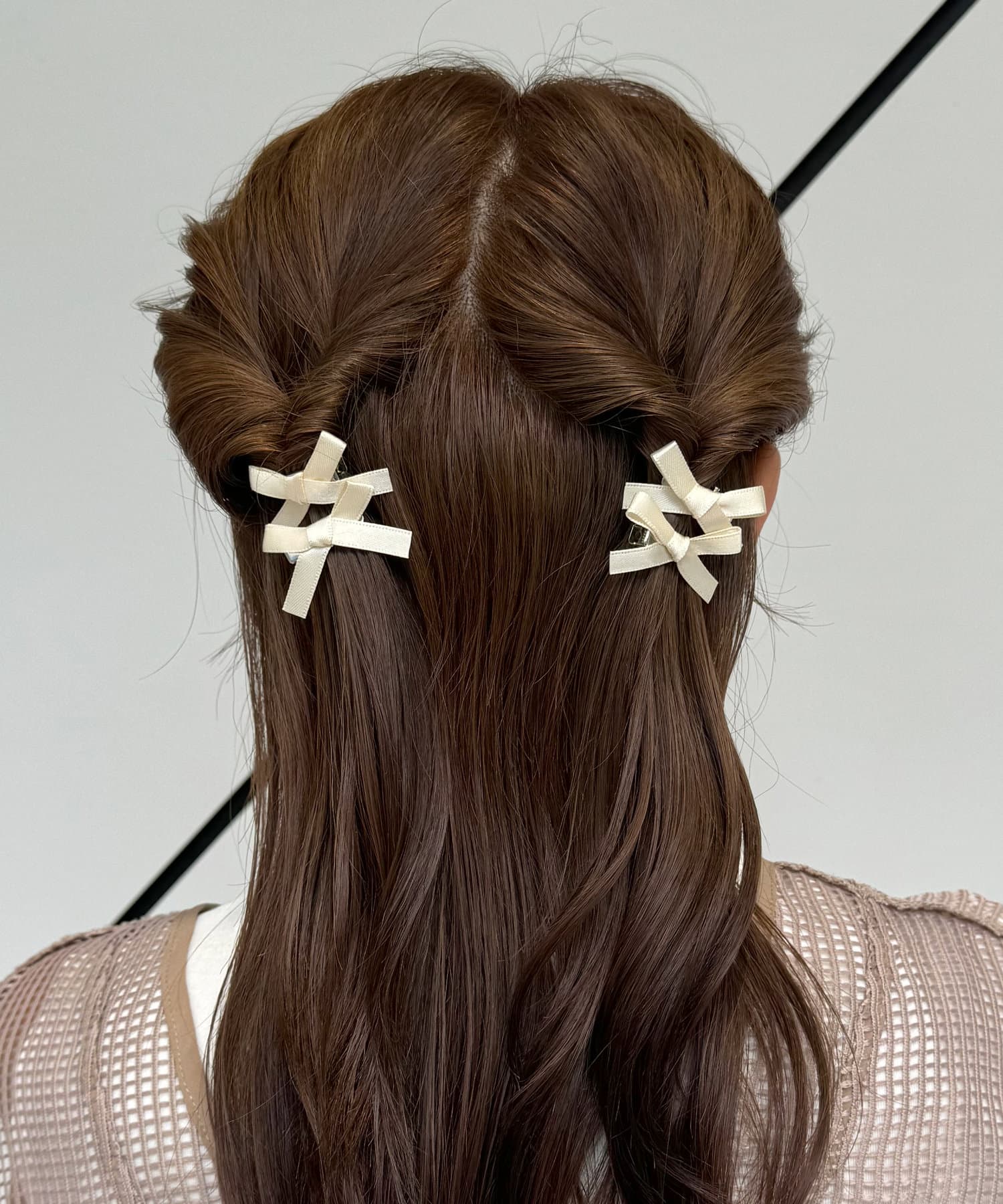 購入場所:店舗ミニクリップが4つもあるので、左右に2つずつ付けることが出来ます!ベロア素材も可愛いですが、これは普通のリボンなのでオールシーズン使えるのも良いです︎☺︎