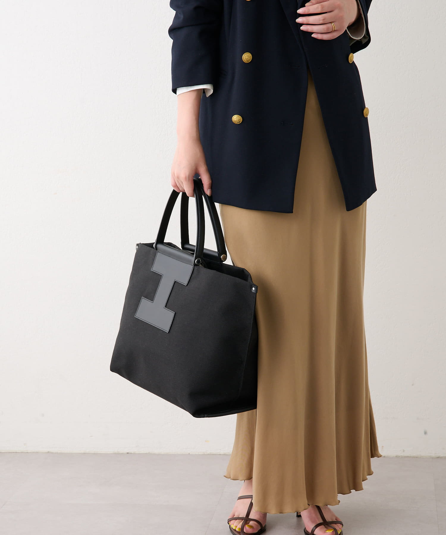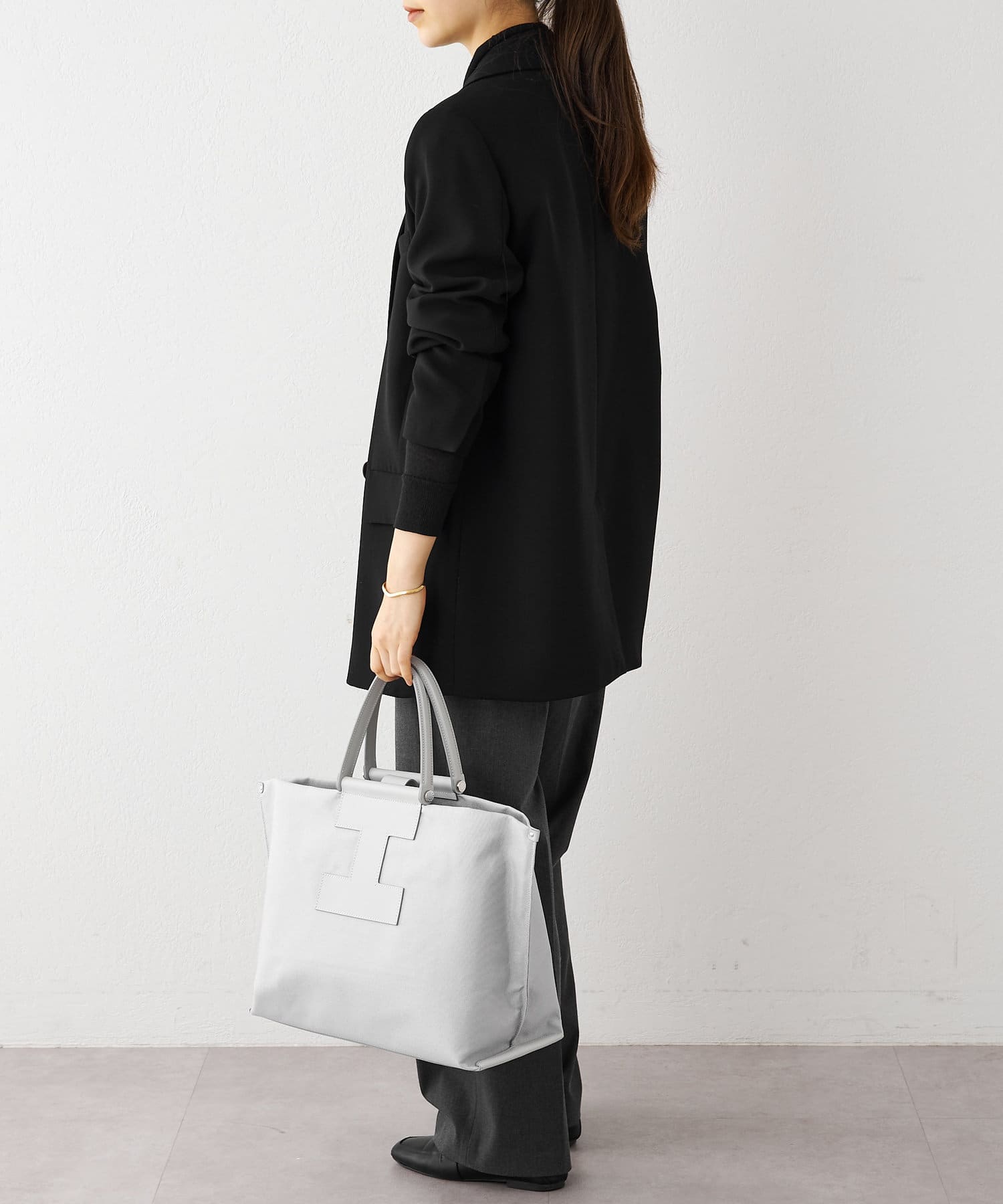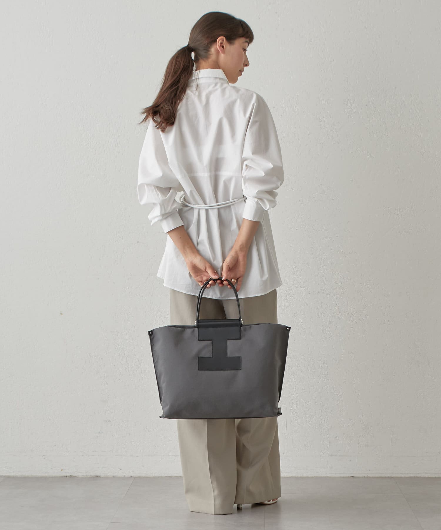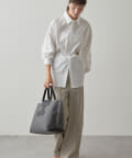 A4サイズもすっぽり収納できるビッグなLサイズは、デイリーユースはもちろん、ビジネスシーンやトラベルシーンでも活躍します。あえてお荷物を少なめにすることでくたっとした見た目となり、こなれた雰囲気で大人の余裕がプラスされたワンランク上のスタイリングに。