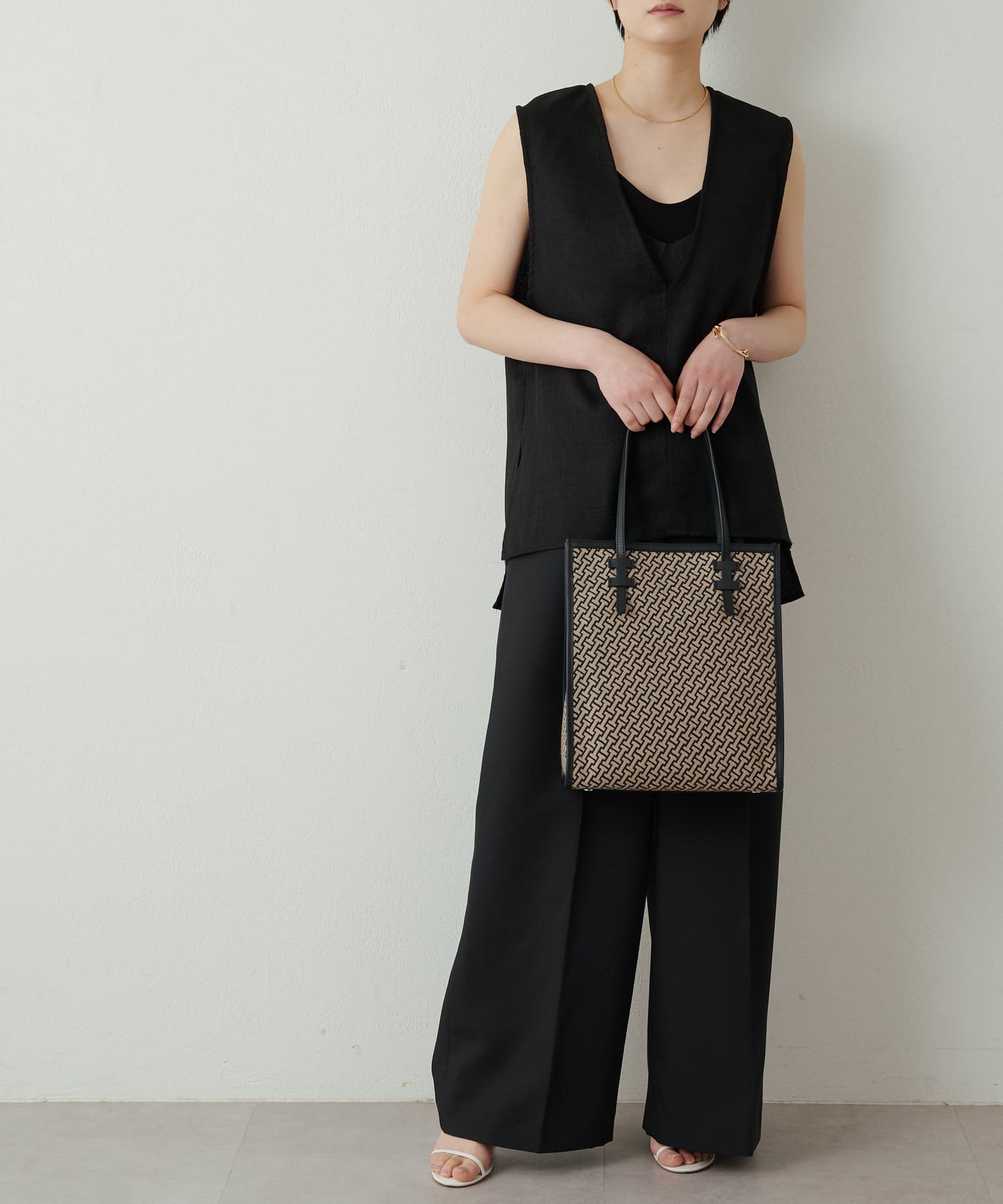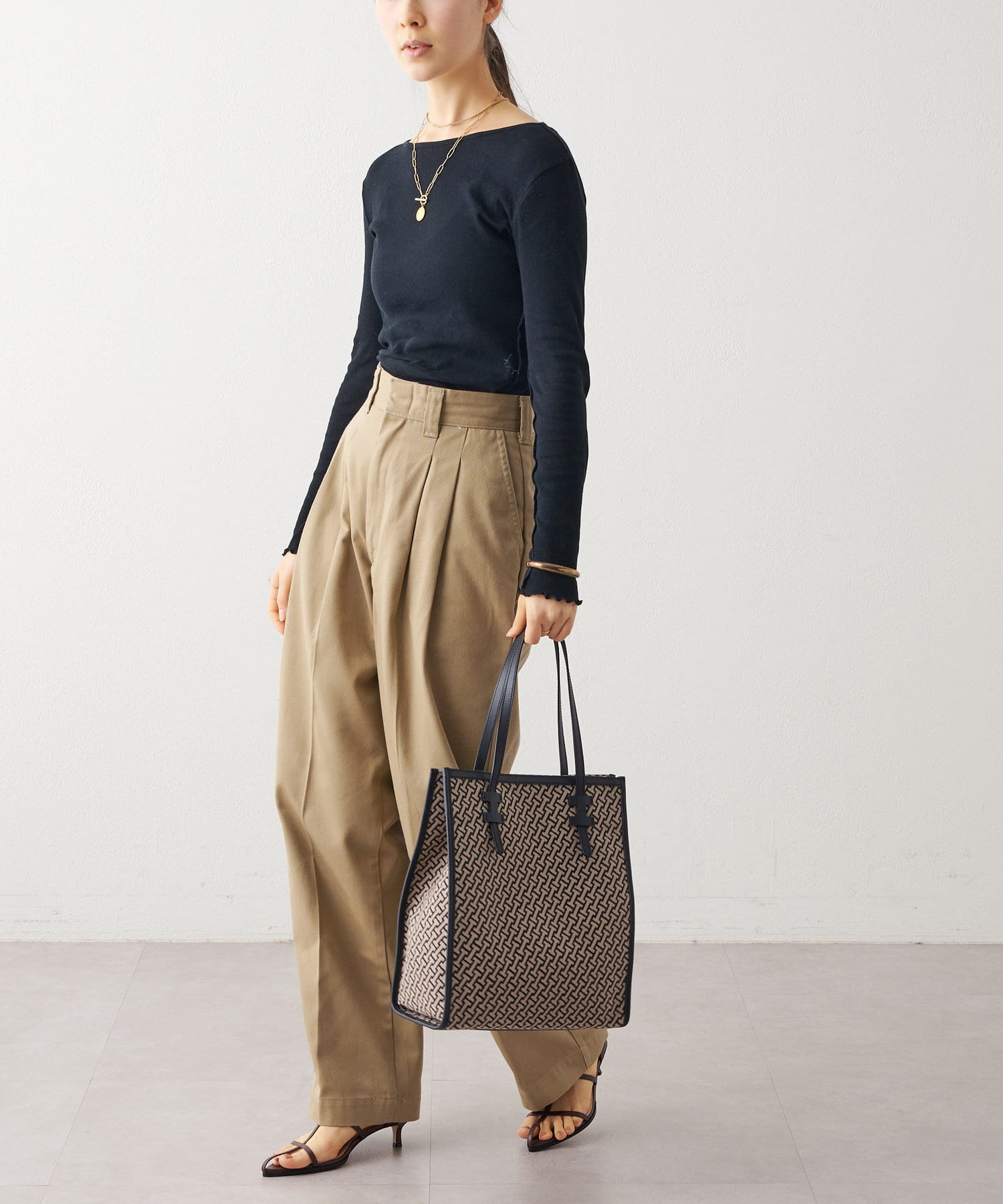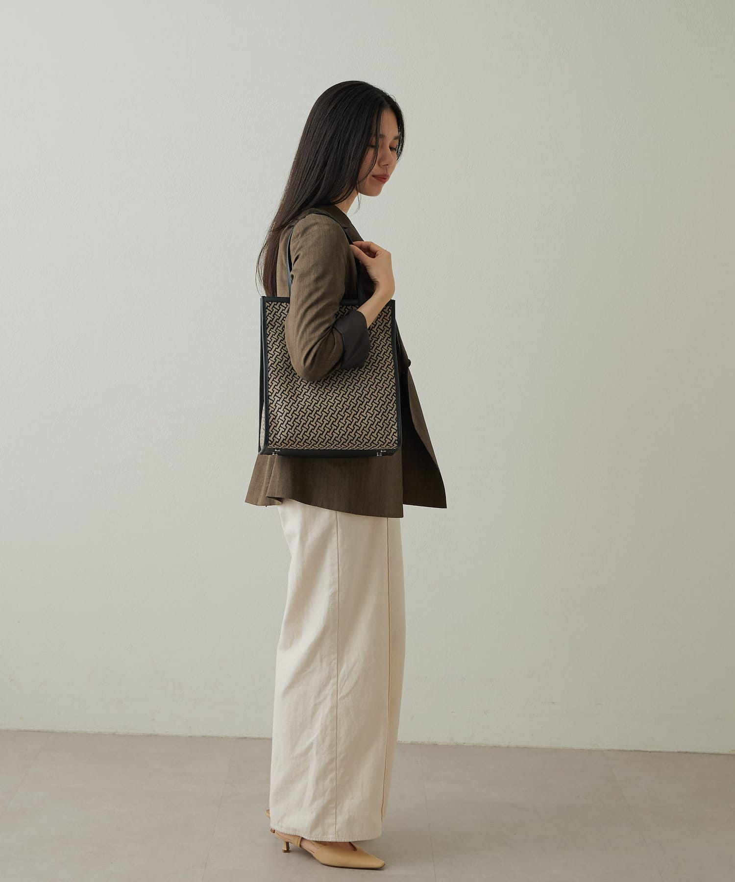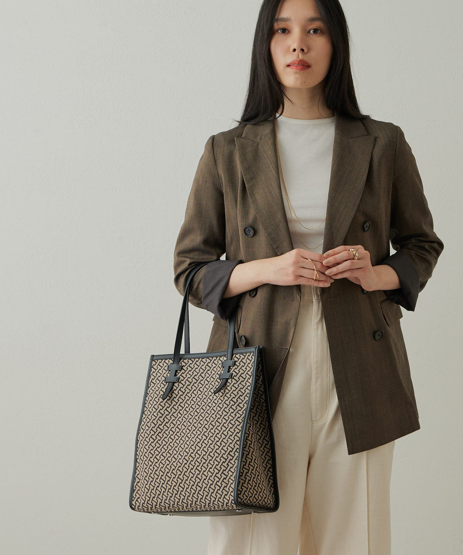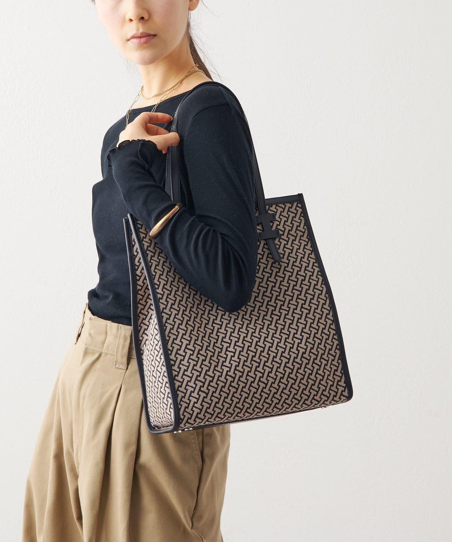 クラシカルでモダン、大人の女性にこそ持ってほしいモノグラムに仕上げたジャガード。マニッシュな印象のサンドベージュ×ブラックの配色は着こなしを格上げしてくれます。ラフなカジュアルスタイルも持つだけでぐっと洗練された印象に。