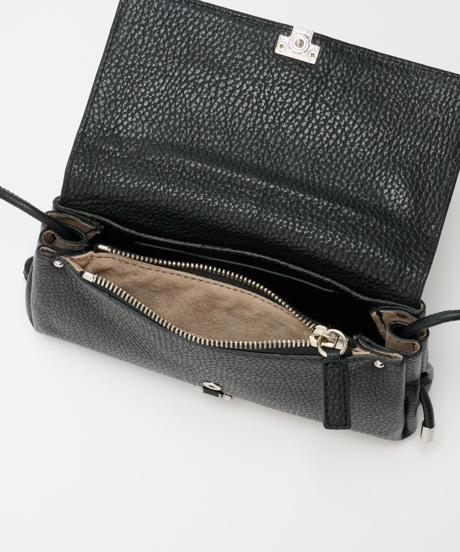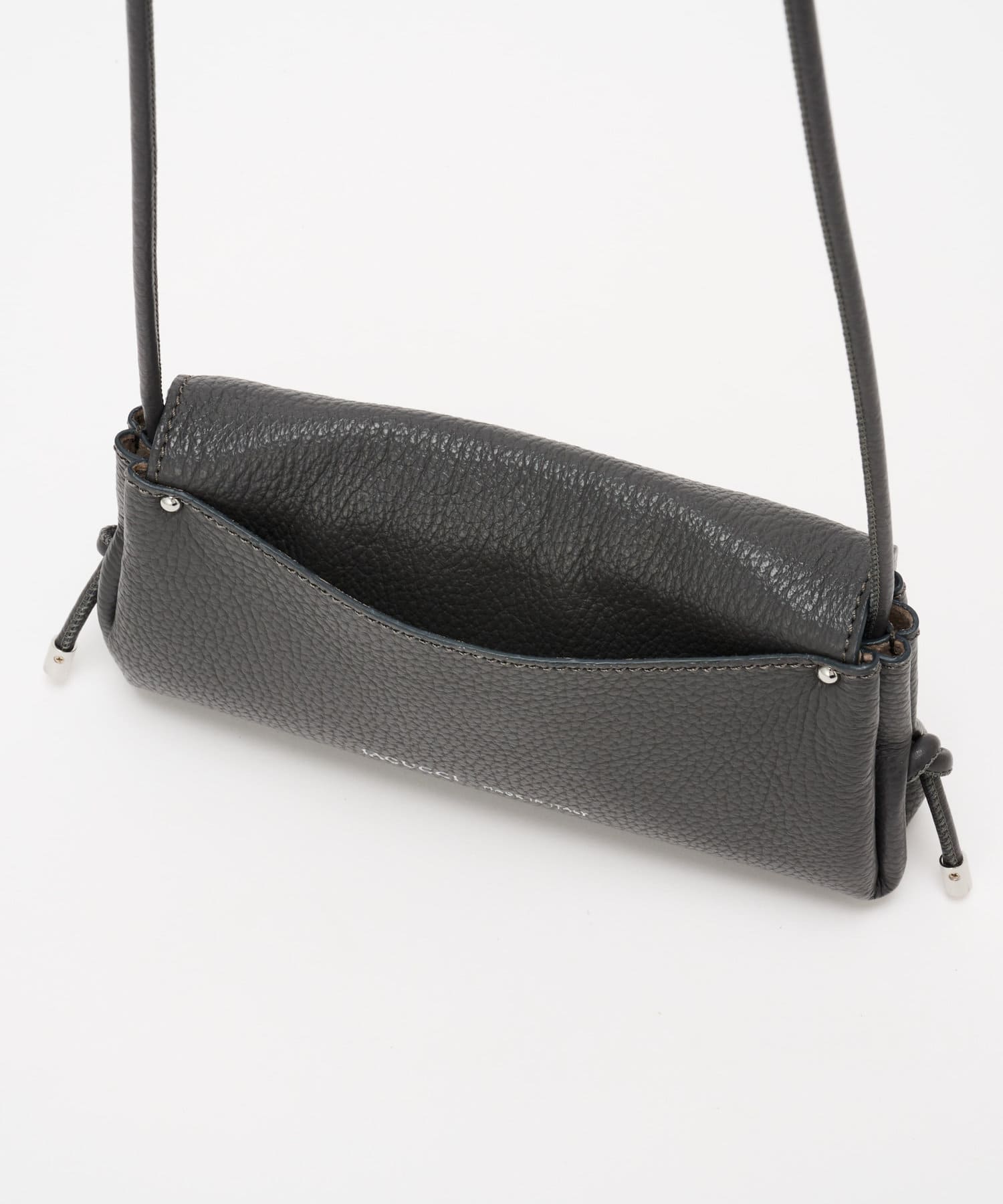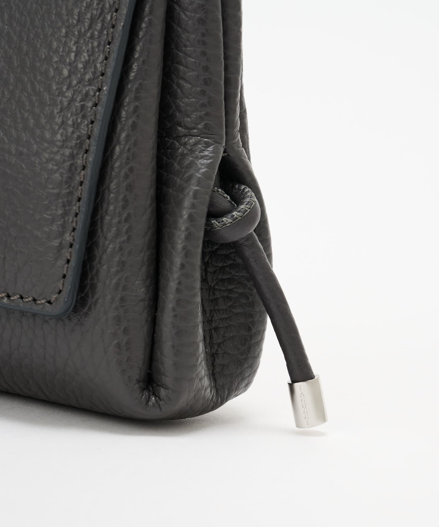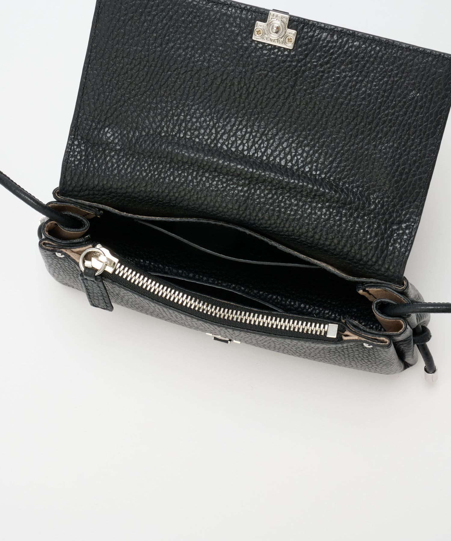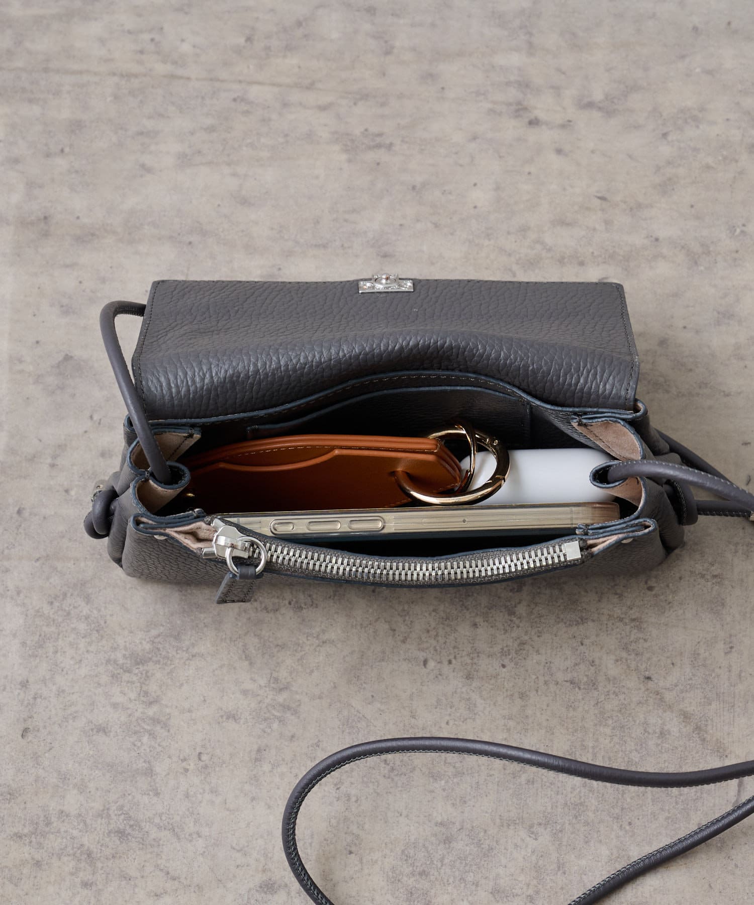中は三層に分かれており、マチのある中央部分にはスマートフォンも収納可能。パスポート・航空券などもスマートに入るサイズ感で、デイリーユースにはもちろん、トラベルシーンにも活躍!小銭や細かいアクセサリーも収納できるファスナーポケットと、サイドポケット×1、カードポケット×2と、機能性も抜群です。ストラップ部分は結んで長さ調節ができるので、厚着の季節もベストバランスで使えるのも嬉しいポイント。
