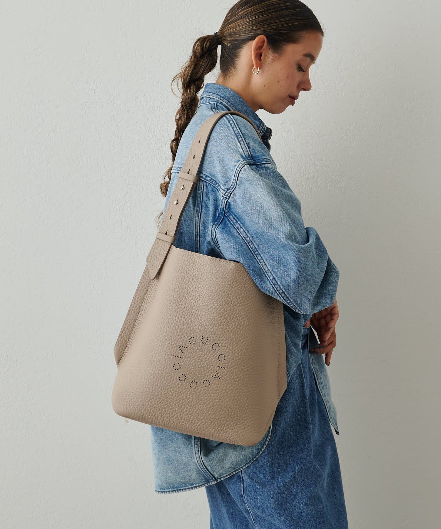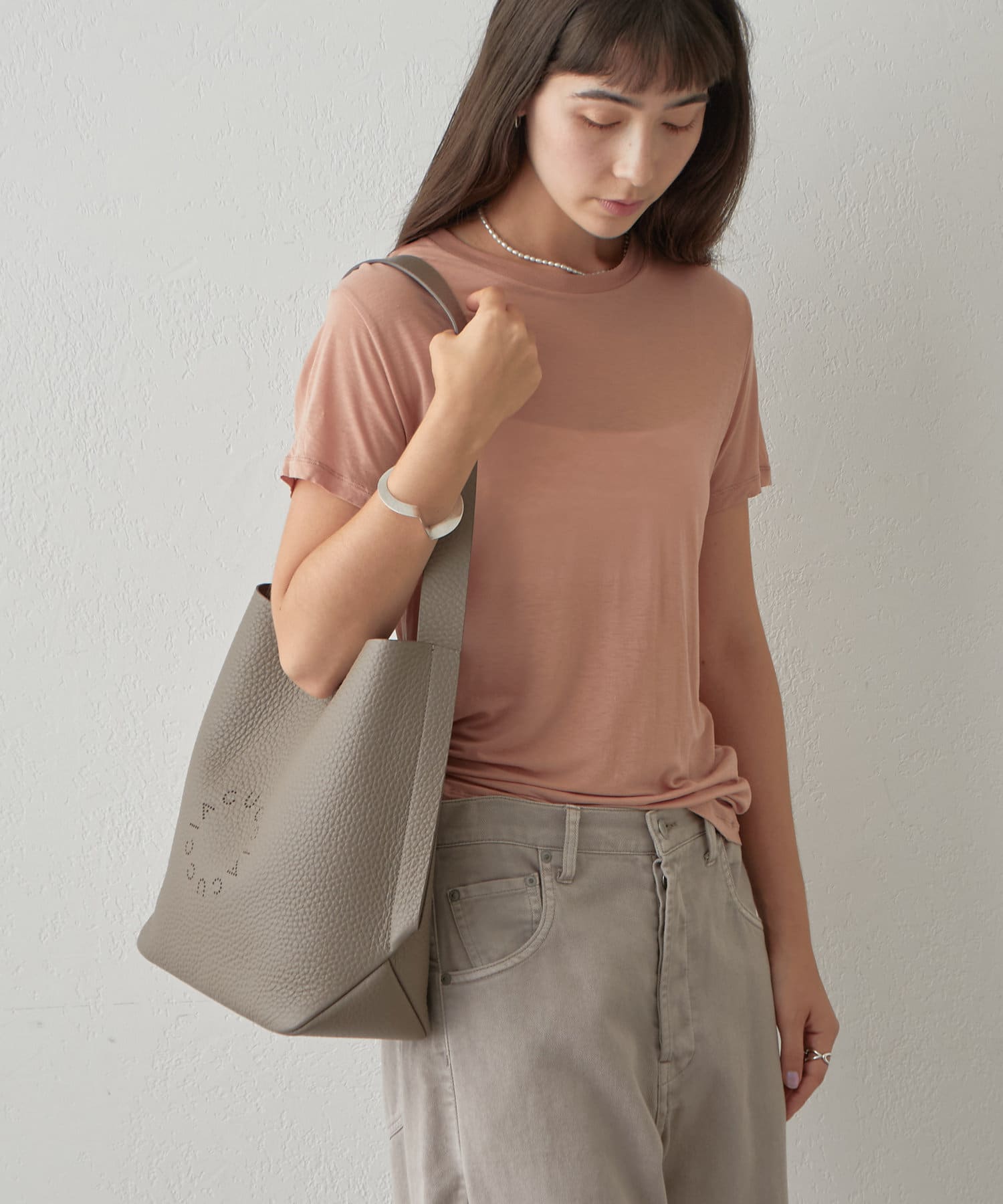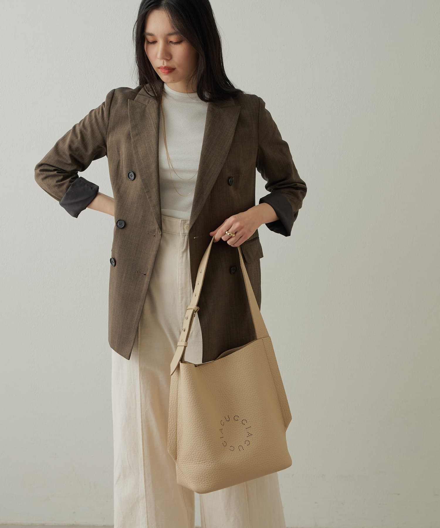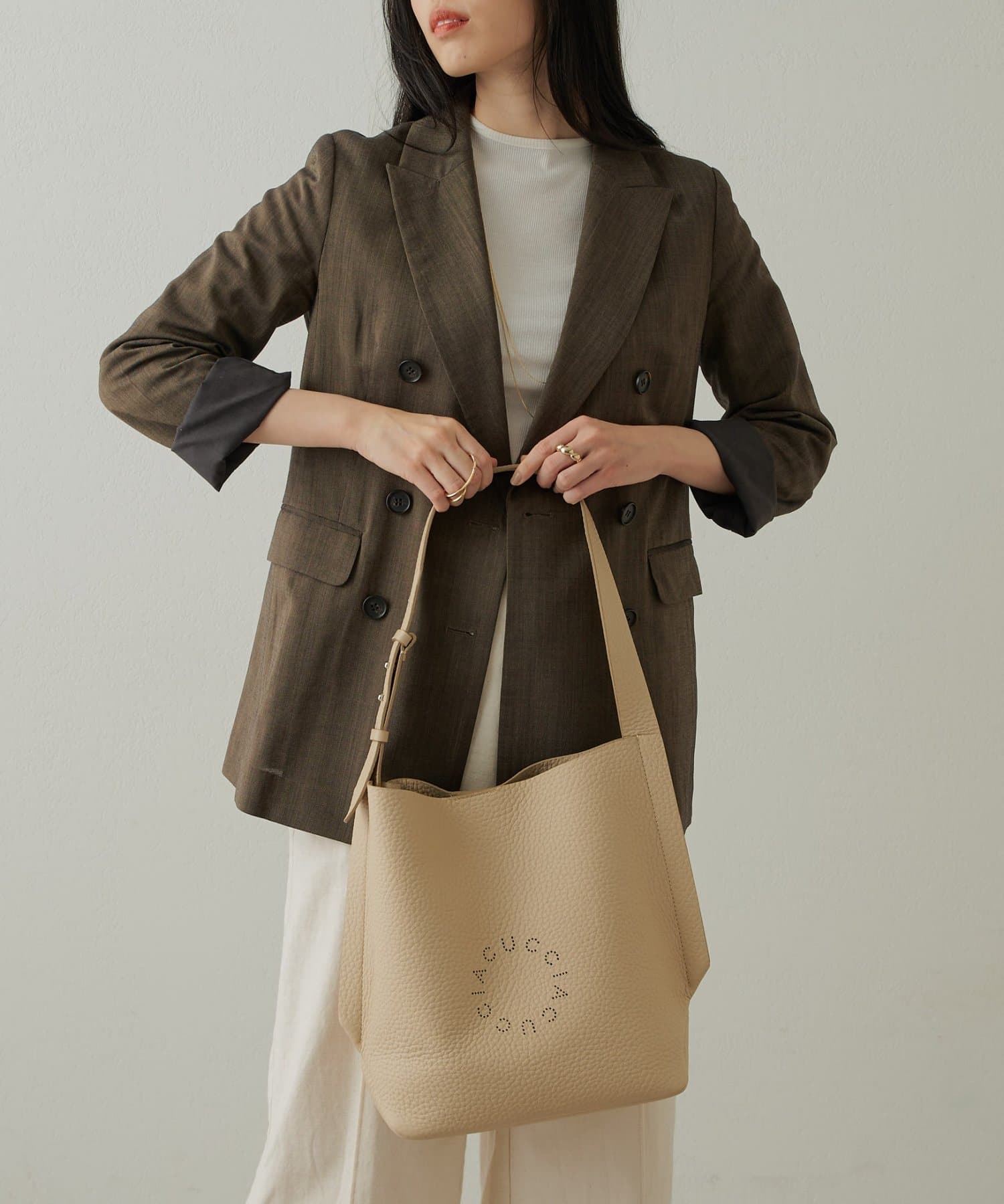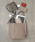 素材の良さが活きるシンプルなデザインで、使うほどに馴染む上質なレザーの質感を存分に楽しんでいただける、ディレクターも一押しのアイテム。パンチングのサークルロゴがさりげないアクセントになり、さらりと合わせるだけでスタイリングに大人のこなれ感をプラスしてくれます。