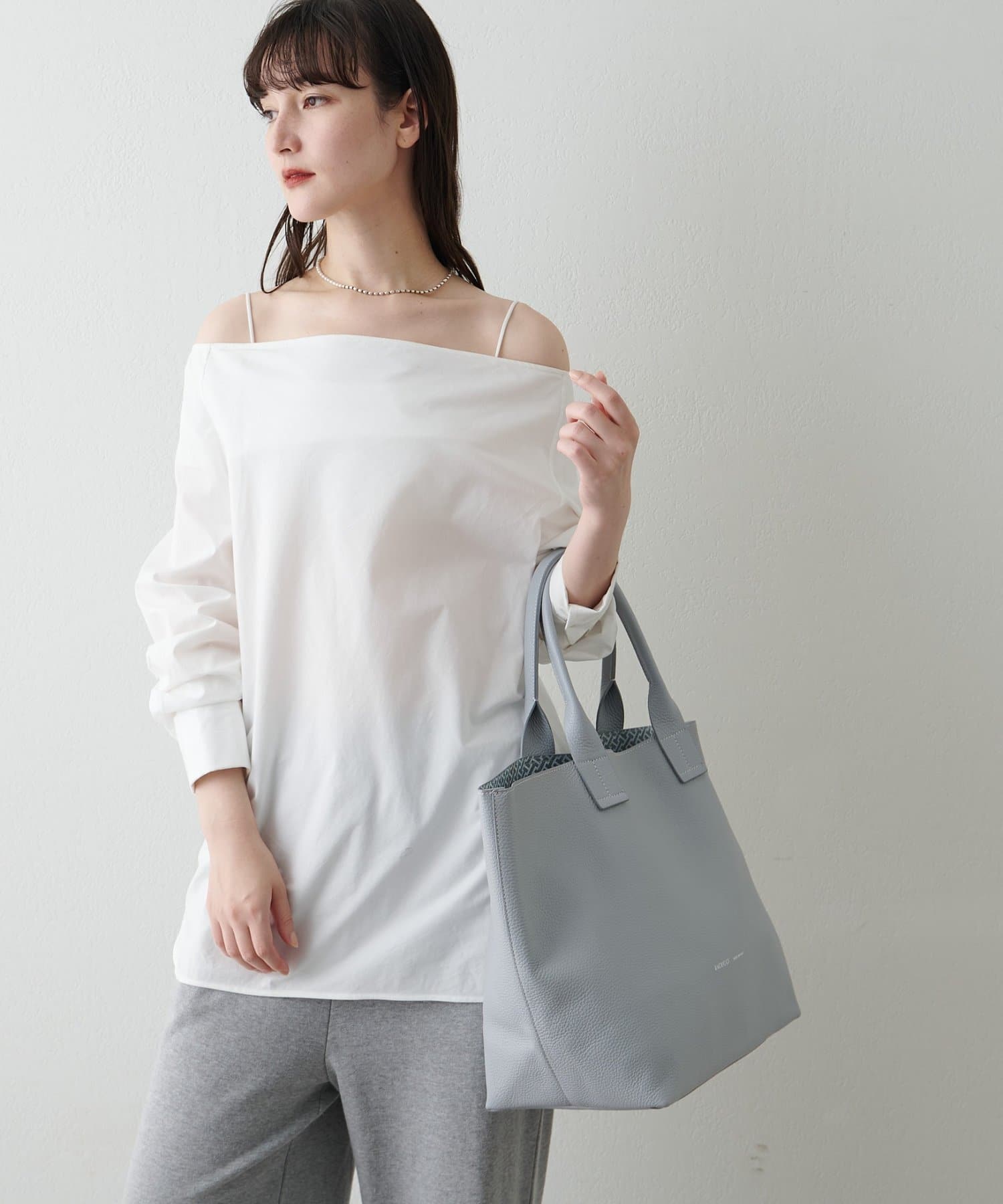 ソフトなレザーの質感が際立つよう、荷物は少なめにくたっとラフに合わせるのがディレクターのおすすめ。そのままでももちろん、サイズ調整用のスナップボタンを配置しているので、サイドを折りこんでフォルムチェンジするのも〇。気分やシーンに合わせてスタイリングを楽しんで。A4サイズもすっきり収納できる大容量のLサイズ。デイリーユースはもちろん、お仕事やご旅行用バッグ、マザーズバッグとしても活躍すること間違いなし!