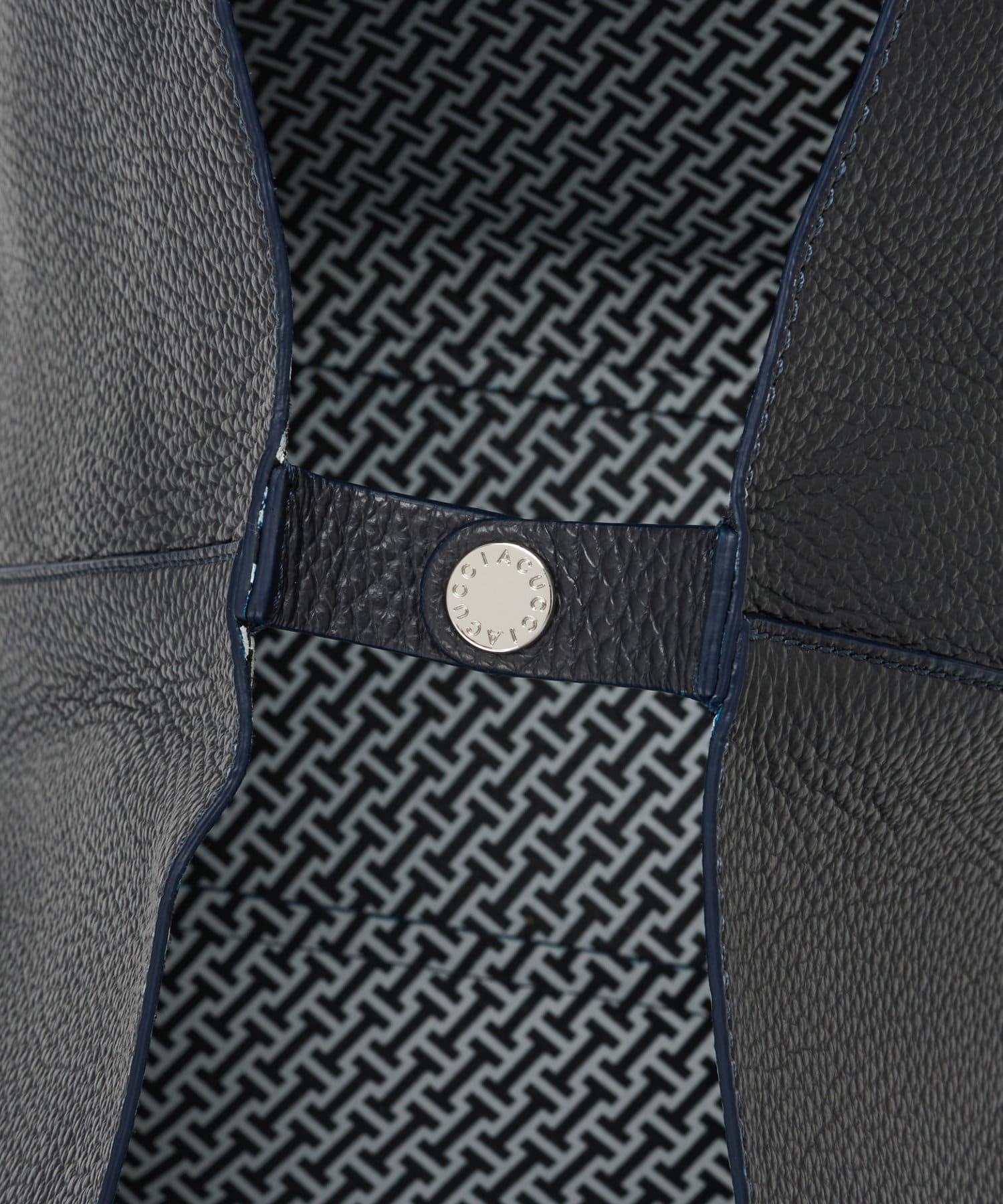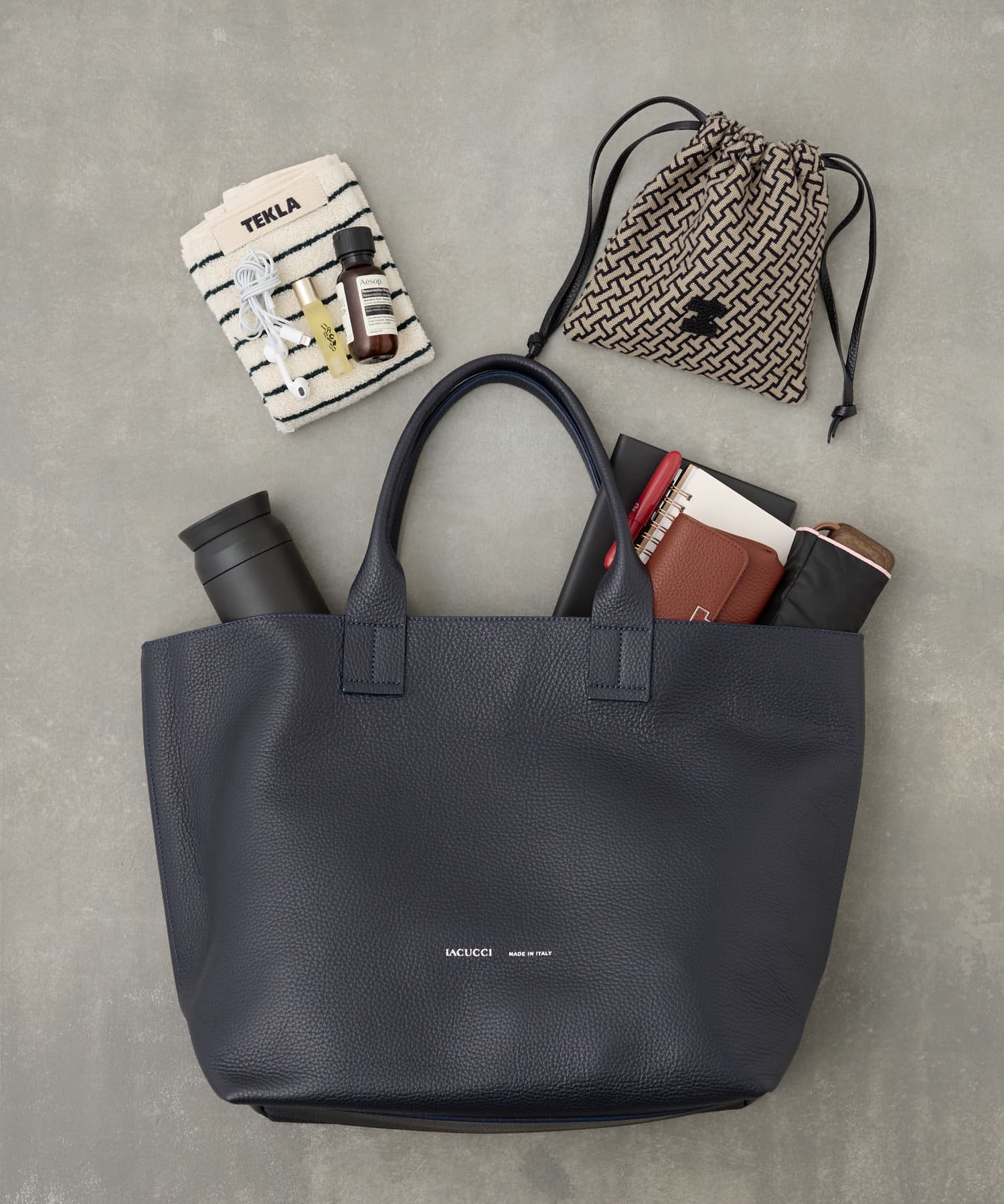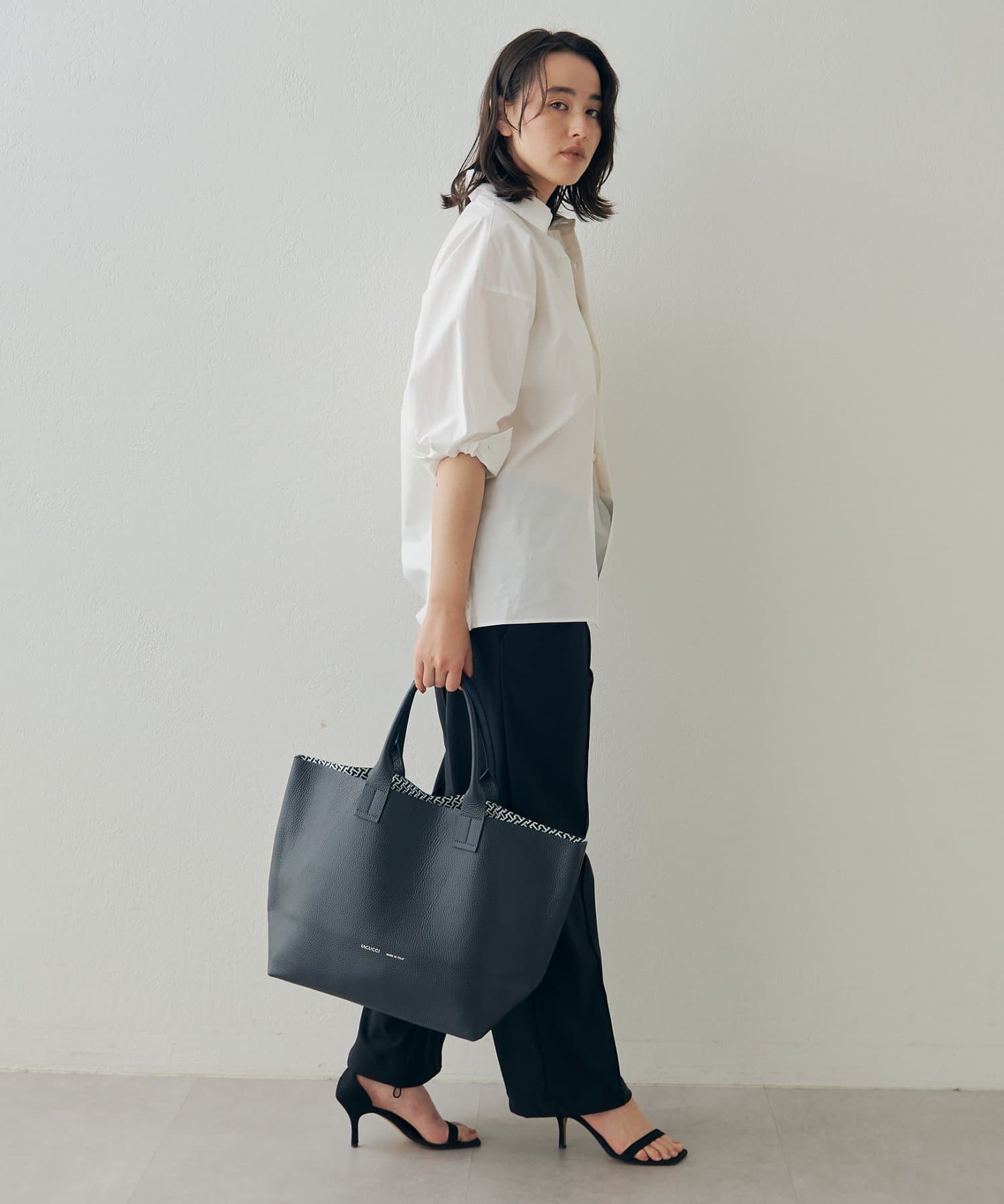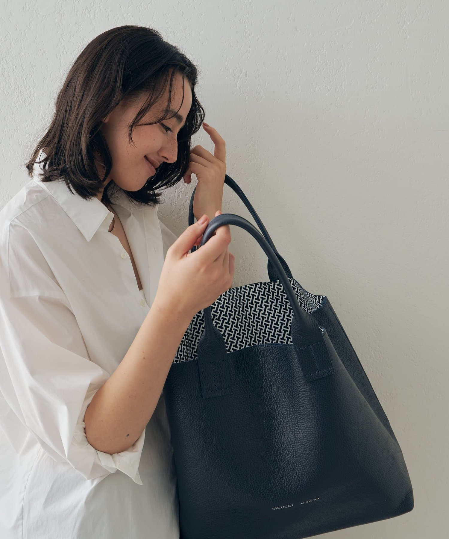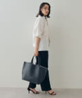 ソフトなレザーの質感が際立つよう、荷物は少なめにくたっとラフに合わせるのがディレクターのおすすめ。そのままでももちろん、サイズ調整用のスナップボタンを配置しているので、サイドを折りこんでフォルムチェンジするのも〇。気分やシーンに合わせてスタイリングを楽しんで。A4サイズもすっきり収納できる大容量のLサイズ。デイリーユースはもちろん、お仕事やご旅行用バッグ、マザーズバッグとしても活躍すること間違いなし!