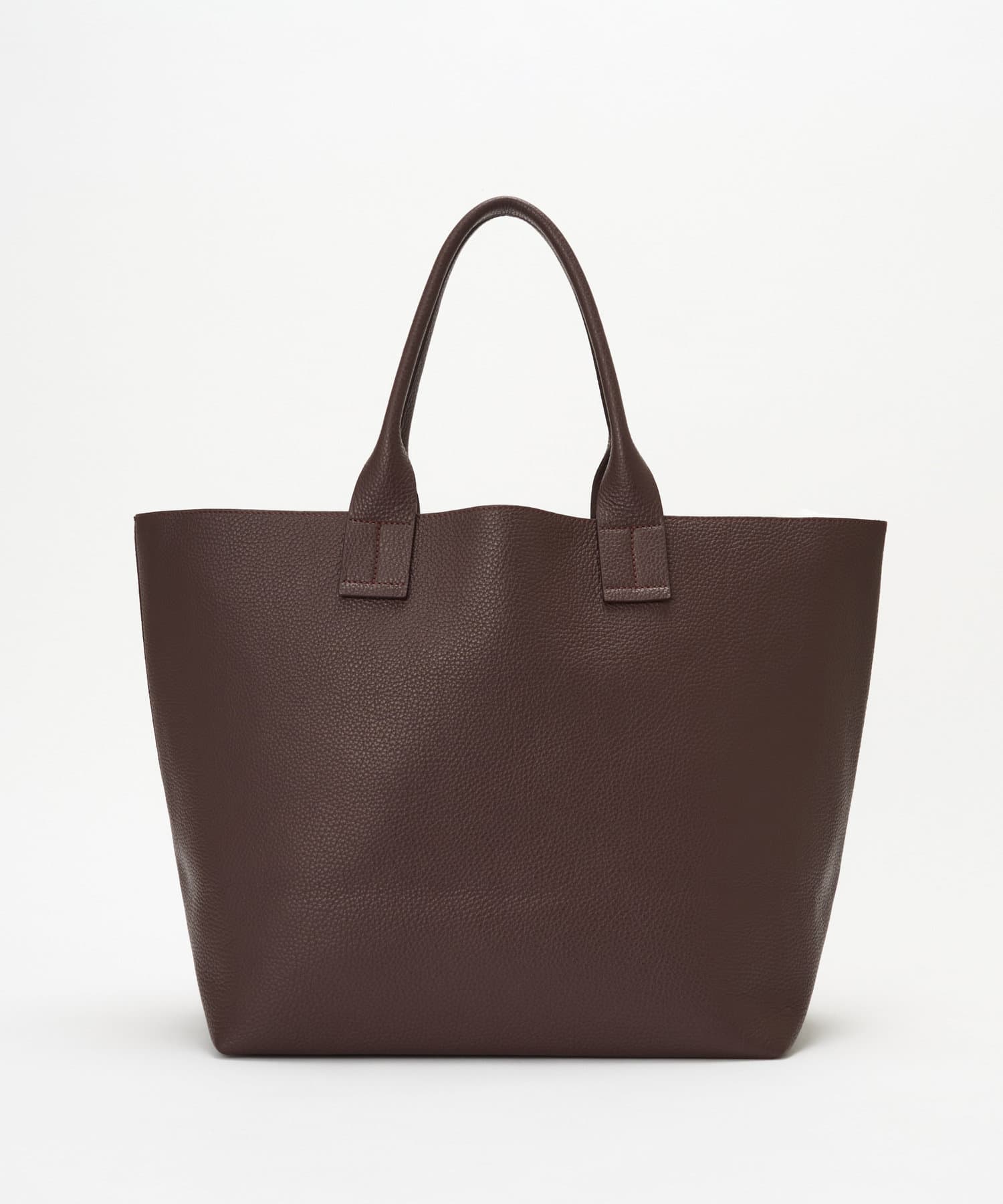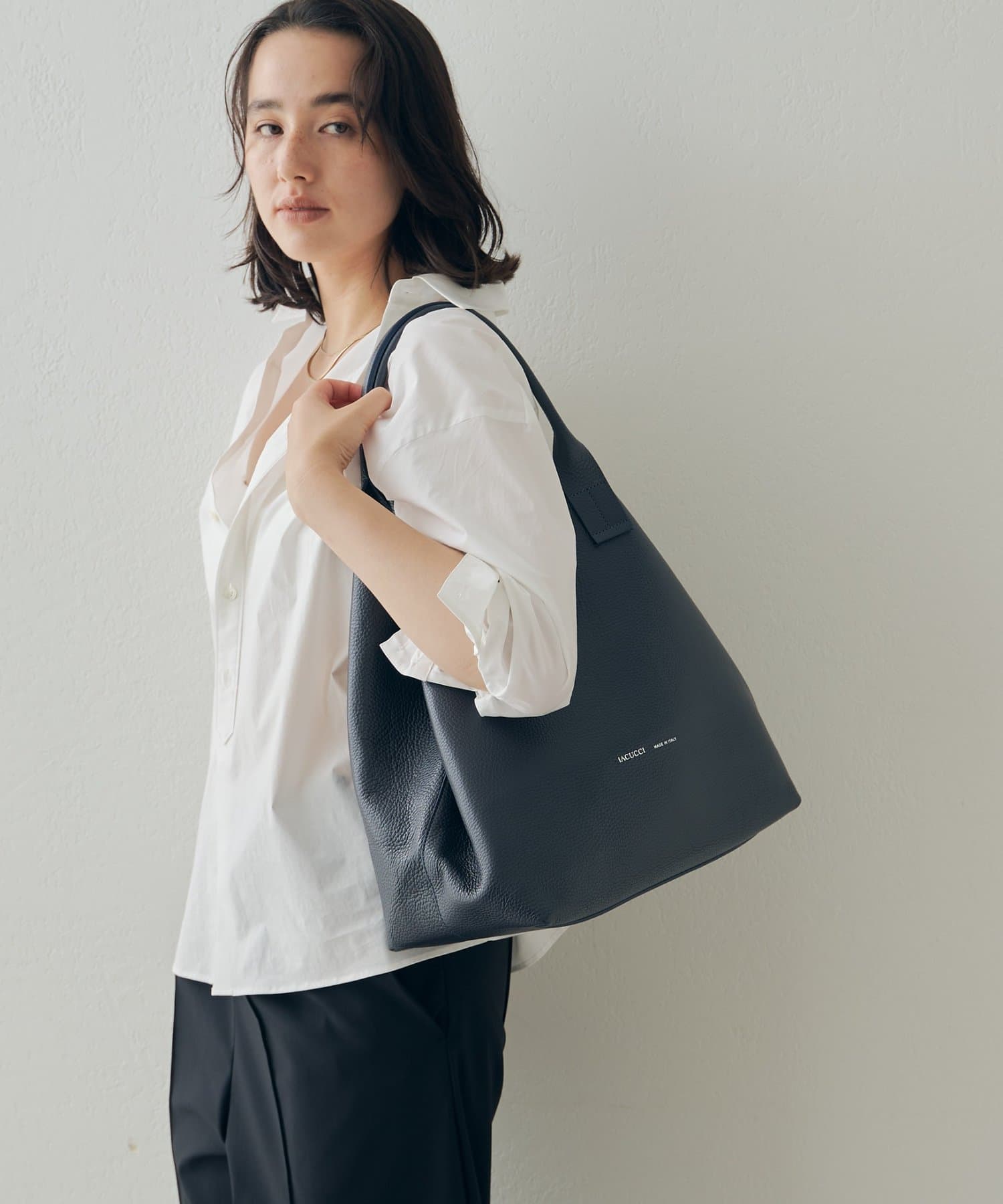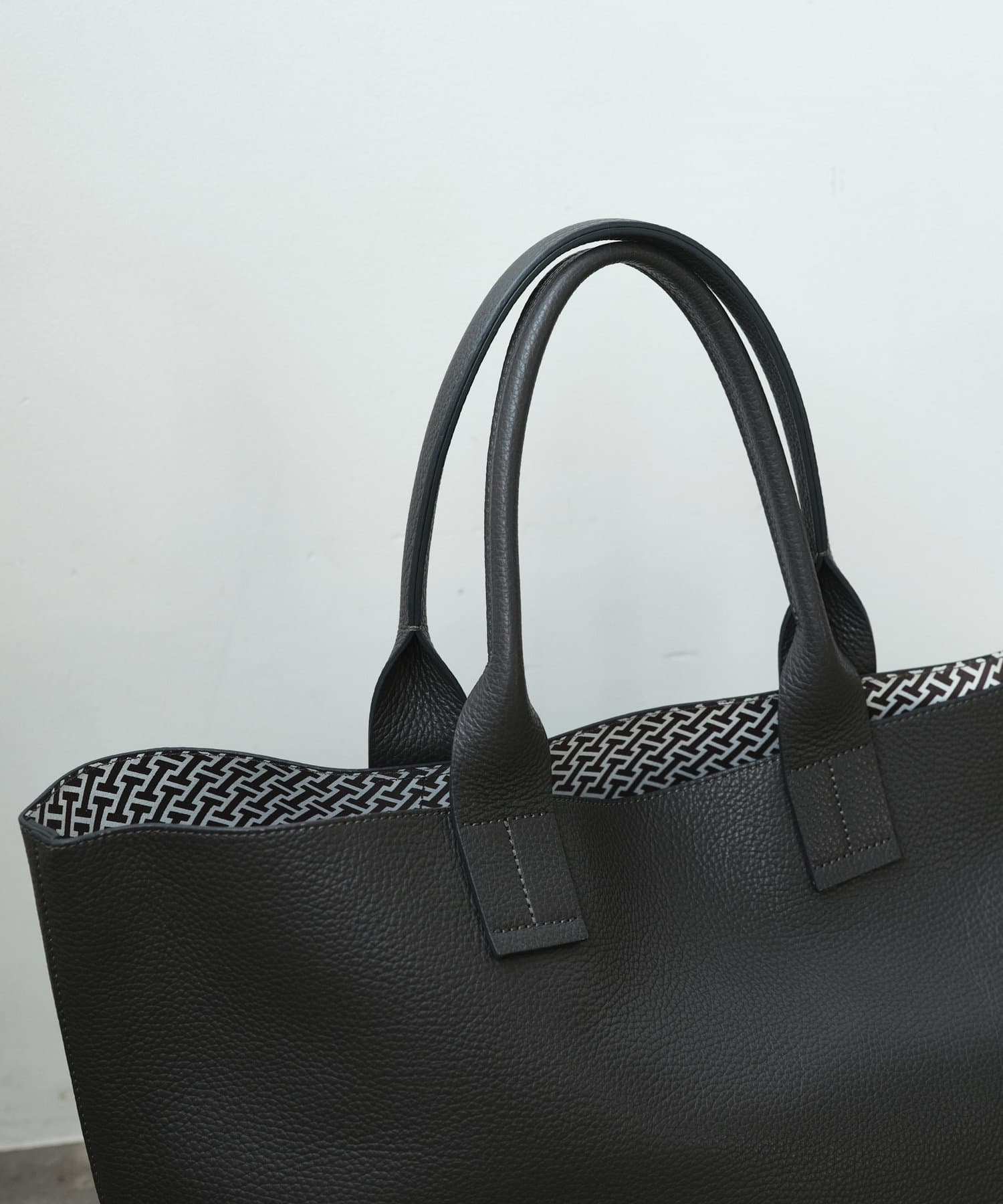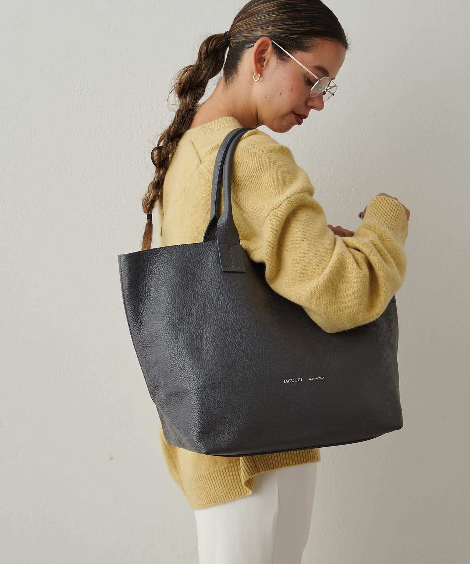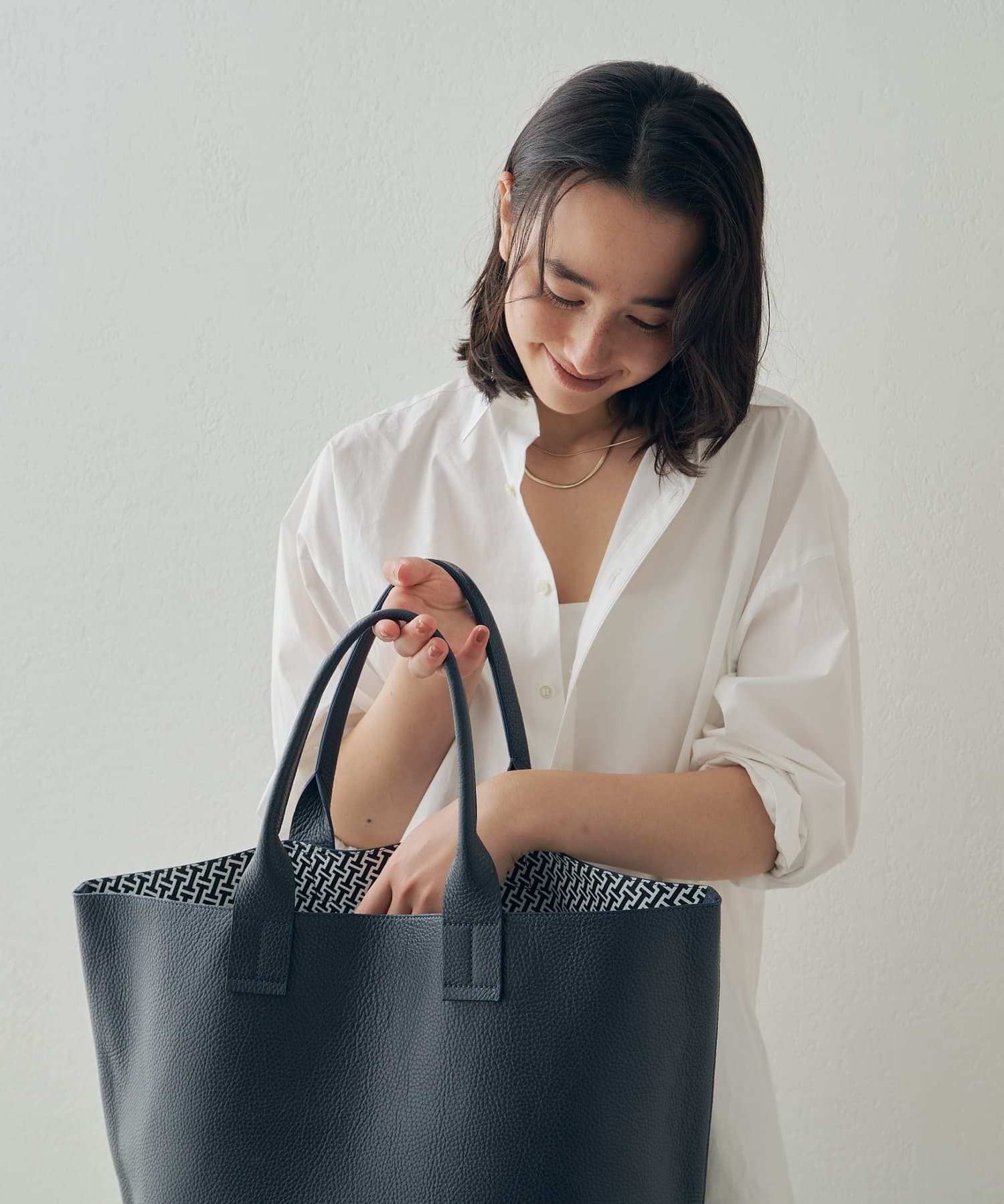 ラフに肩掛けができる長めのハンドルデザインで、大容量の収納が可能なビッグサイズが新登場!女性のわがままを叶えてくれるアイテムに仕上がりました。柔らかなシボレザーを一枚革で仕立てたレザートートで、ビッグサイズながらも大きさを感じずにスタイルに馴染むのも嬉しいポイント。