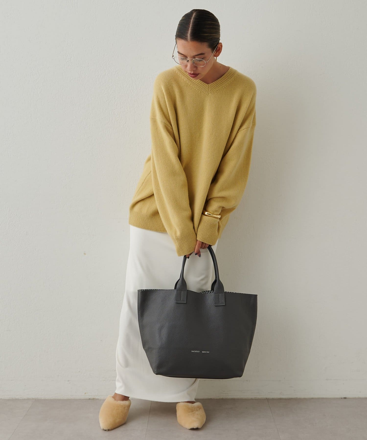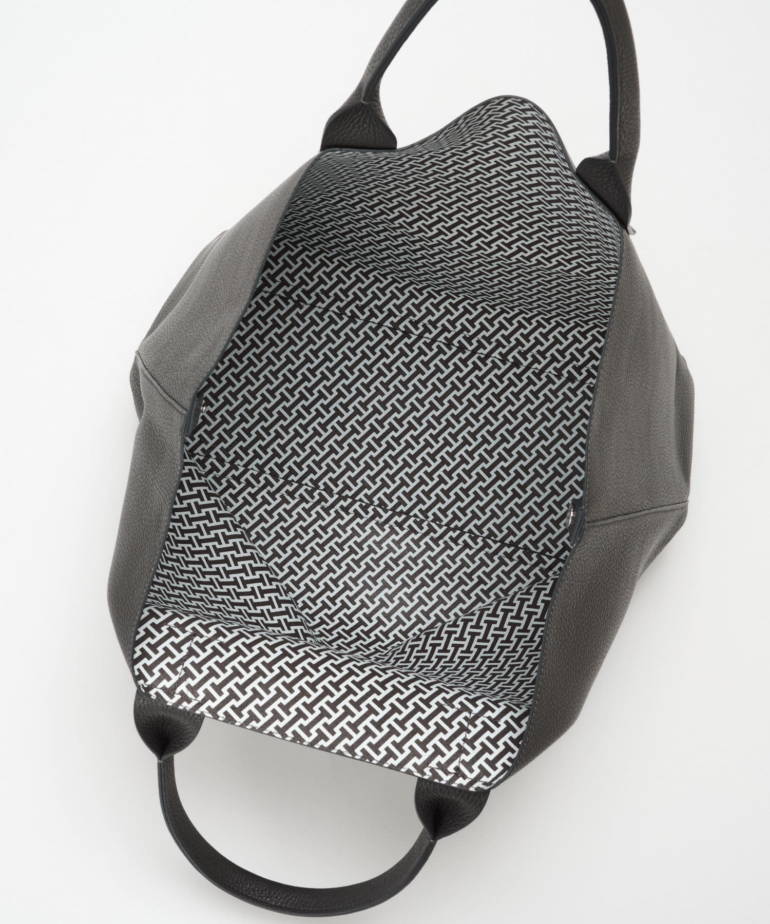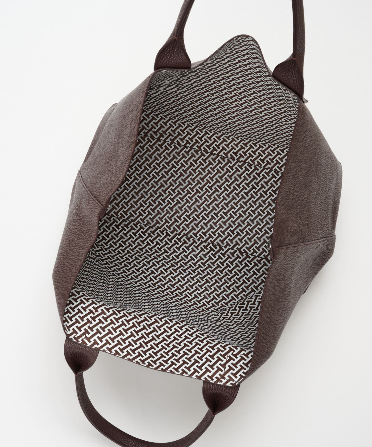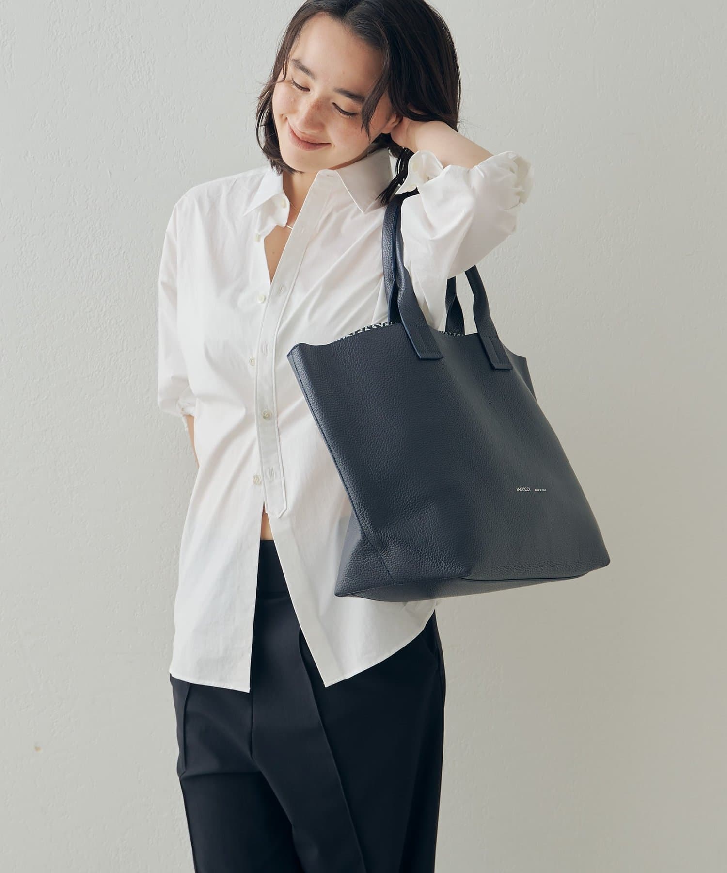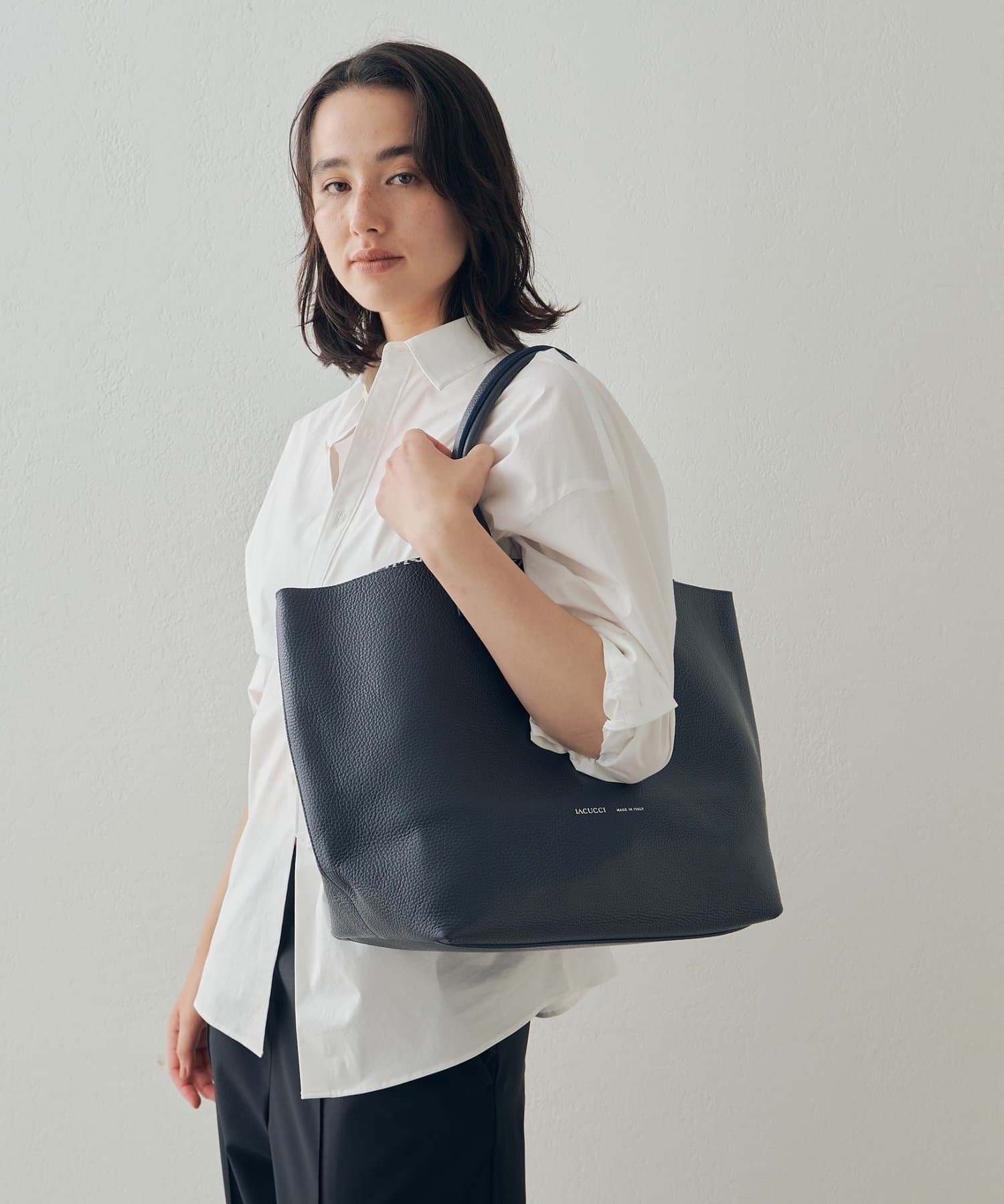 ラフに肩掛けができる長めのハンドルデザインで、大容量の収納が可能なビッグサイズが新登場!女性のわがままを叶えてくれるアイテムに仕上がりました。柔らかなシボレザーを一枚革で仕立てたレザートートで、ビッグサイズながらも大きさを感じずにスタイルに馴染むのも嬉しいポイント。