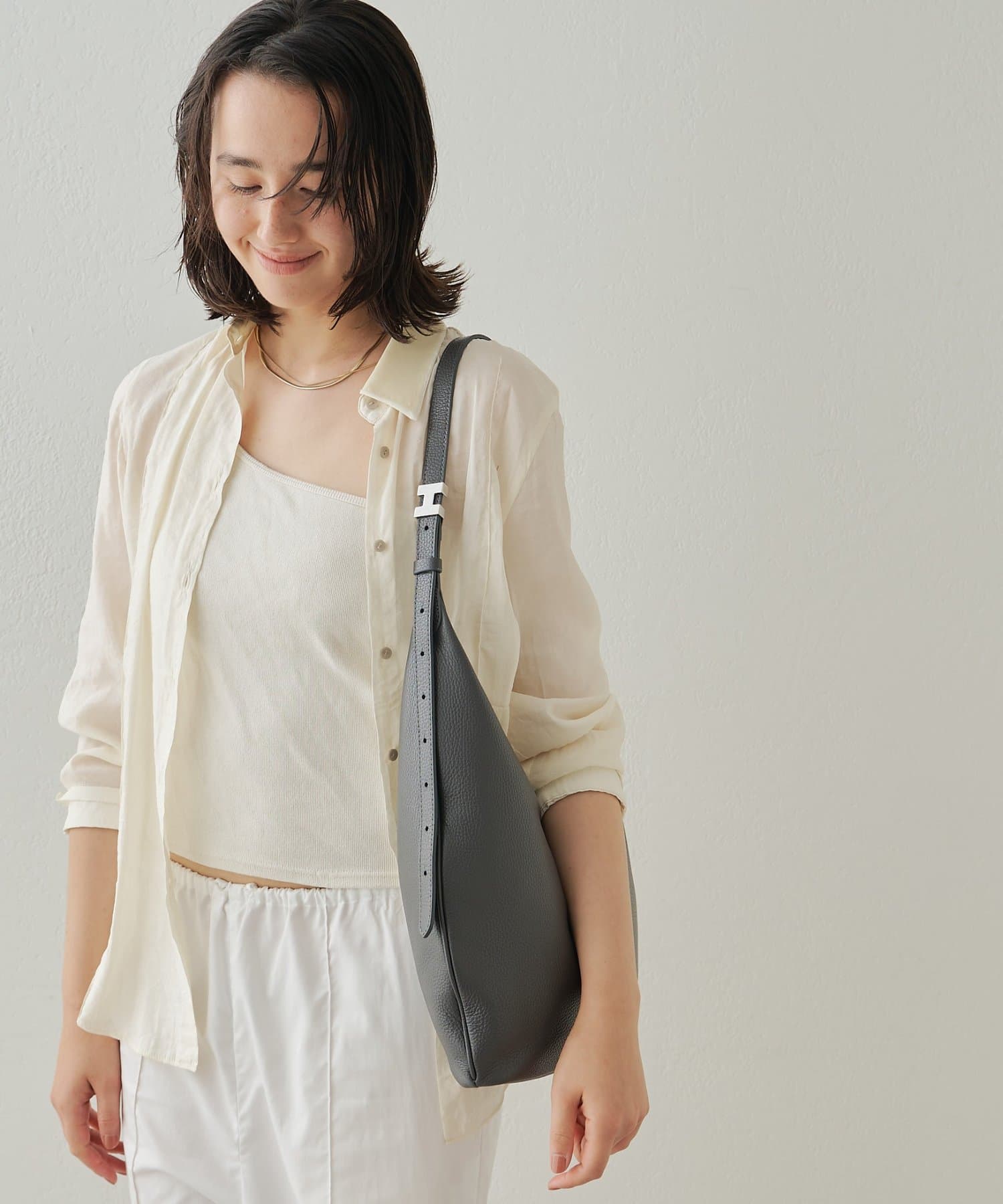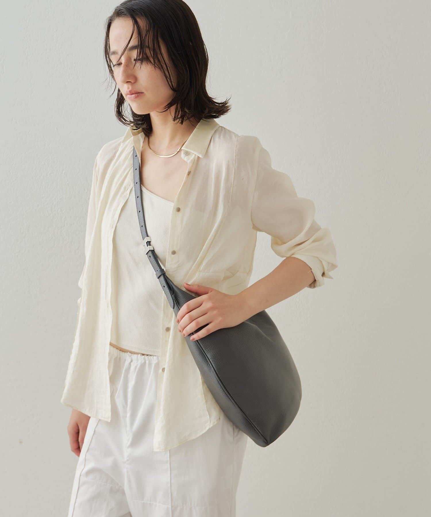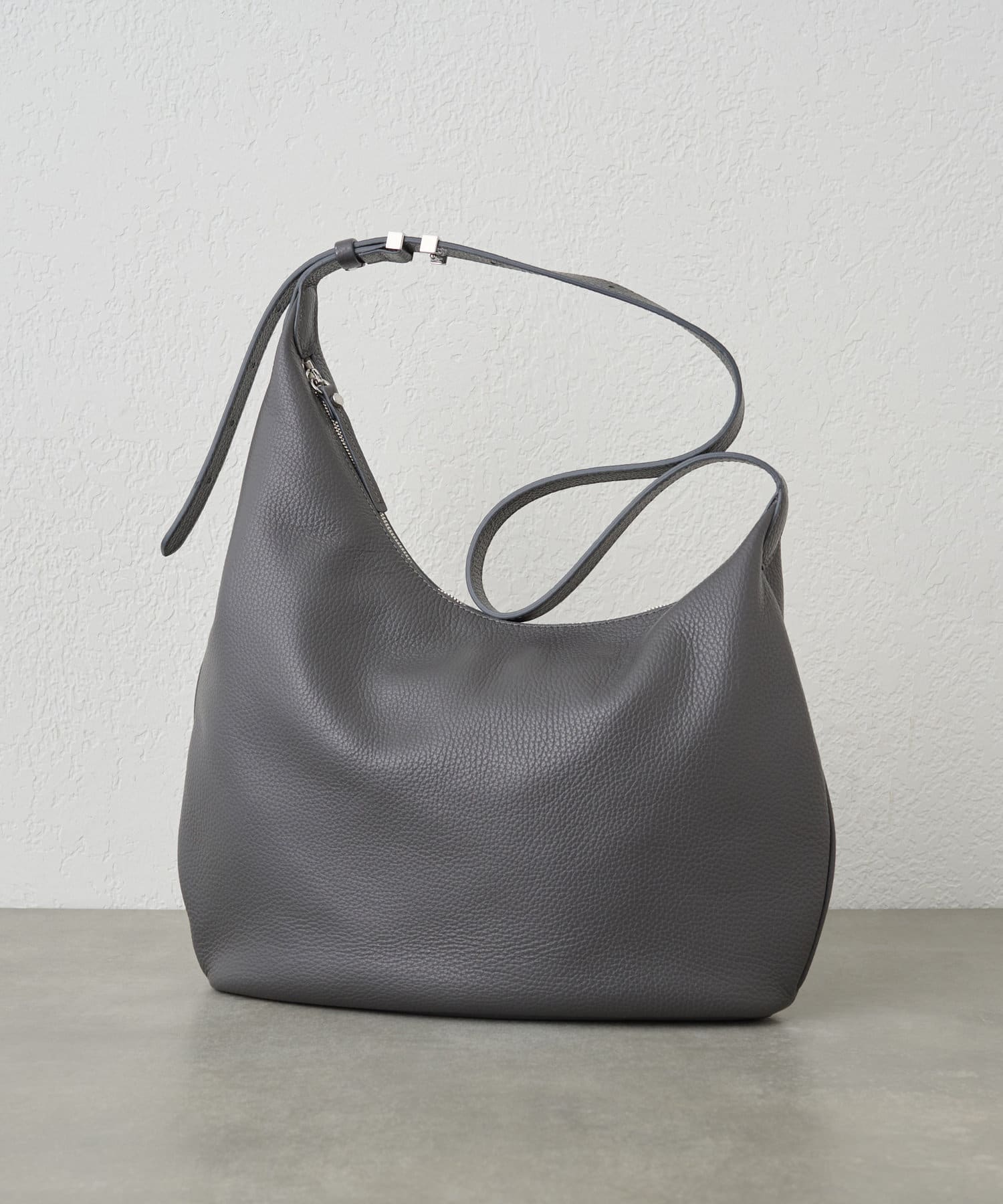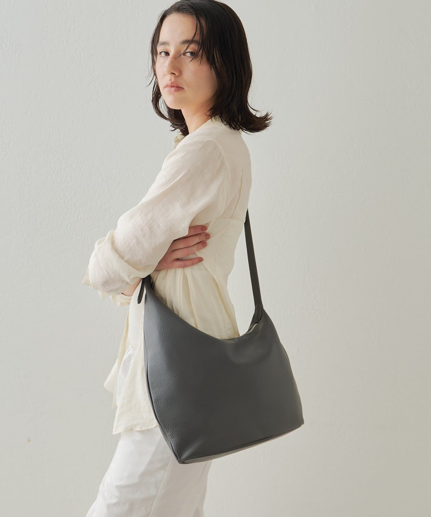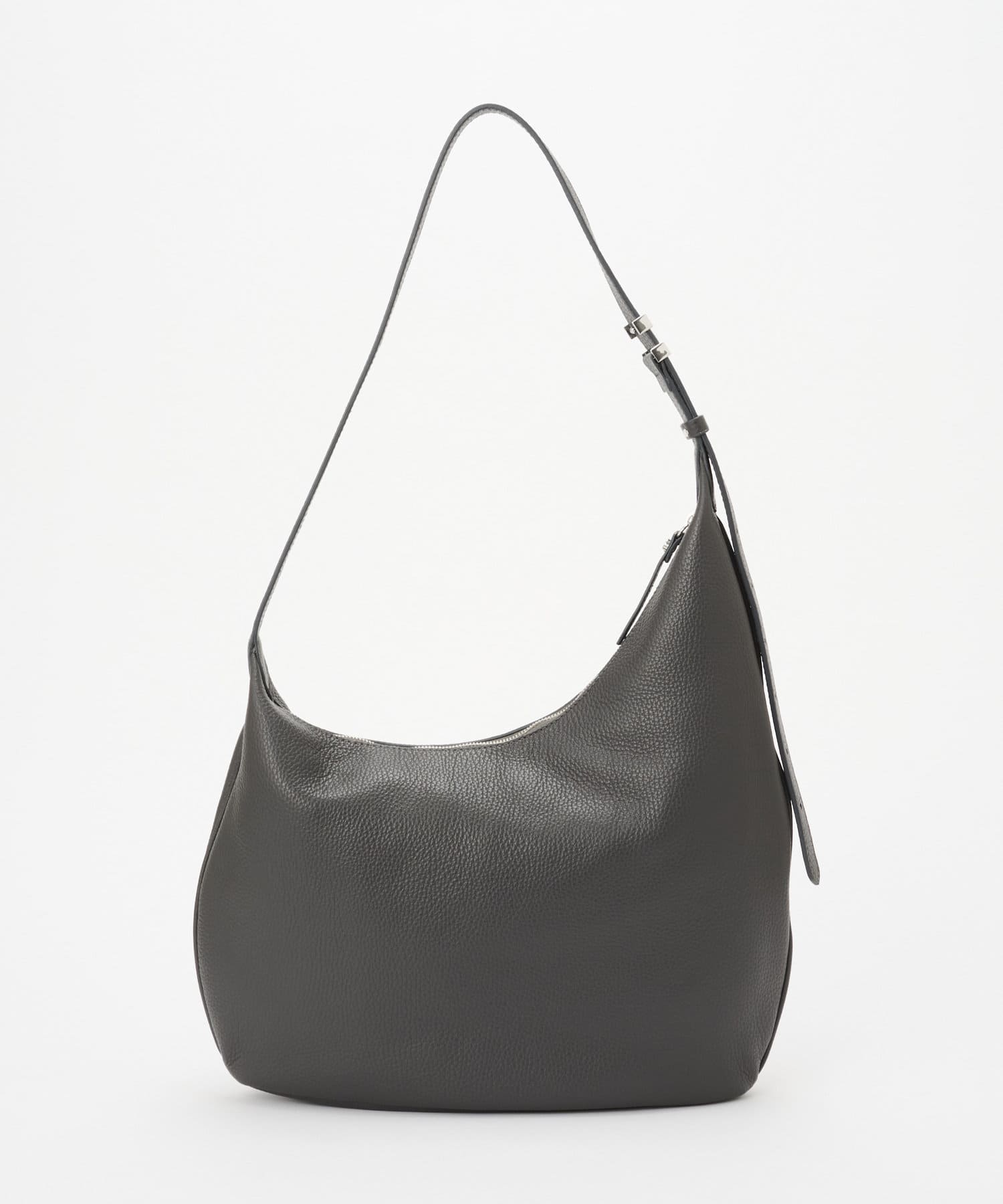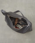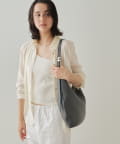 上品な印象に仕上がるアシンメトリーのシルエットや、レザーの質感が際立つ美しい曲線美など、繊細なデザインへの気遣いが目立つイアクッチらしい逸品です。底面はひし形に仕上げることで、お荷物をしっかり入れてもすっきり持てるのも嬉しいポイント!
