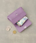 中は3層に分かれていてカードの仕分けがしやすく、開口部は大きく開き中身が見やすいのも人気のポイント。お札は折りたたんで収納でき、コインはボタン付きポケットに。マチが広めのふっくらしたデザインで、リップやアクセサリー、鍵などを入れることもでき使い方はさまざま!幅広いシーンでマルチに活躍してくれるアイテムです。
