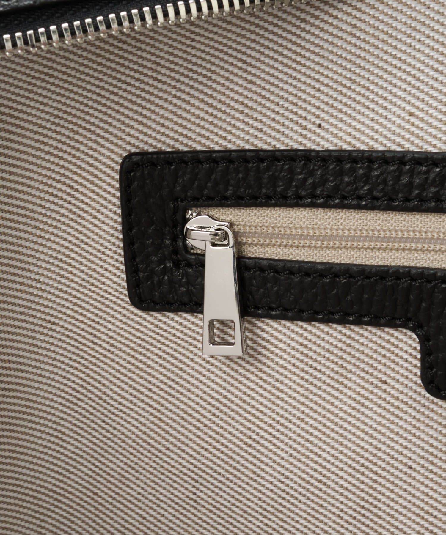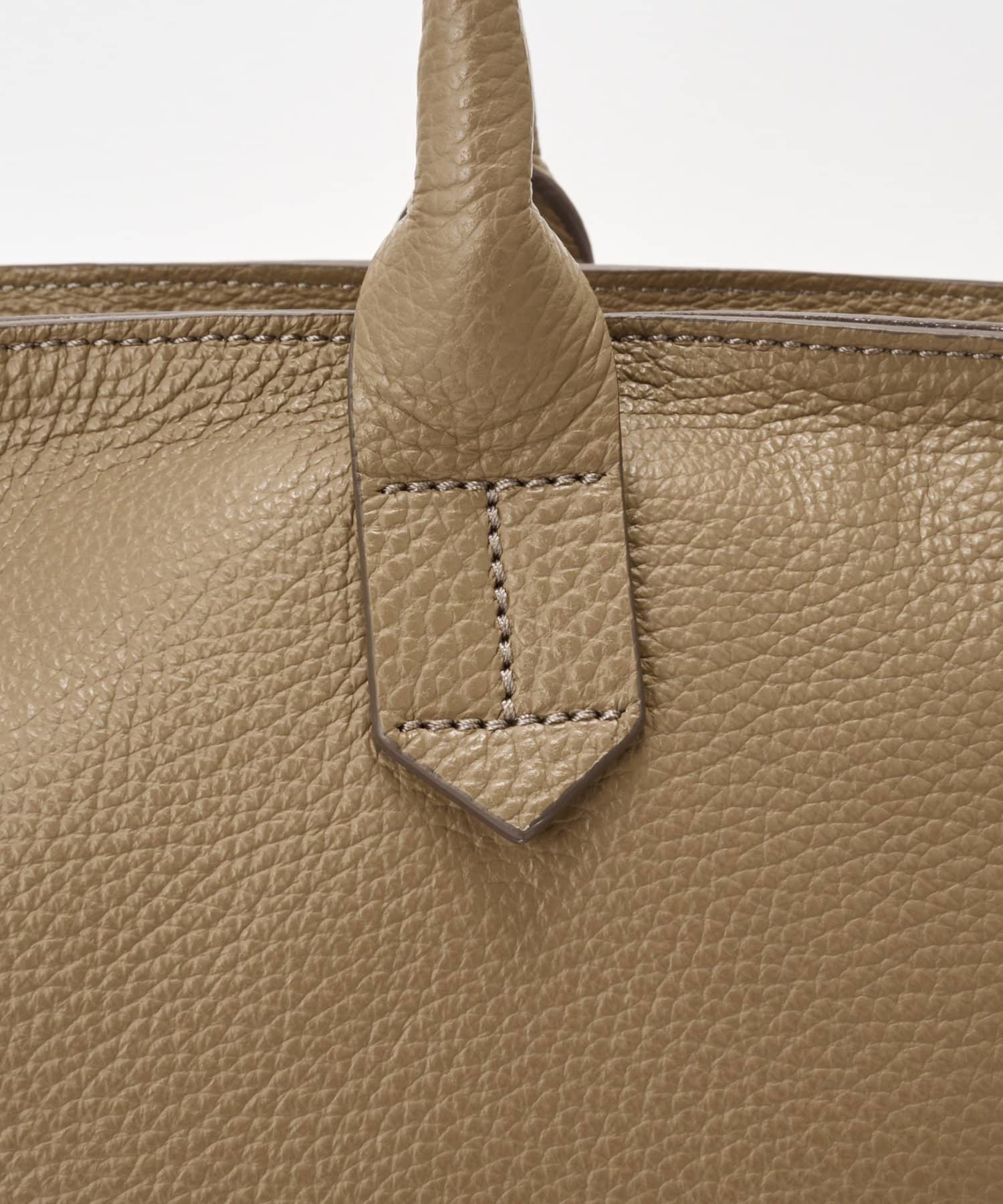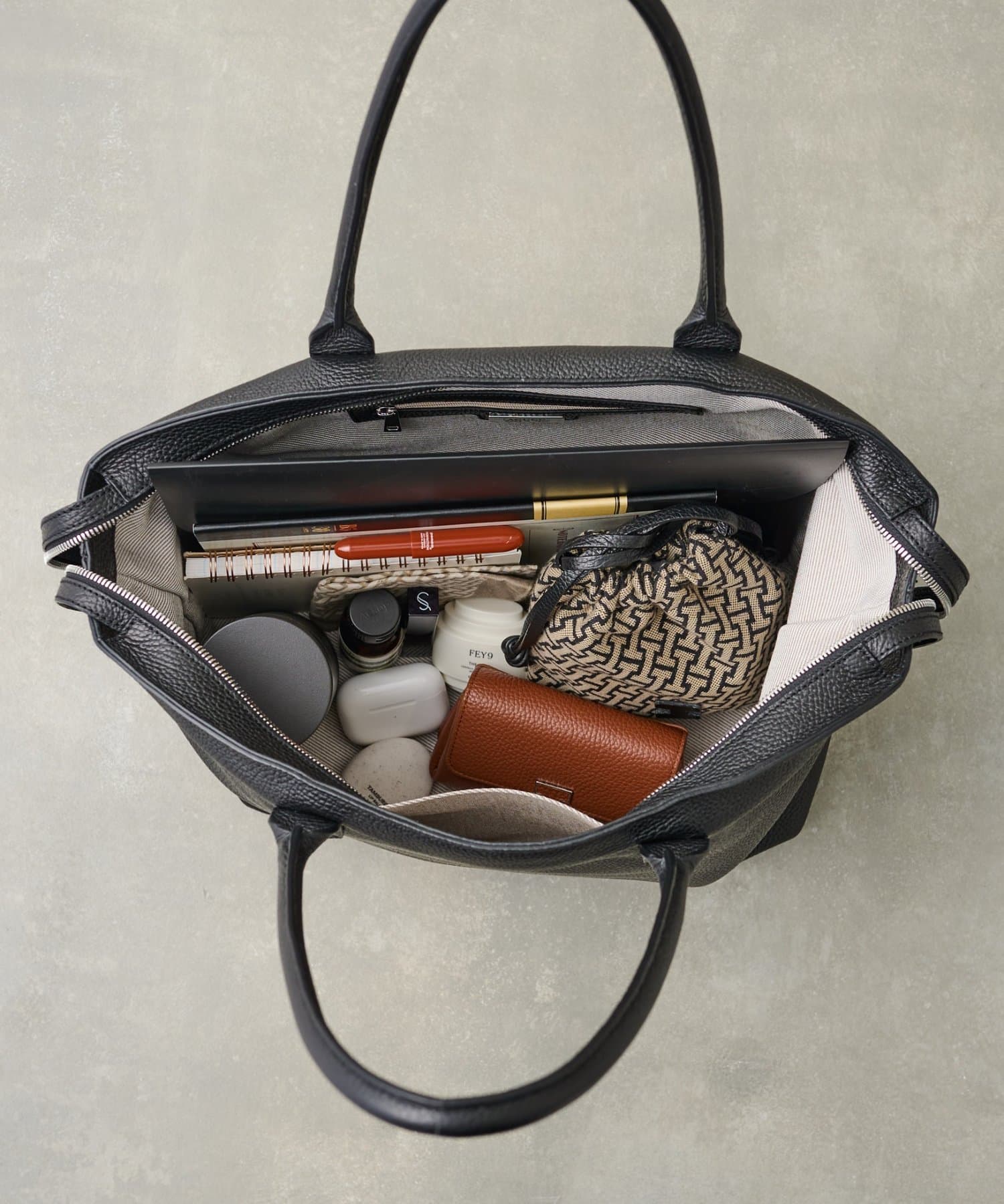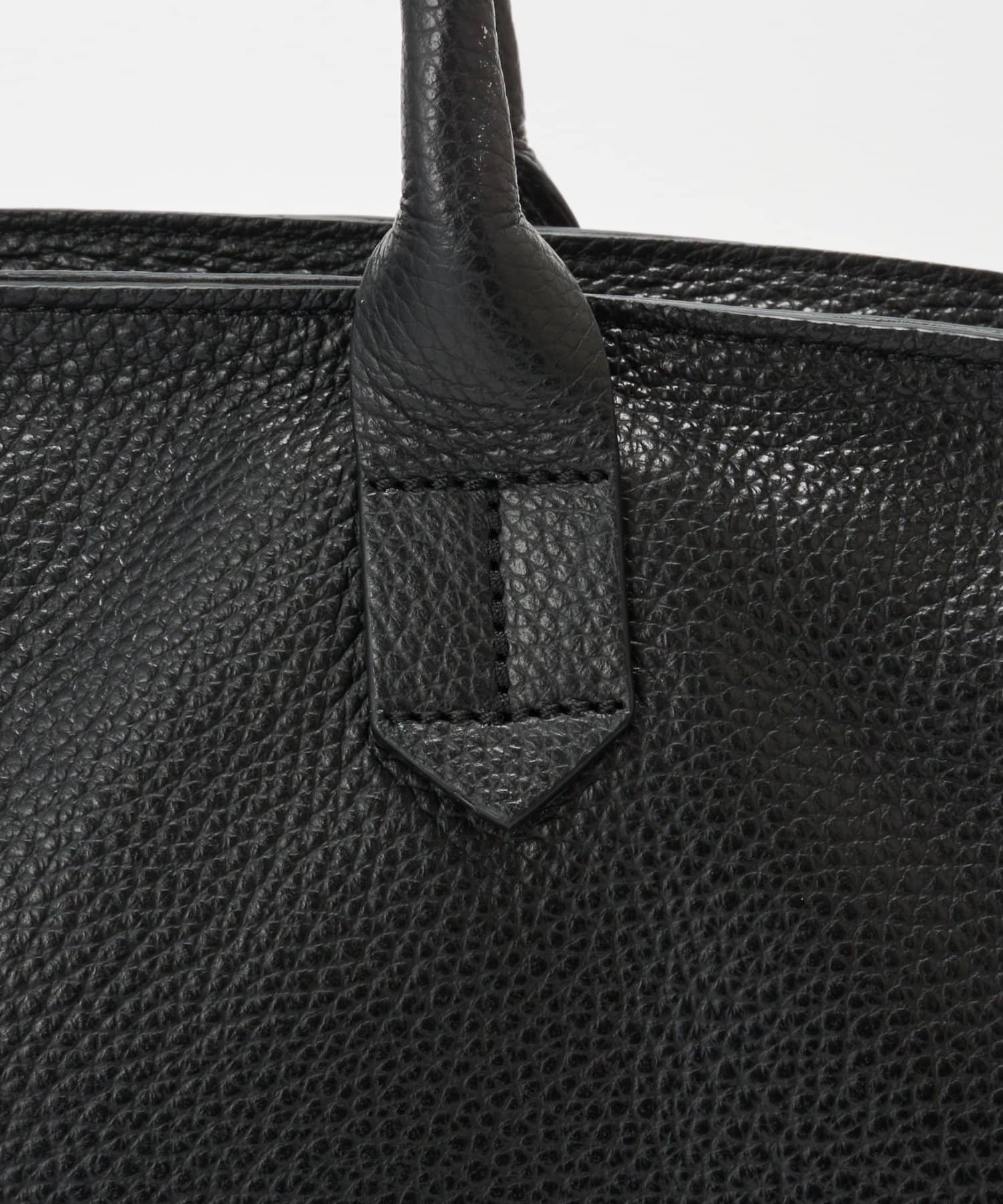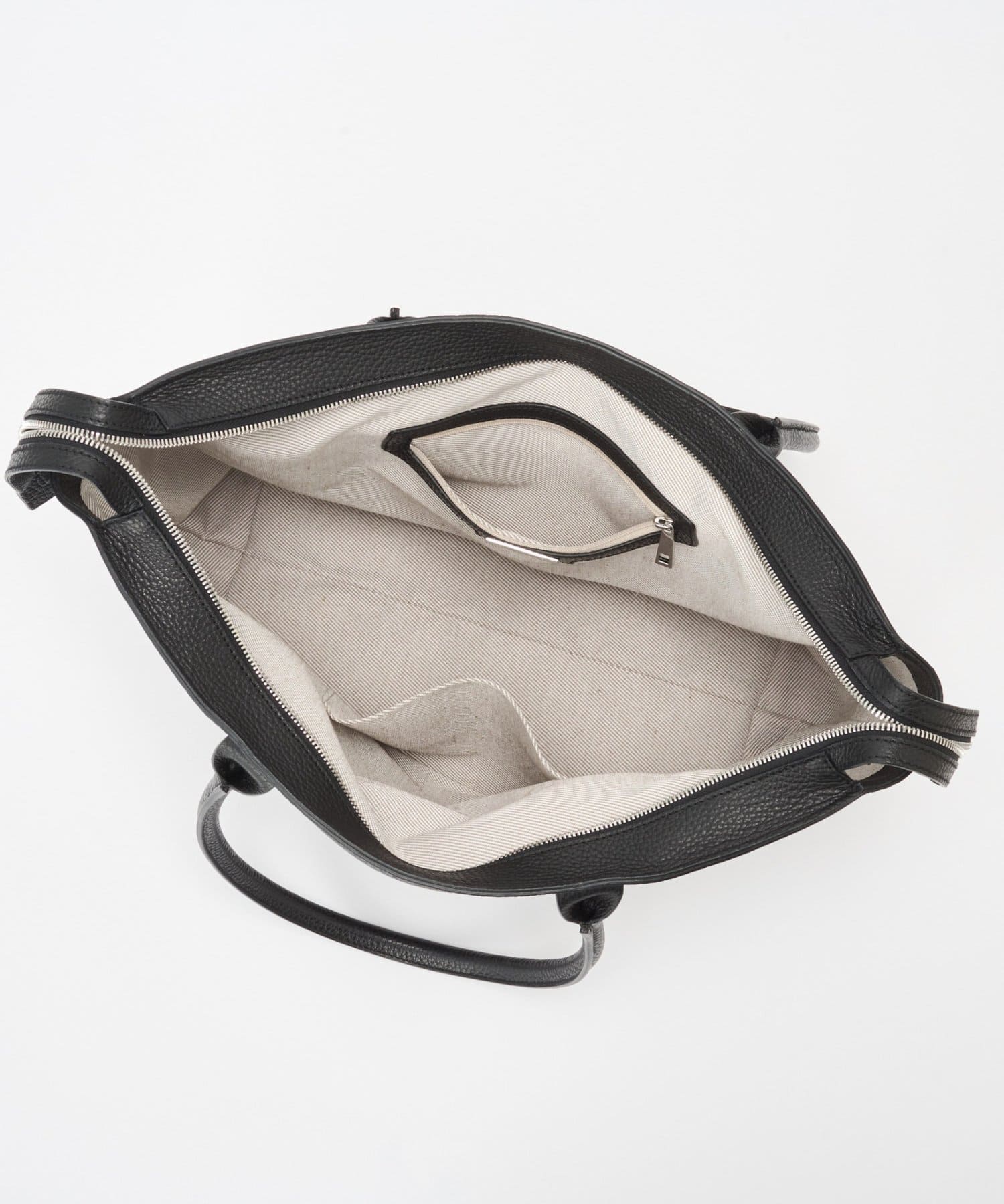 無駄をそぎ落したシンプルなレザートートで、スタイルやシーン問わず活躍すること間違いなしのアイテム。デザインはもちろん、内側にはオープンポケットとファスナー付きポケットを配置し、外での利用にも安心な底鋲付きと機能性も〇。開口部はファスナータイプで、テープを少し長めのデザインに仕上げたことで、ガバッと開きお荷物の出し入れもしやすい仕様に。