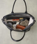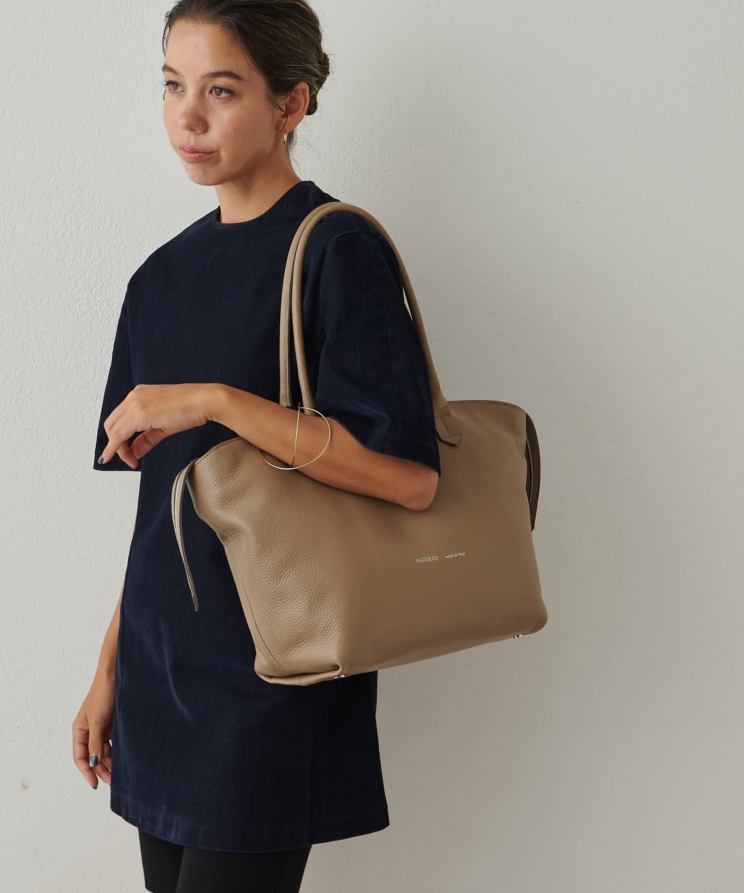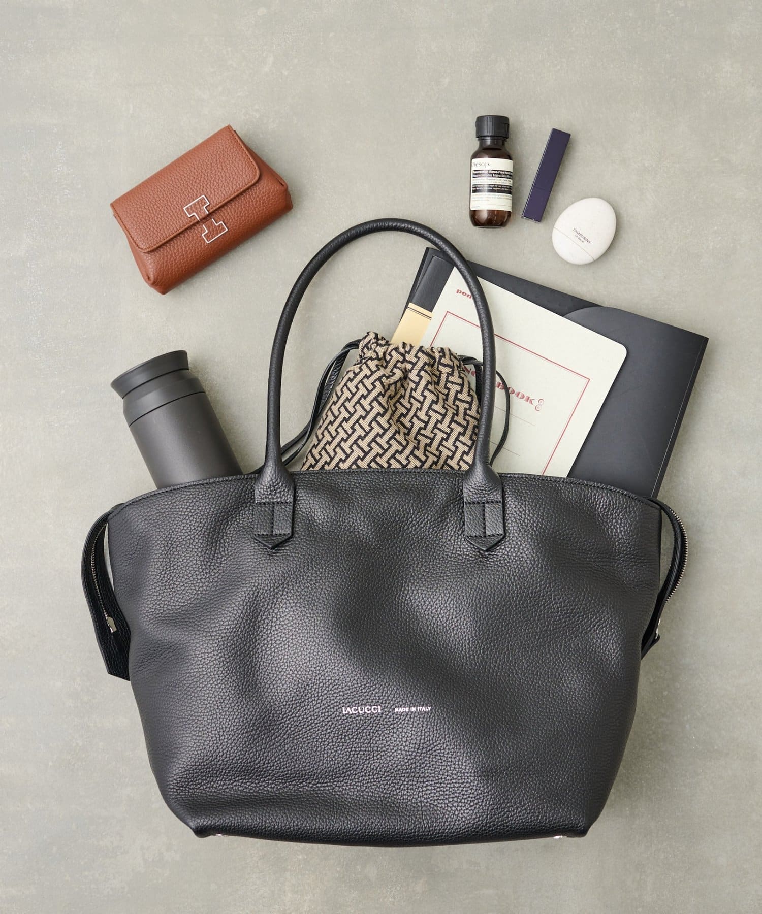 PCやA4サイズの書類も楽々収納ができるサイズで、通勤バッグとしてもおすすめ!たっぷりお荷物を収納した際にも肩掛けが叶う、長めのハンドルデザインも嬉しいポイントです。カラーはイアクッチで不動の人気を誇るベーシックカラーの「ブラック」「サンドベージュ」をご用意しました。