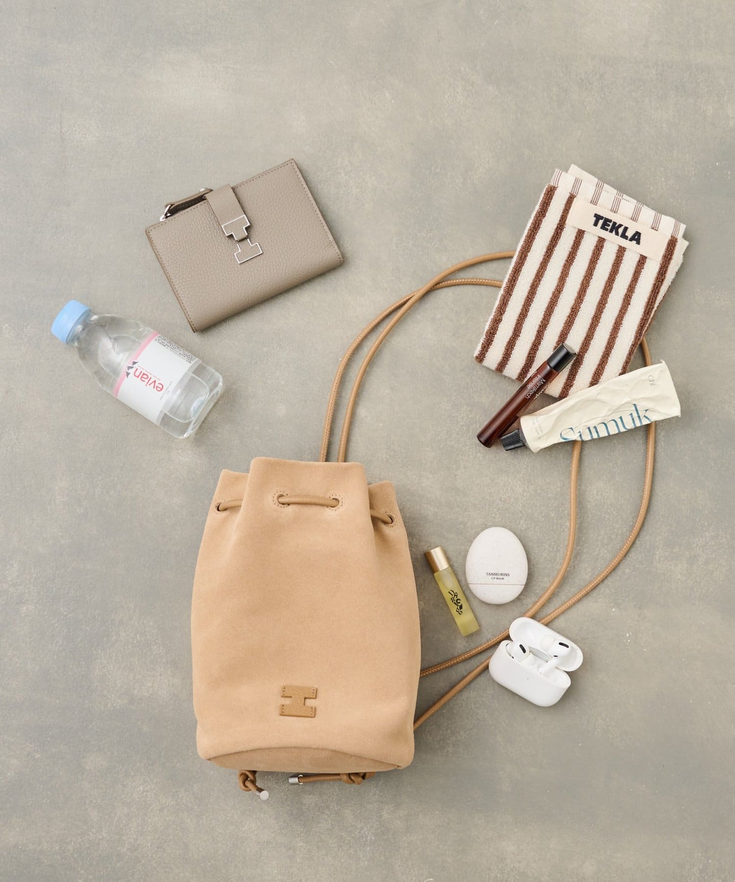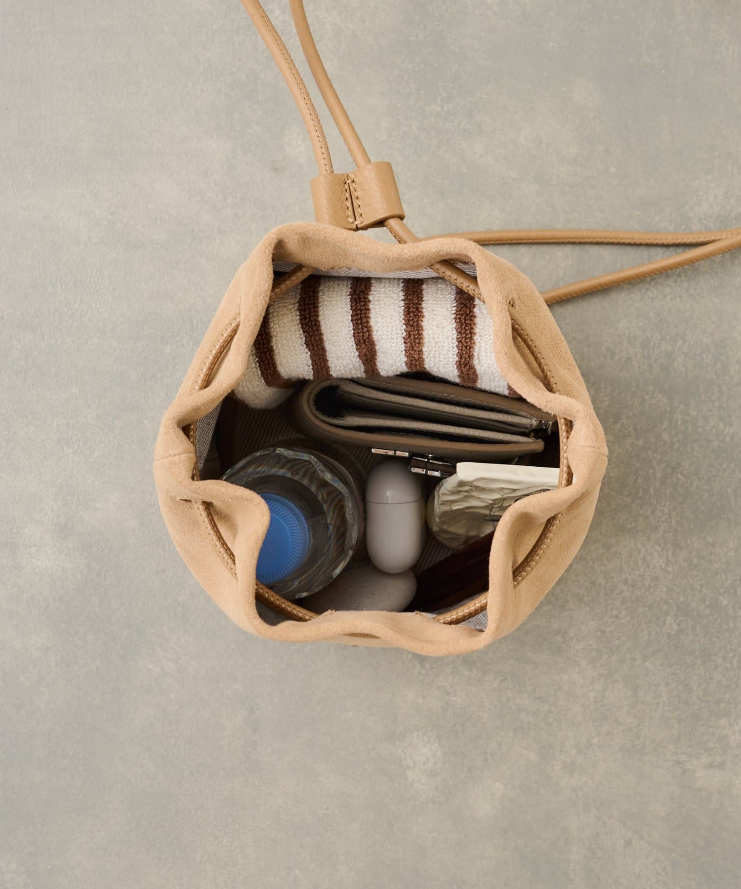 程よい抜け感をプラスしてくれるスエード素材は、普段のスタイルに合わせるだけでアクセントになる主役級のアイテムです。カジュアルからキレイめまで幅広いスタイリングとの相性も抜群!ショルダーストラップにはシボレザーをセレクトすることで、普段使いがしやすいよう細やかな配慮も。コンパクトなデザインながらもマチのあるバケツ型デザインで、ミニウォレットやハンカチ、イヤホン、リップなどの必需品に加え、小さめのペットボトルも入り、見た目以上の収納力も魅力のポイントです。