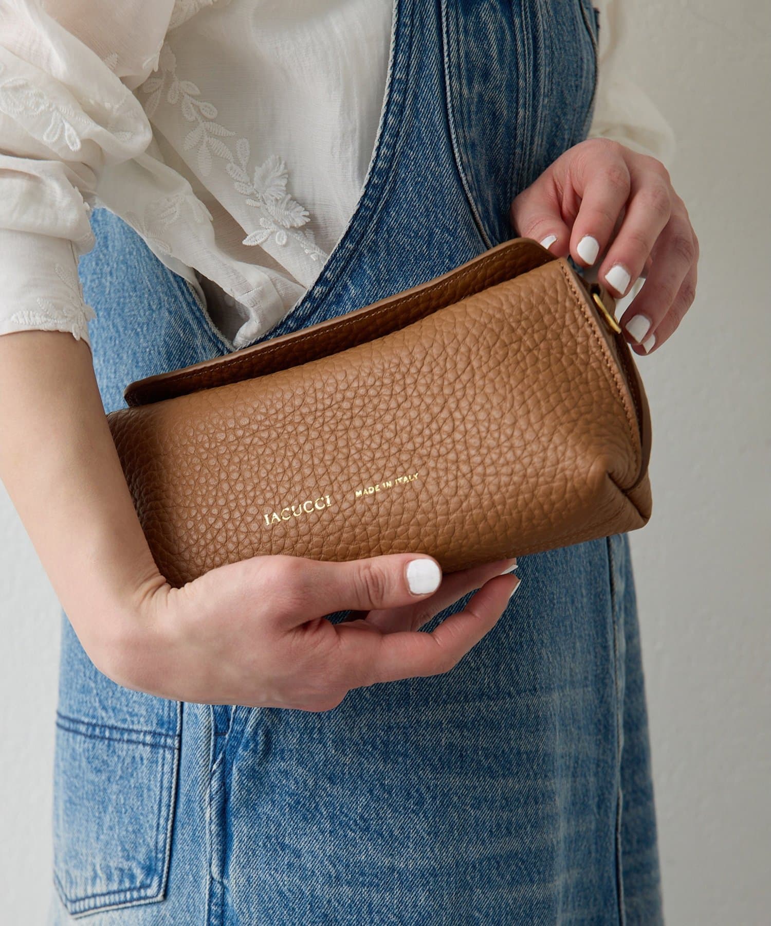 イアクッチでは、イタリア特許技術によって裏面にナッパ加工を施した、希少性が高いワンランク上のアルチェレザーをセレクト。手間を惜しまない工程を施すことによって、ふっくらとしなやかな質感と、美しいフォルムを保つ安定感を両立しています。上品な表情で高級感がありながら、実用性も兼ね備えた、細部にまで格を感じさせる素材です。