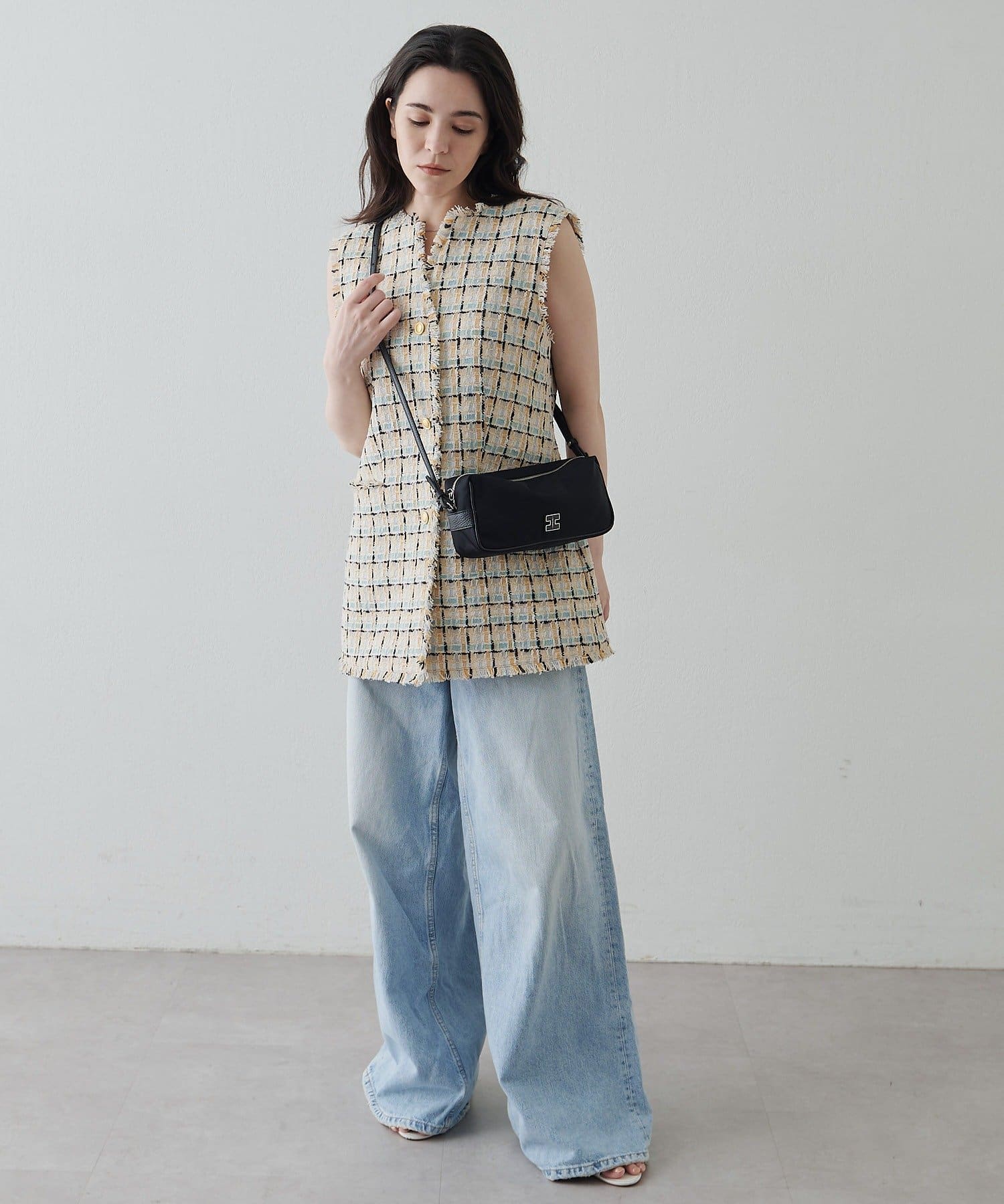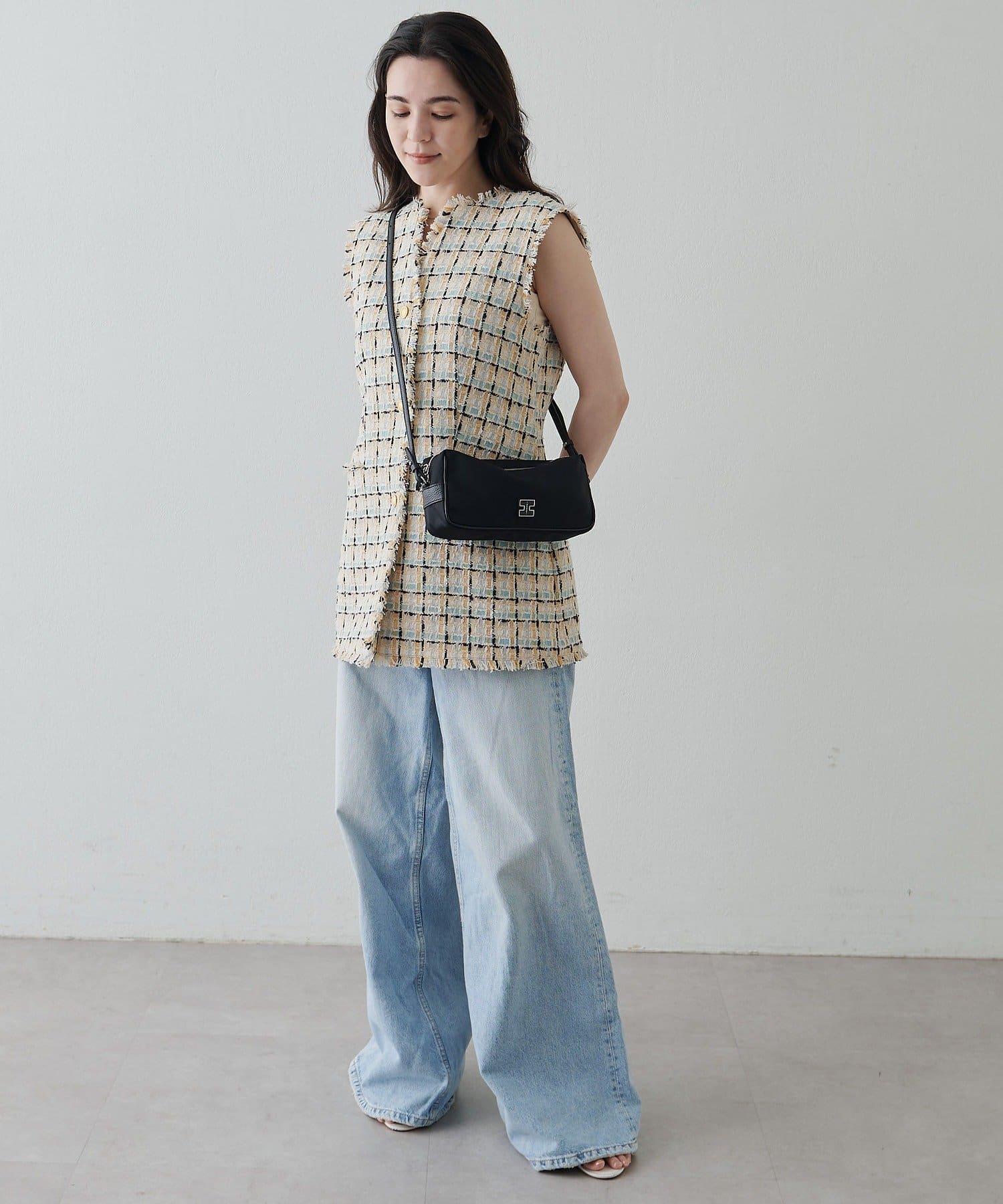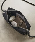 淵にはシボレザーのパイピングを施したことで、置いた時の安定感も抜群。 荷物を収納しても美しいシルエットをキープしてくれる、使い心地の良さも兼ね備えたデザインです。開口部はファスナー仕様で、バッグの中が見やすく出し入れもスムーズ。コンパクトながらマチ幅もあり、2つ折り財布やリップ、ワイヤレスイヤホン等が収まるサイズ感。ワンマイルバッグとしてはもちろん、大きめバッグと2つ持ちにもおすすめです。