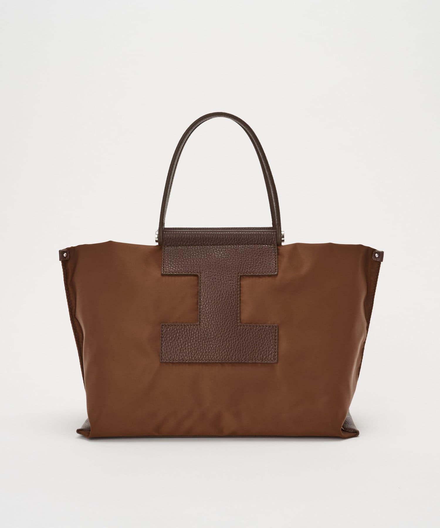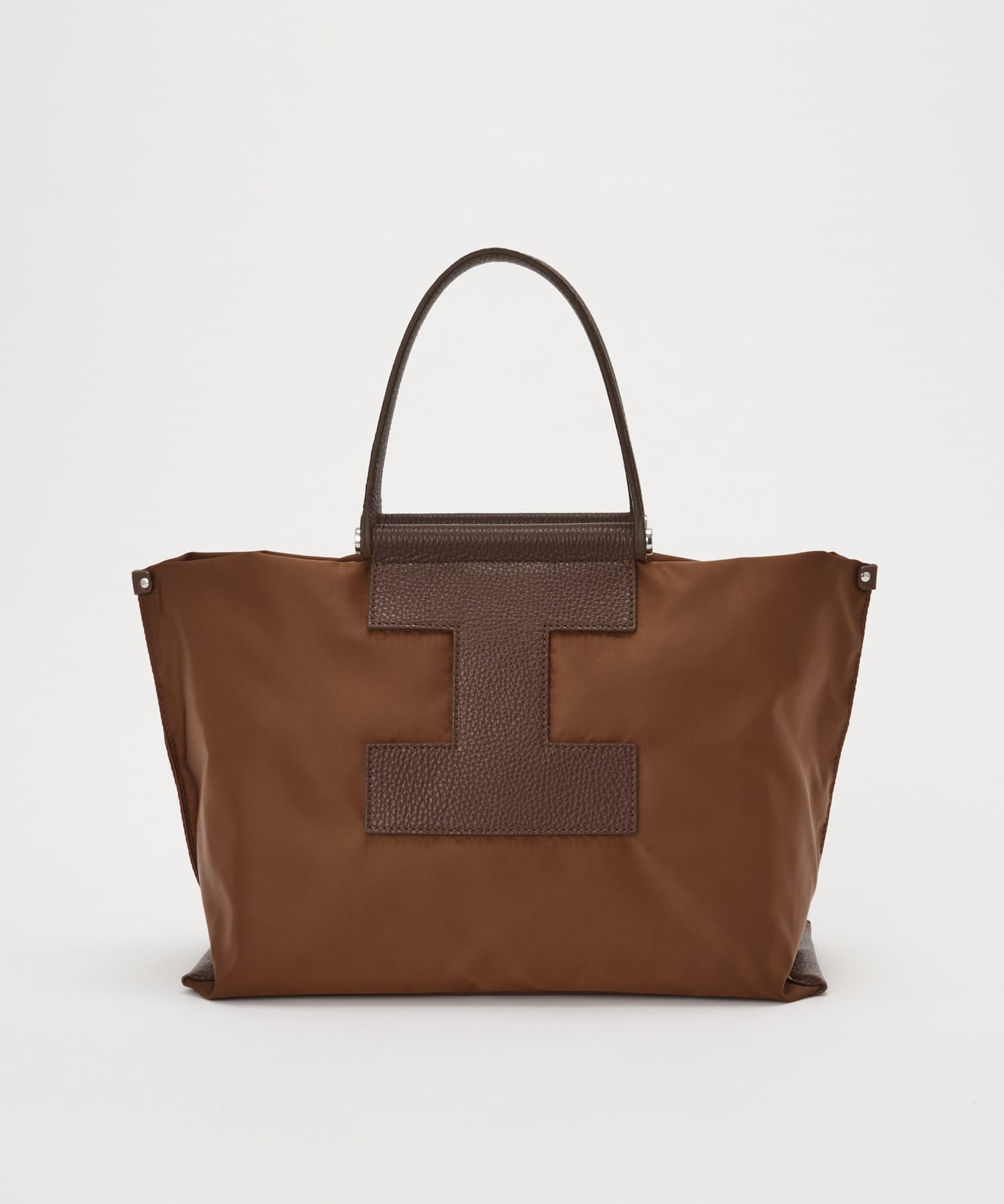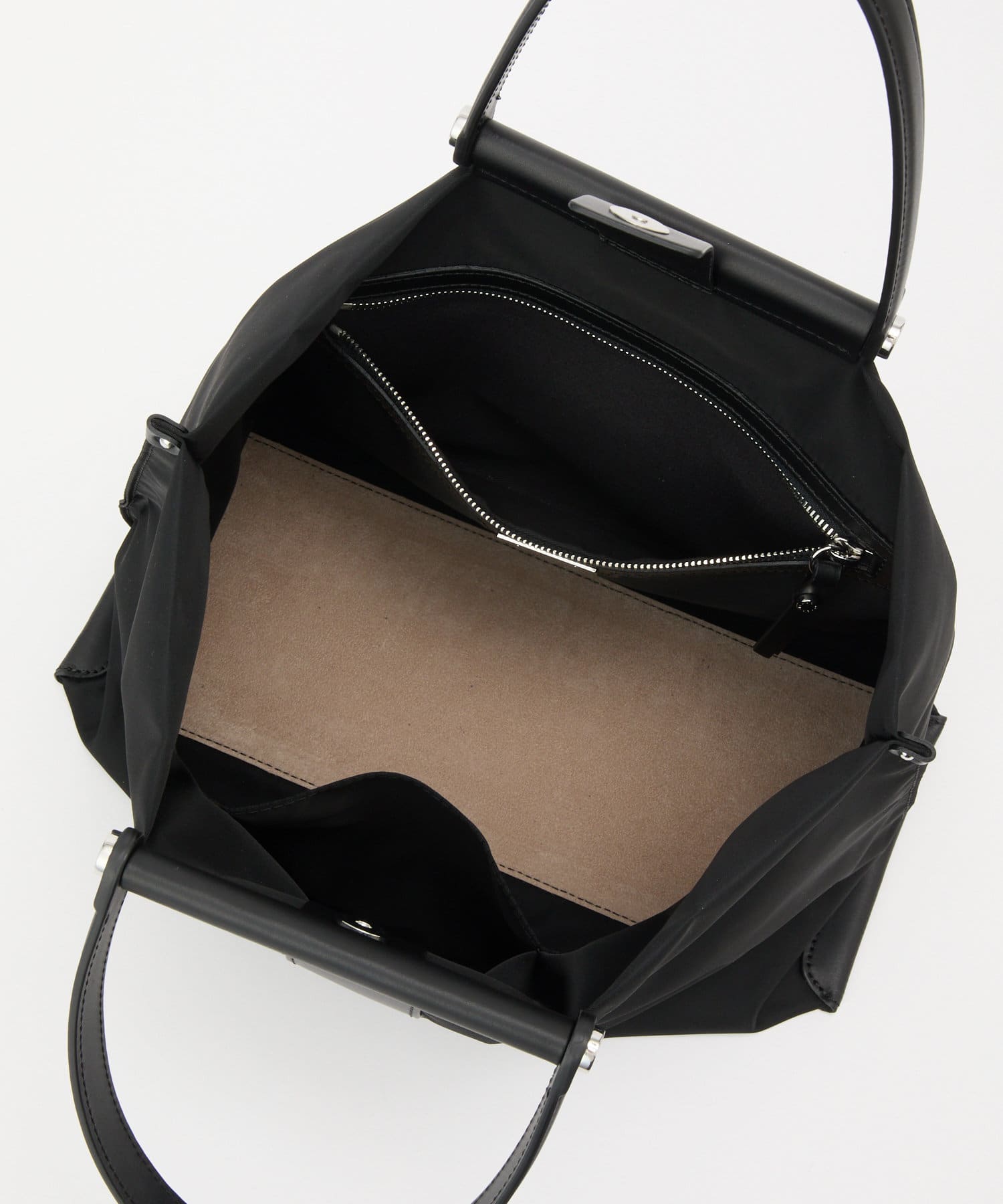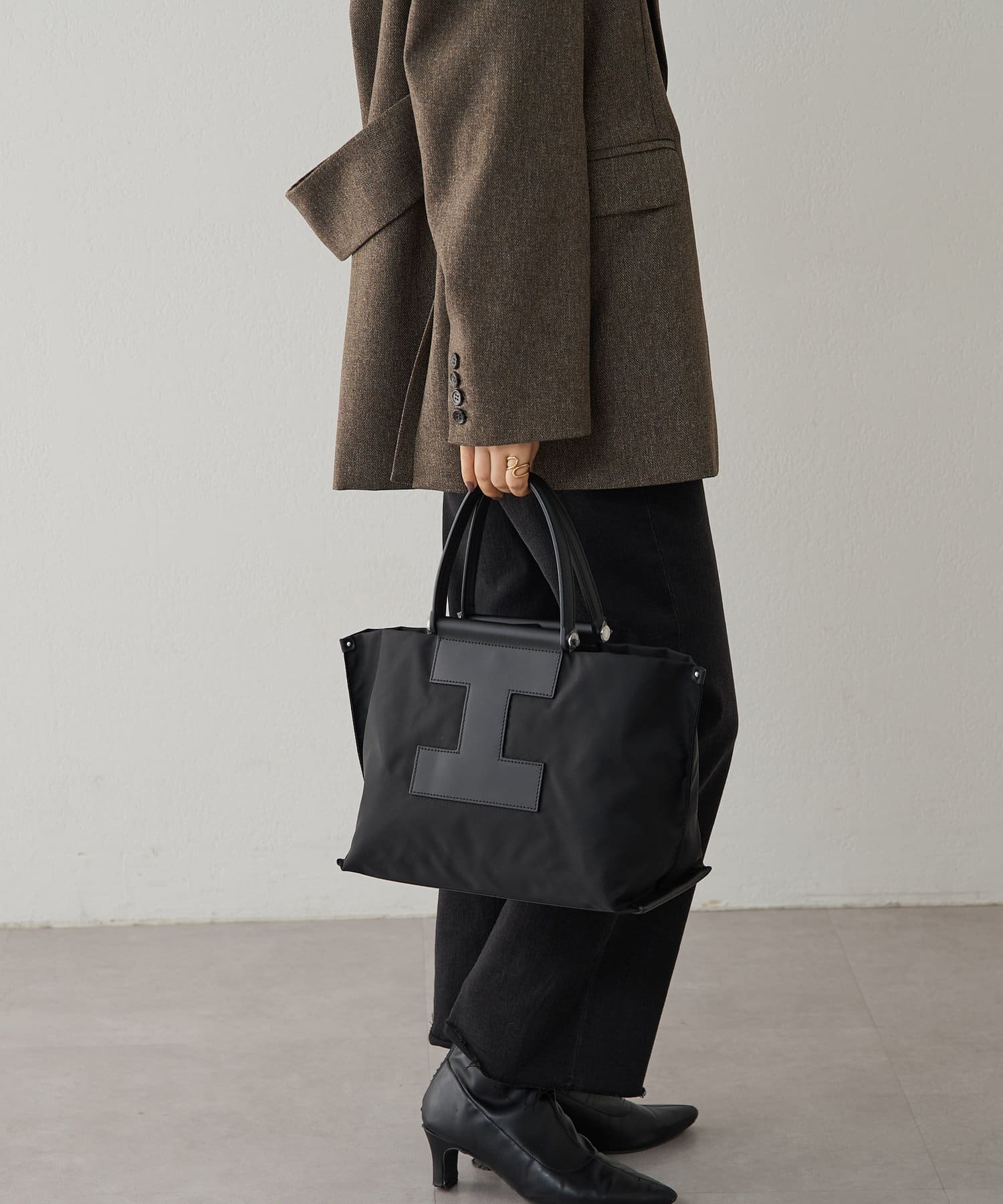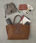 上質なイタリアンレザーとの組み合わせで、カジュアルになりすぎずエレガントな印象に。きれいめスタイルにもハマる大人のナイロントートに仕上がりました。