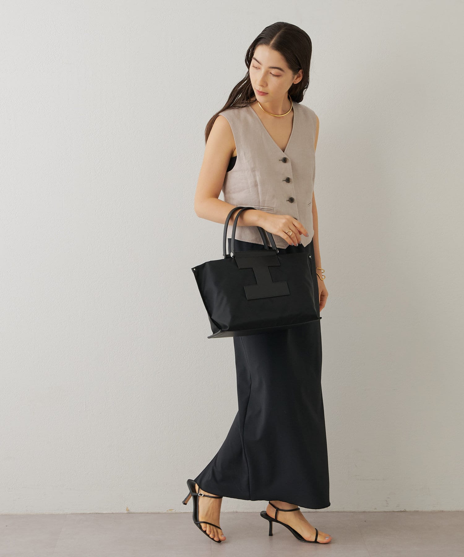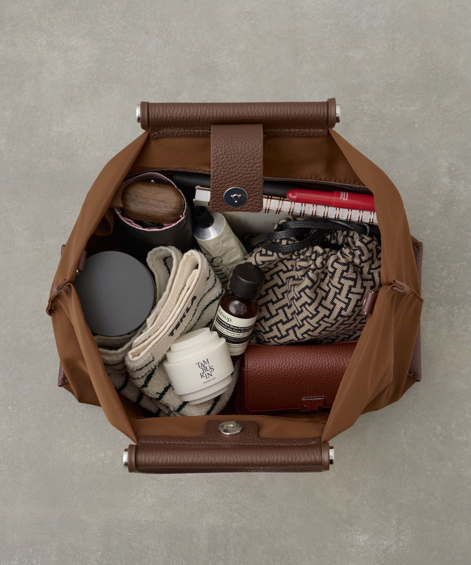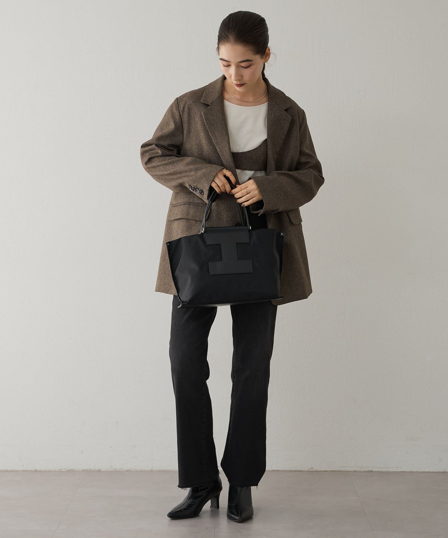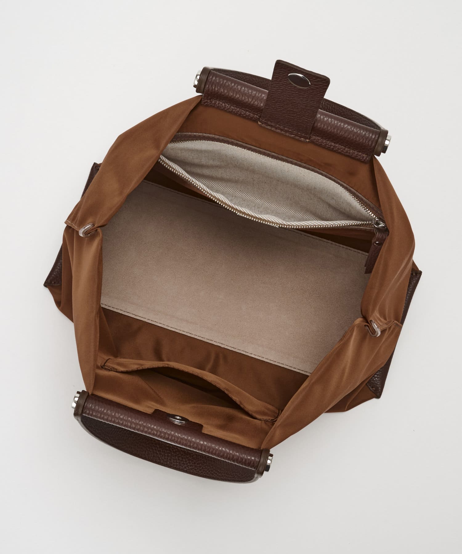 上質なイタリアンレザーとの組み合わせで、カジュアルになりすぎずエレガントな印象に。きれいめスタイルにもハマる大人のナイロントートに仕上がりました。