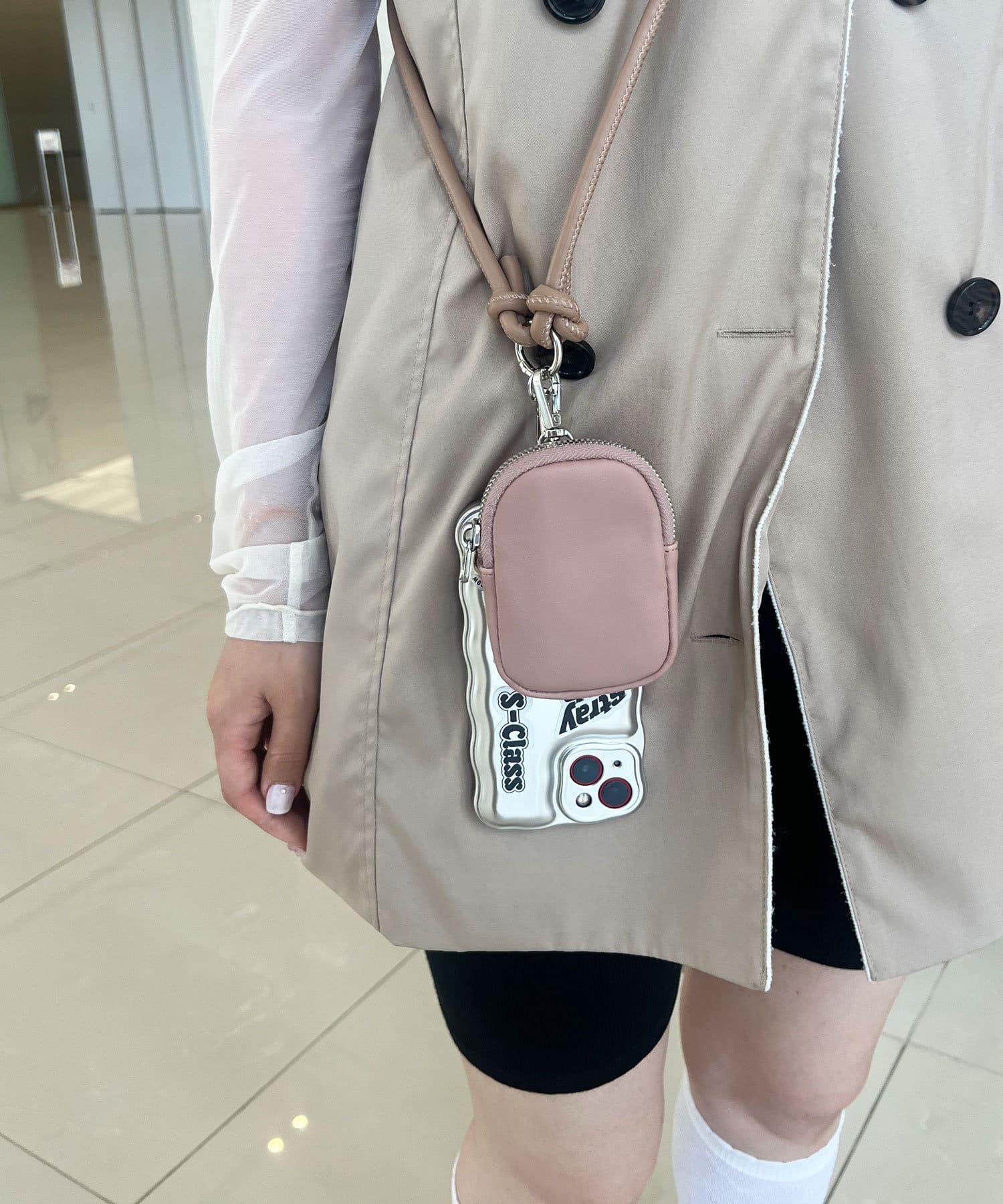 購入場所:店舗ずっと欲しいと思ってたスマホショルダーを購入しました。カバンにスマホを入れていると取り出すときに手こずってしまいがちでしたが、ショルダーならすぐにスマホを使えます。色もベージュでお洋服に合わせやすいです。また、小さなポーチもついているので鍵を入れたり様々な用途に使えます。