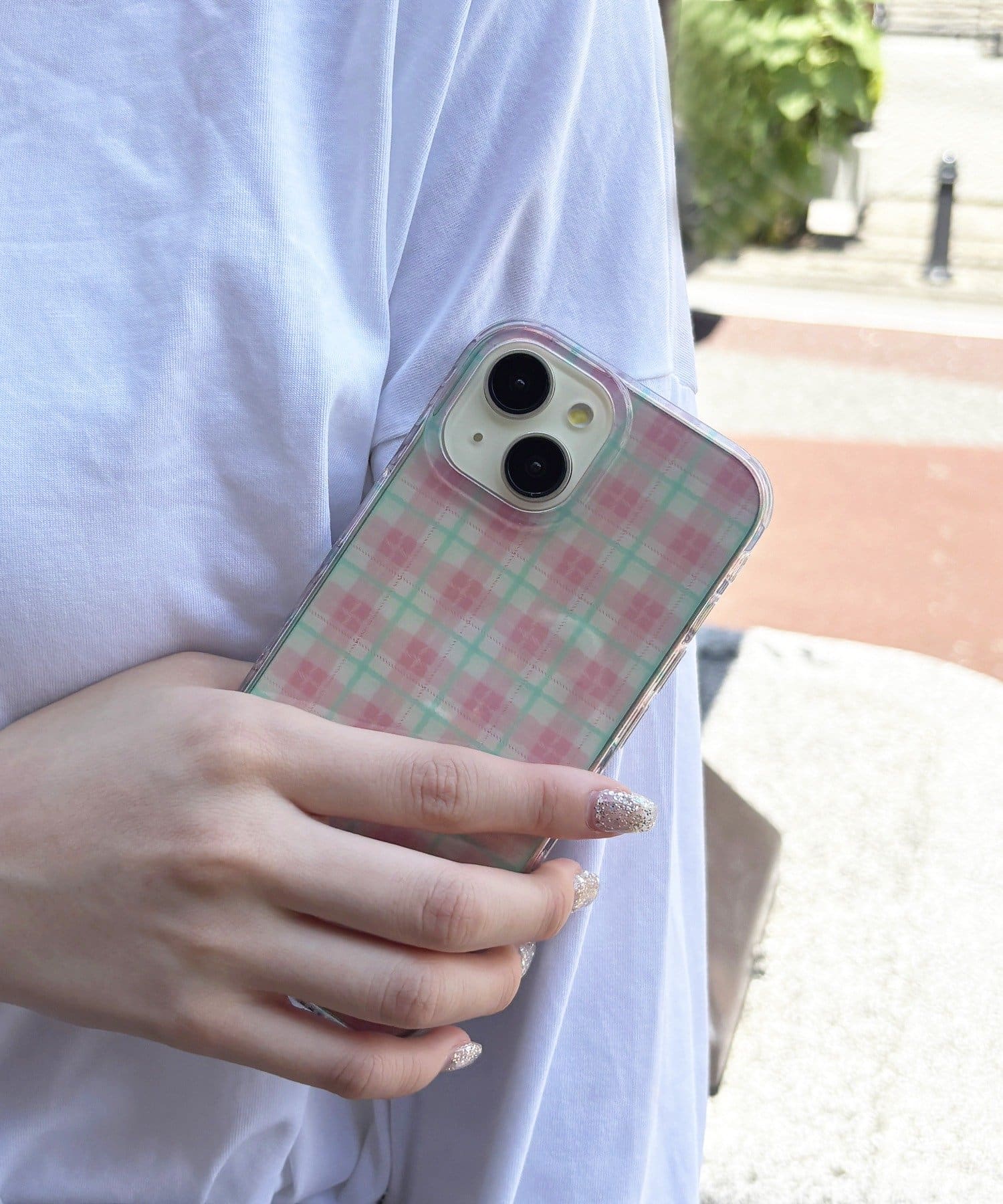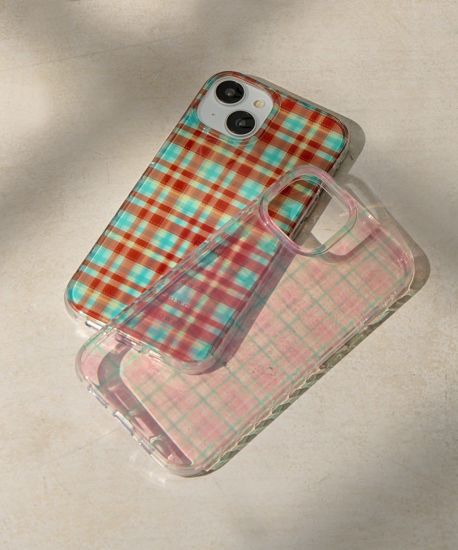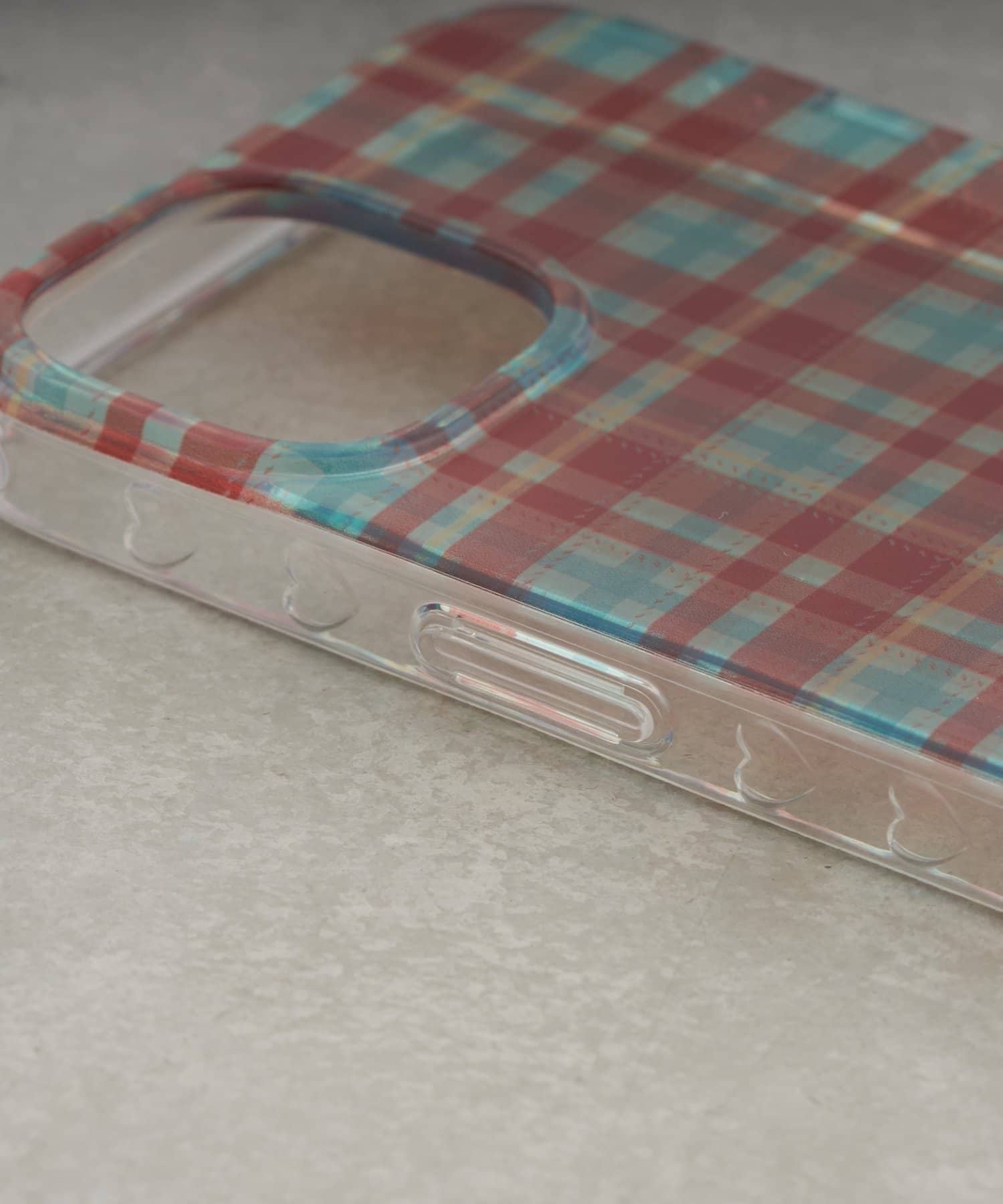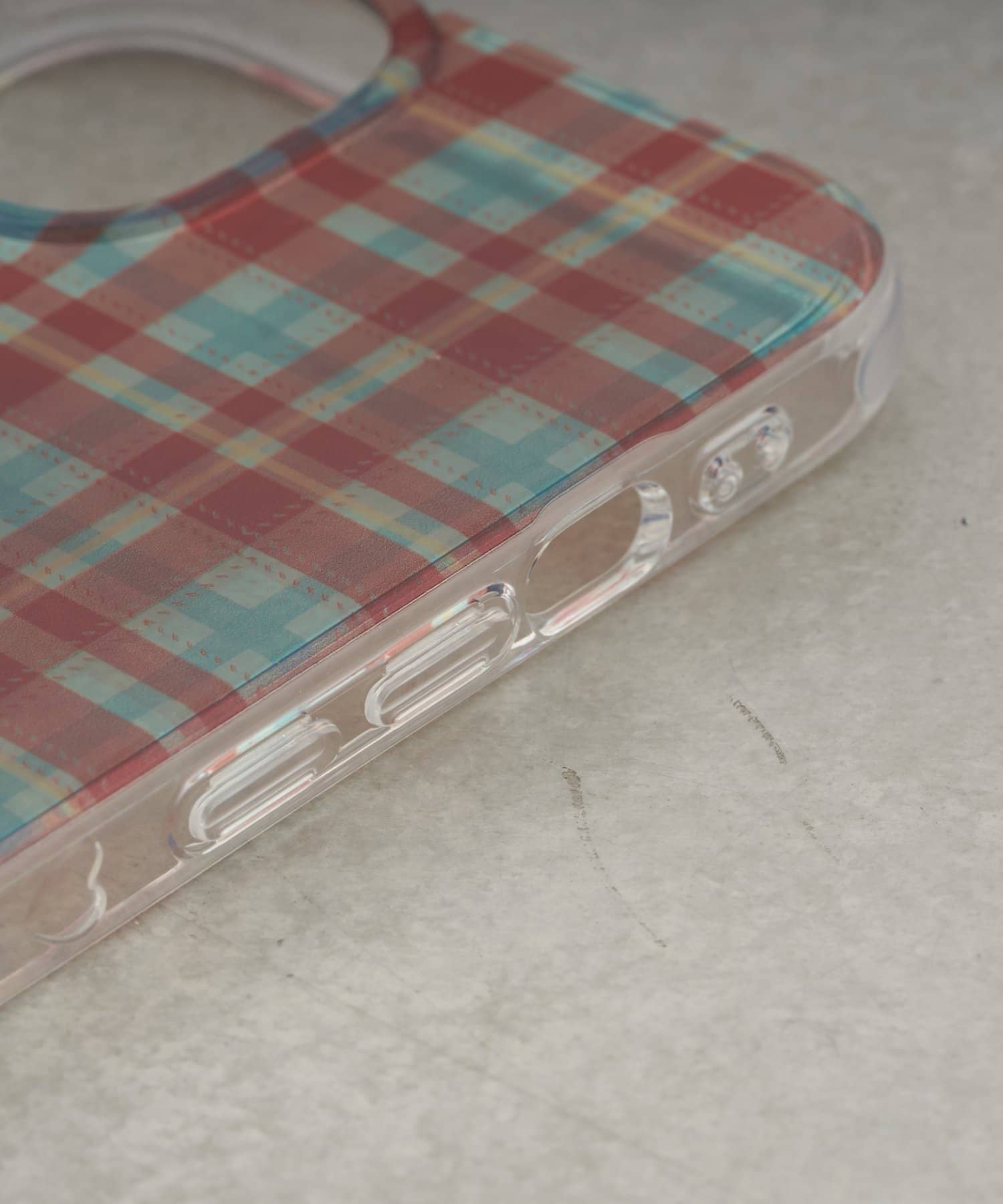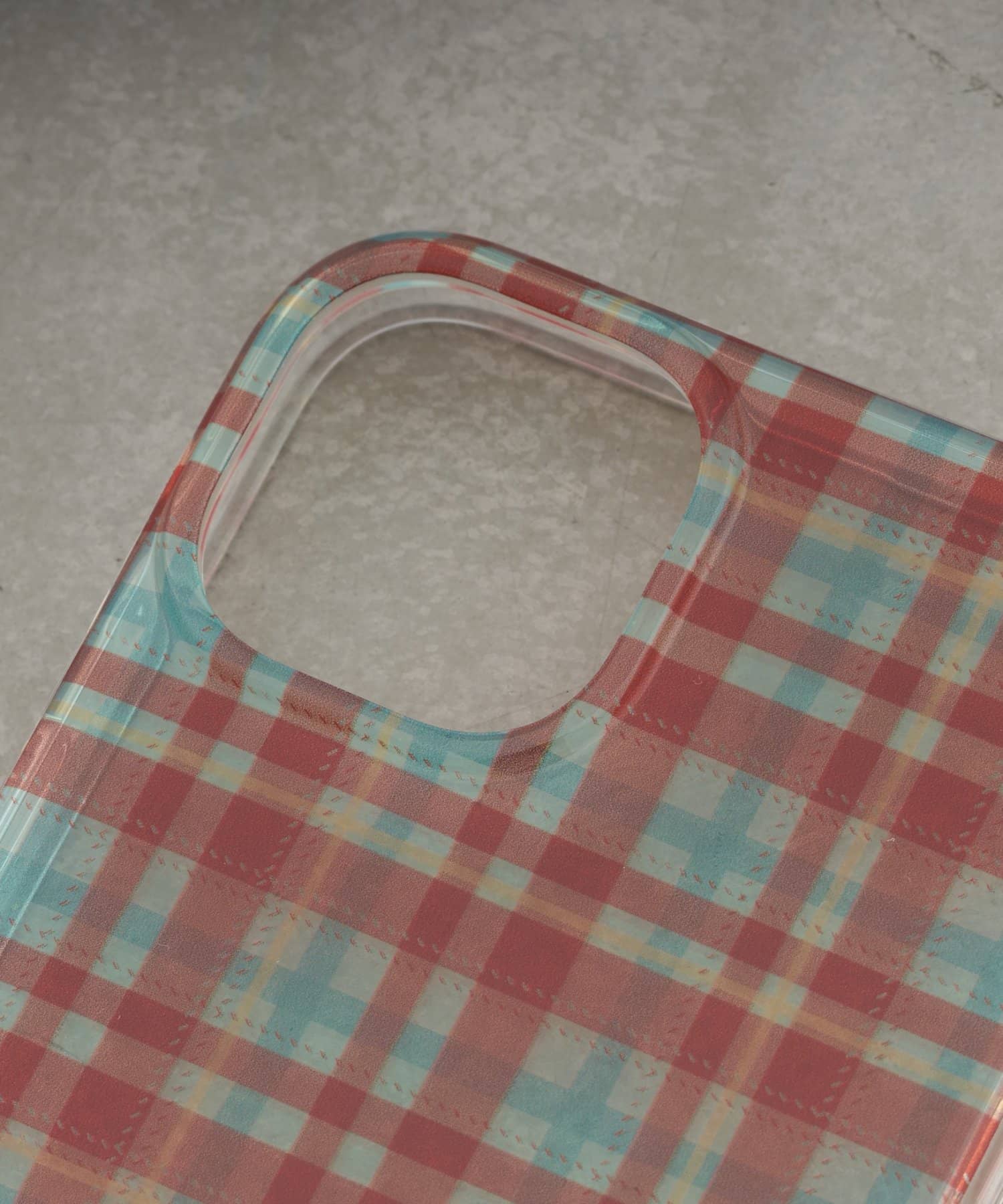 透け感のあるチェック柄で、ケータイの元の色も見えます。