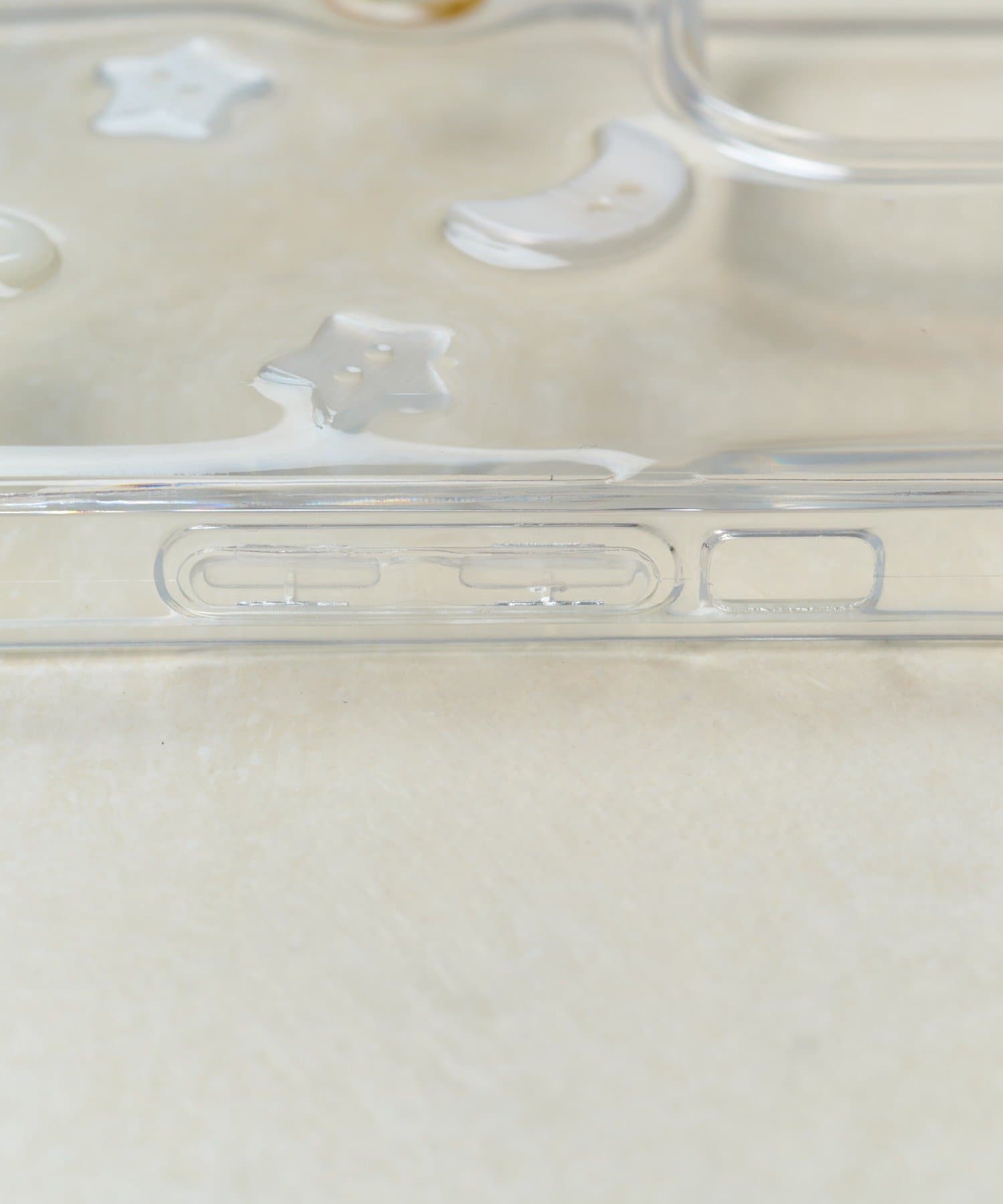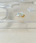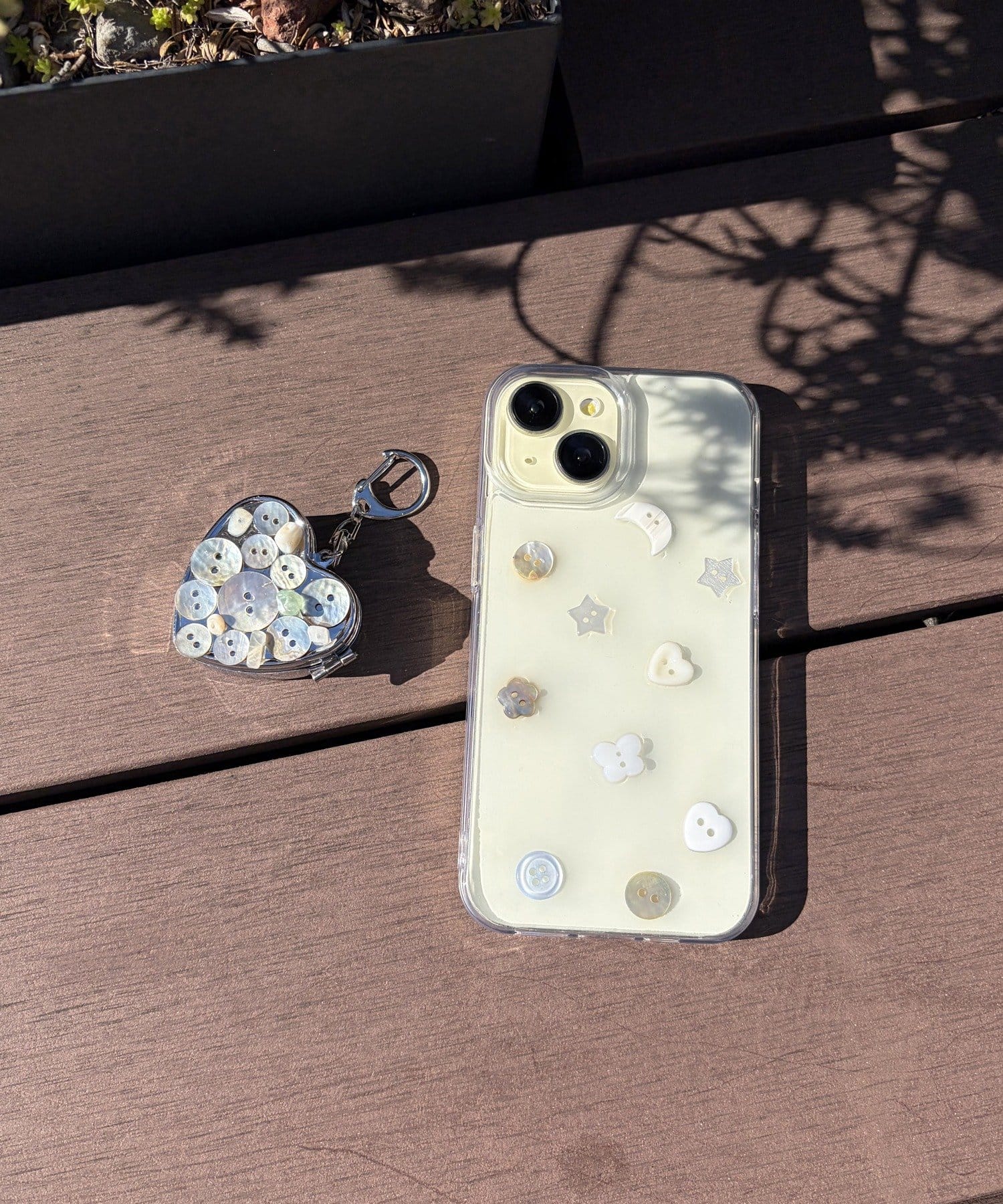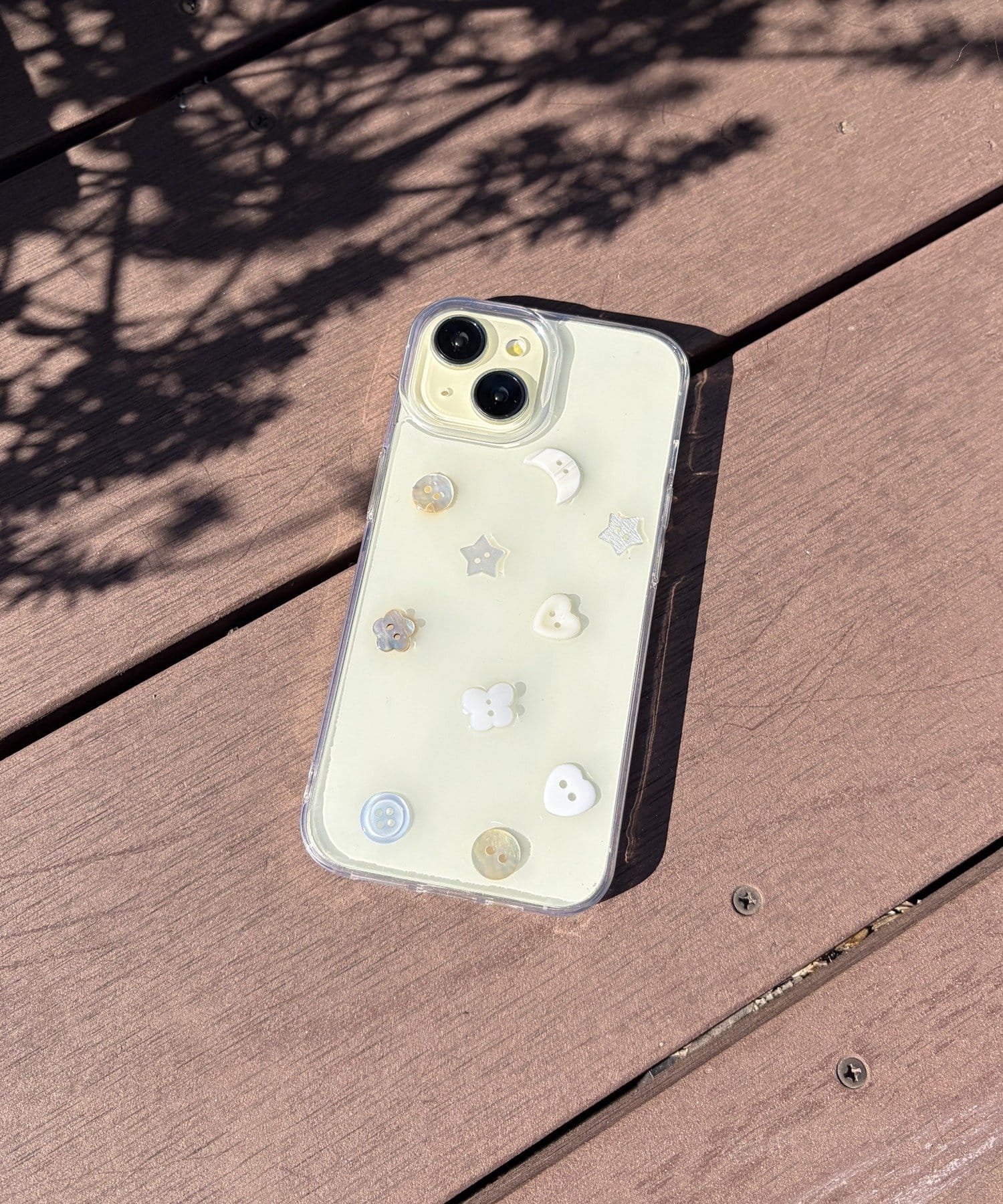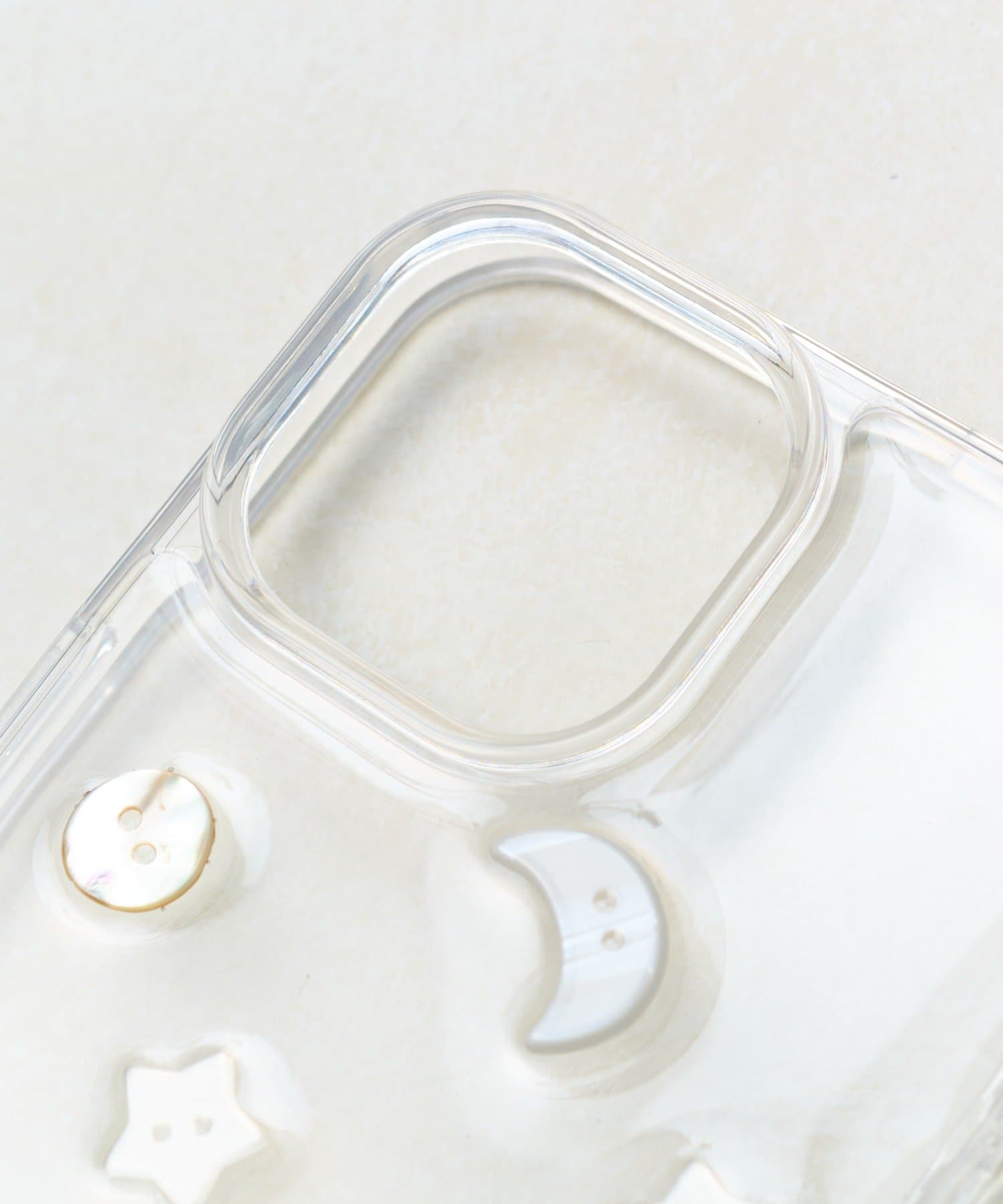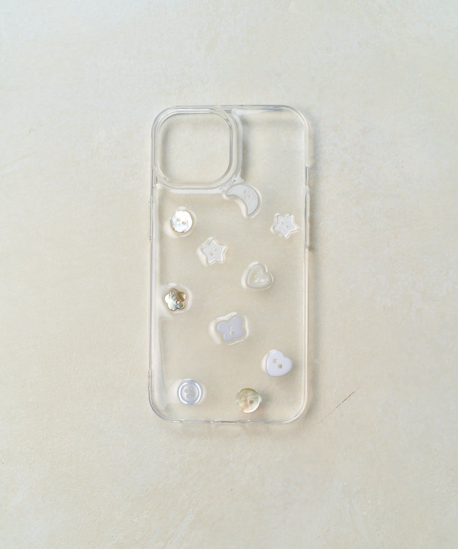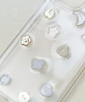 クリアケースの上に、月、星、ハート、お花といった様々な形のボタンをランダムにあしらいました。