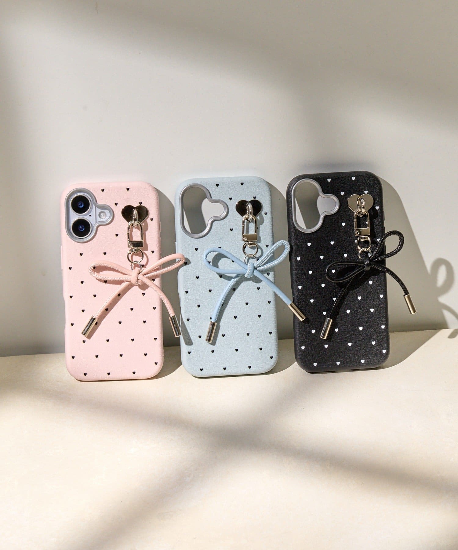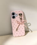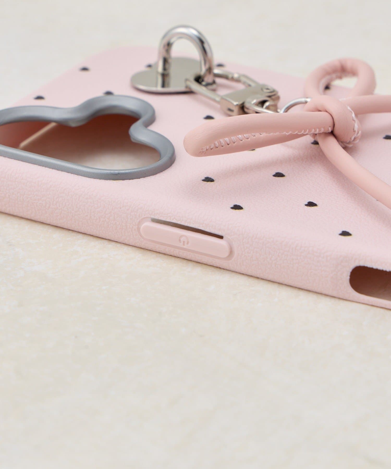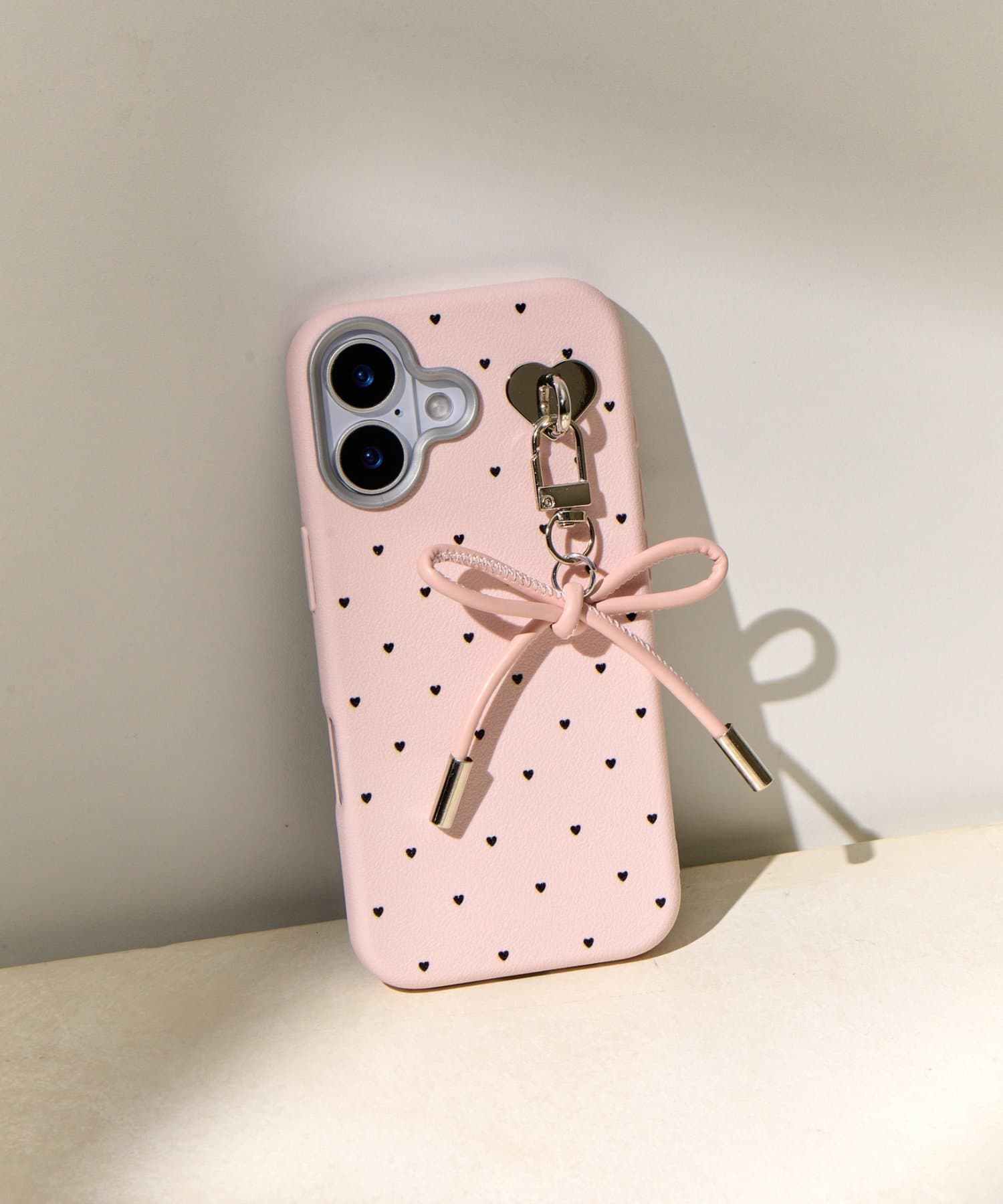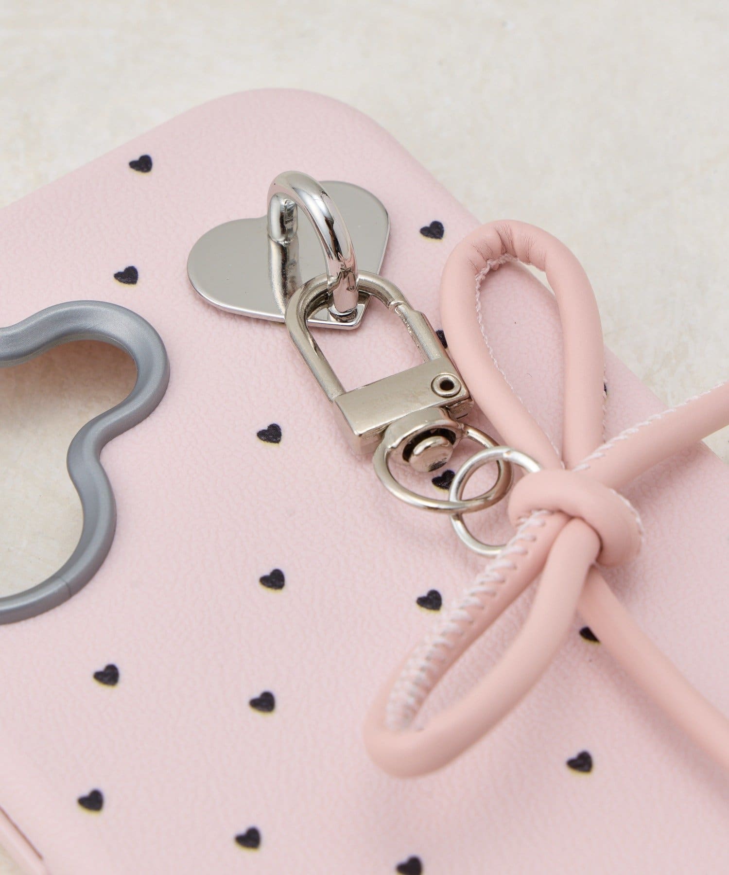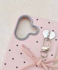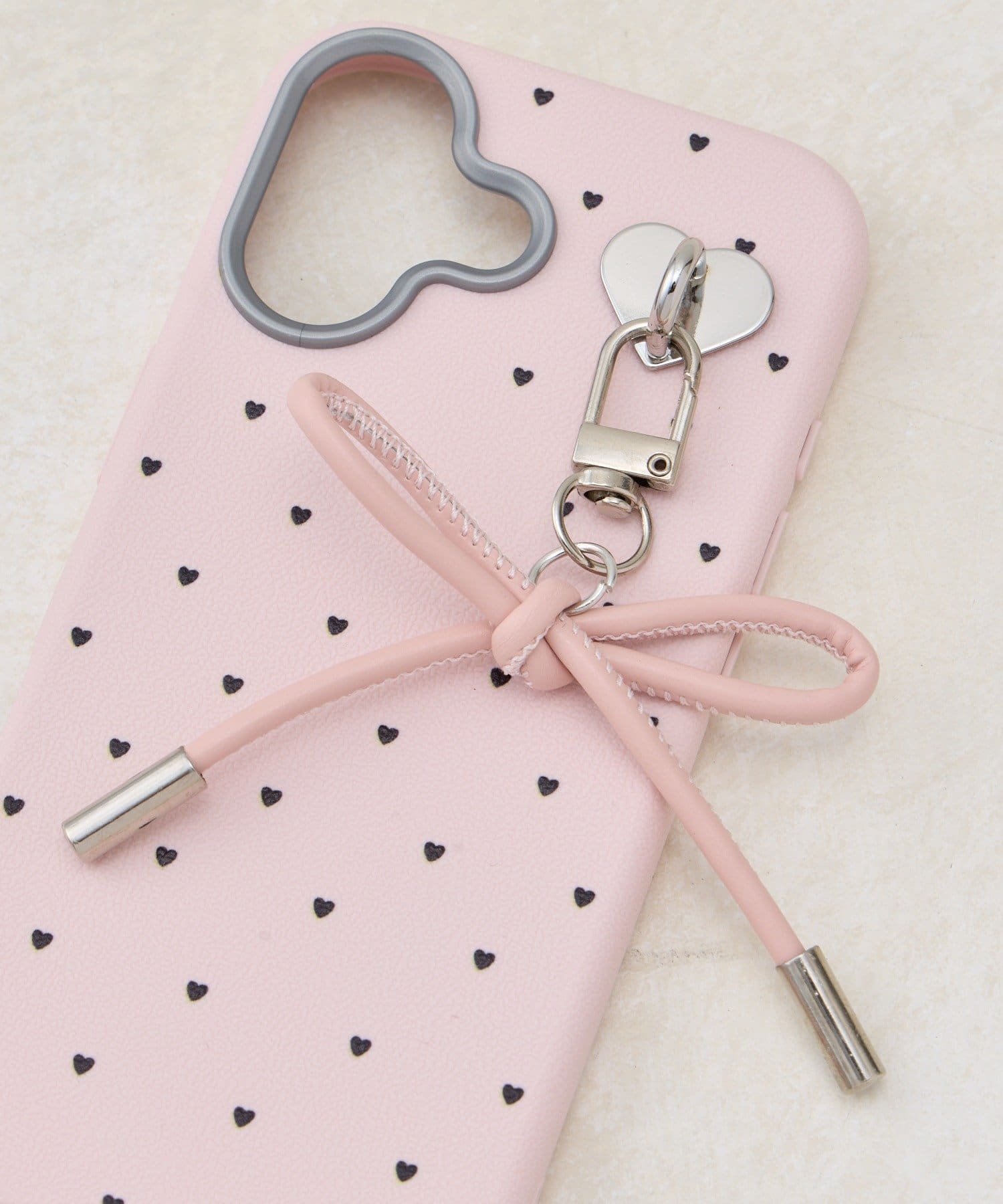 目を惹くのは、ケースとお揃いカラーの大きなリボン。チャームは取り外しも可能です