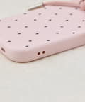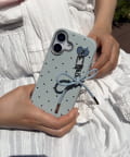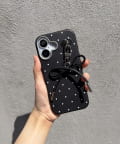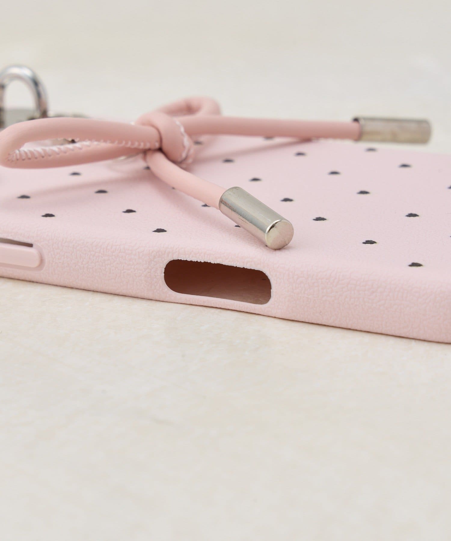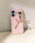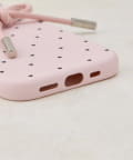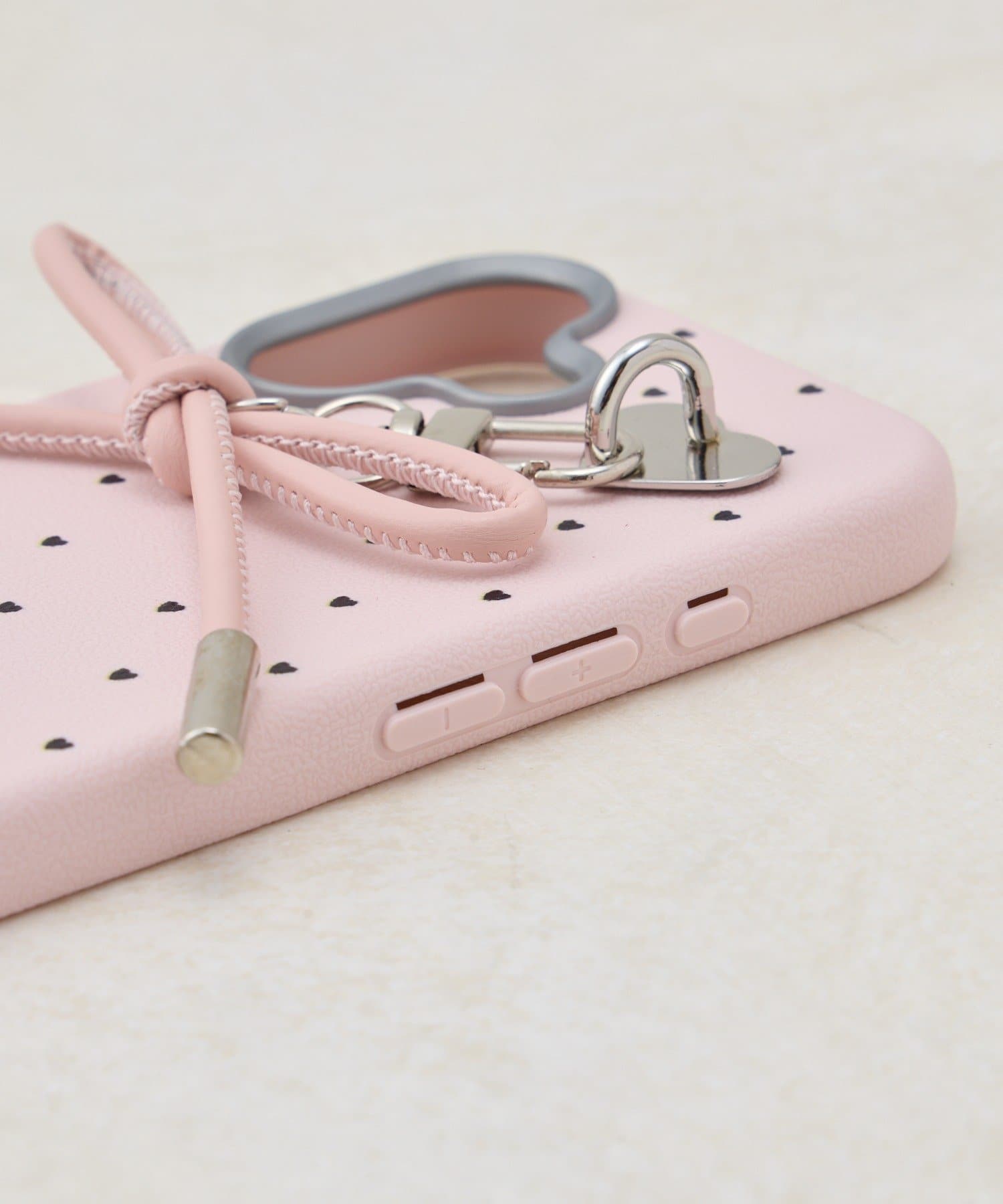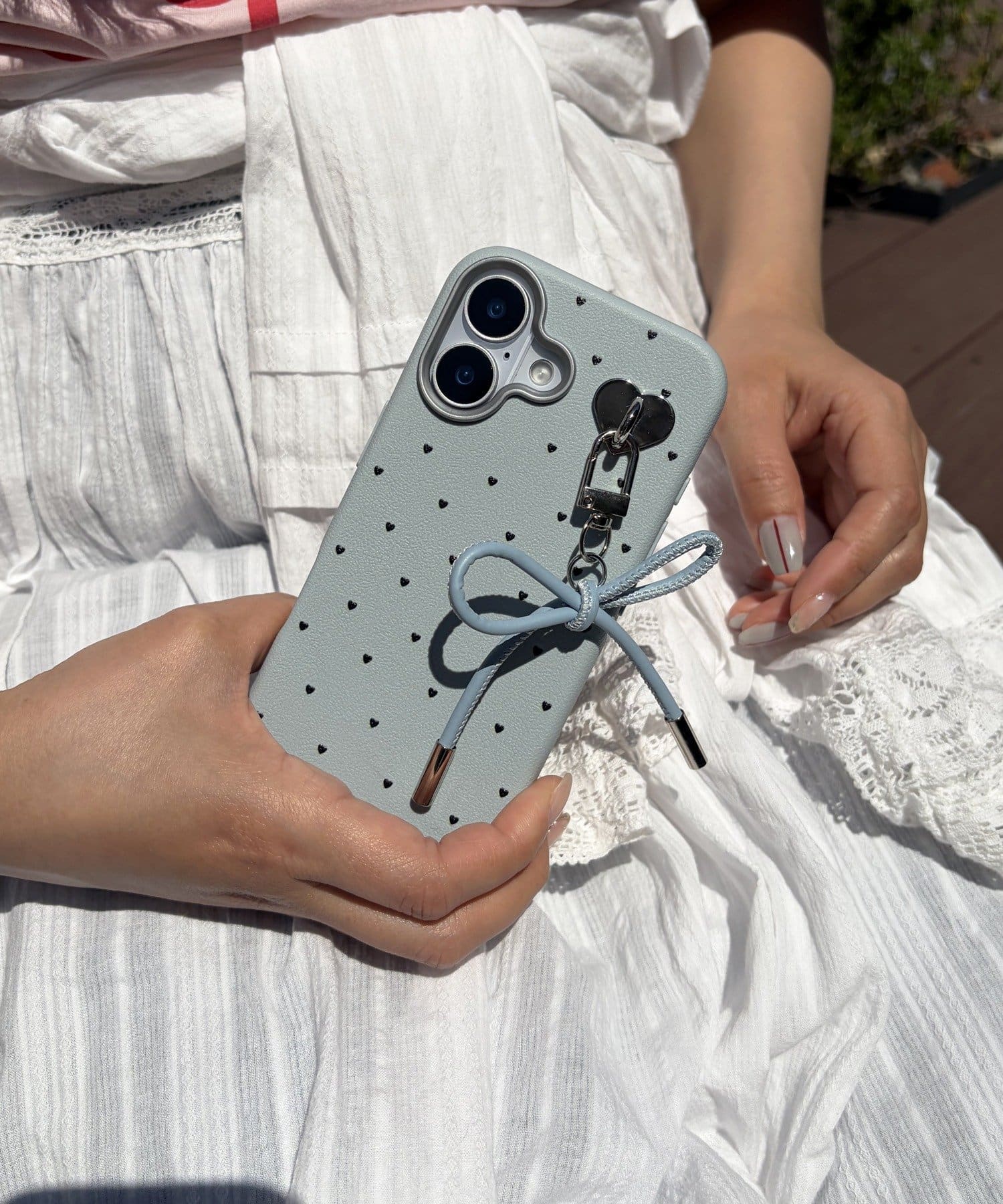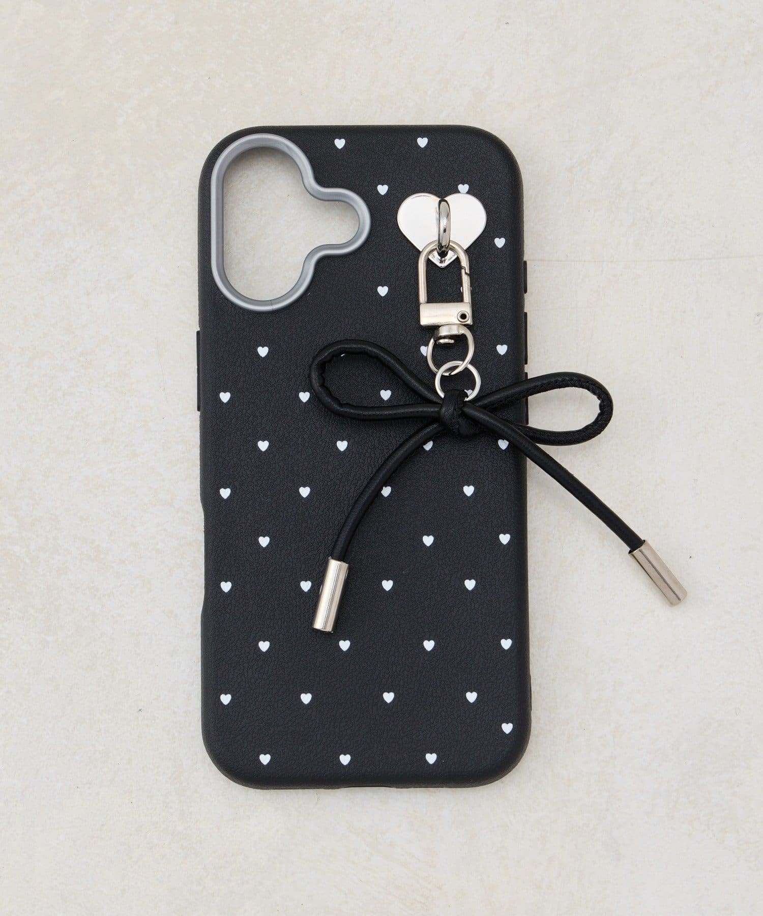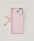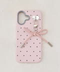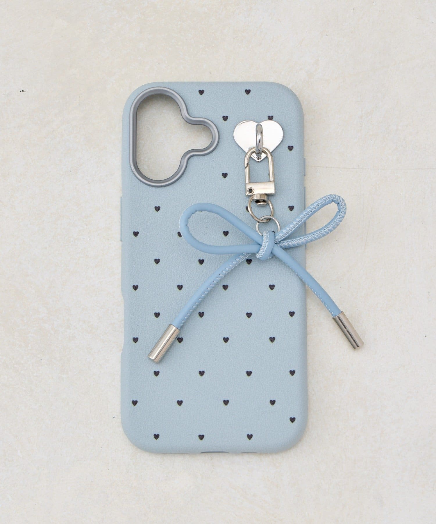 目を惹くのは、ケースとお揃いカラーの大きなリボン。チャームは取り外しも可能です