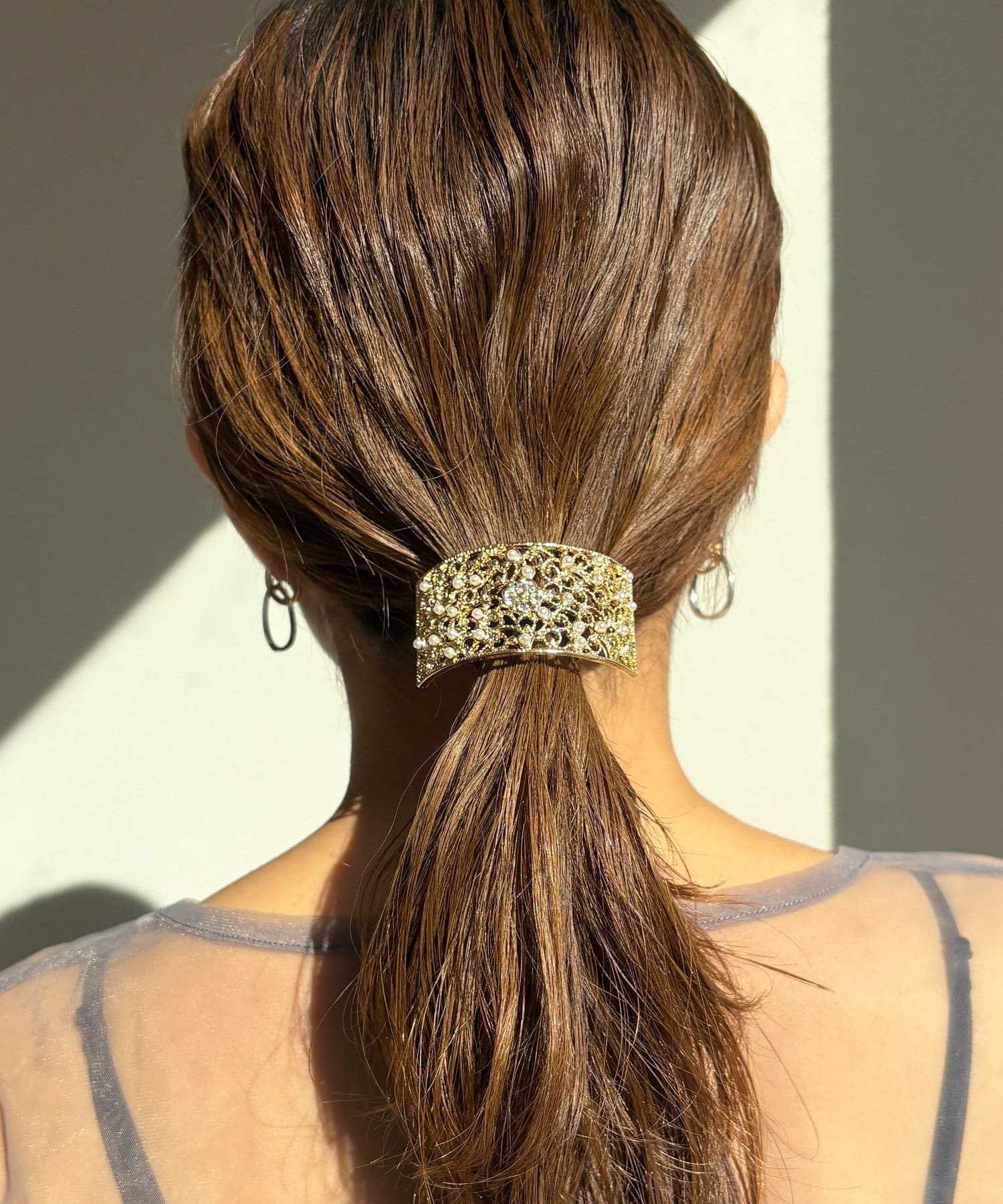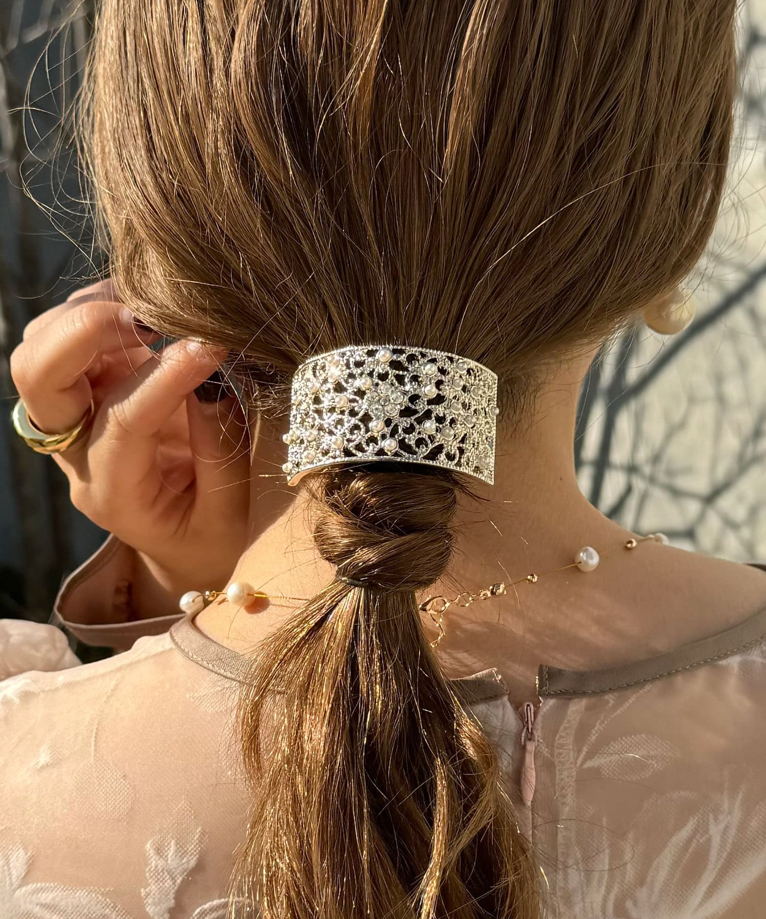パールが輝き、華やかな後ろ姿を演出するヘアゴム。