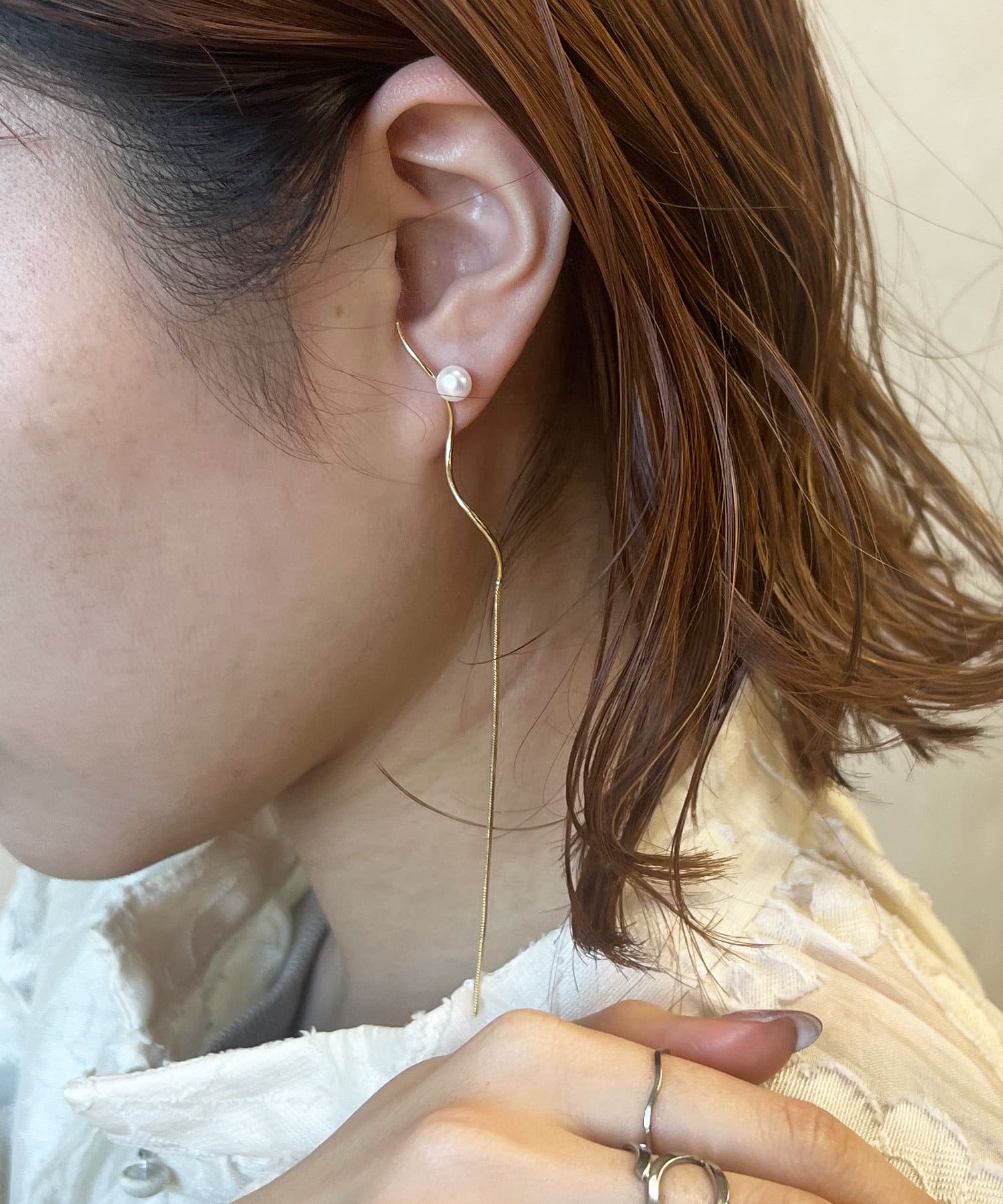 長めの揺れるモチーフが女性らしい華奢な印象を与えます。