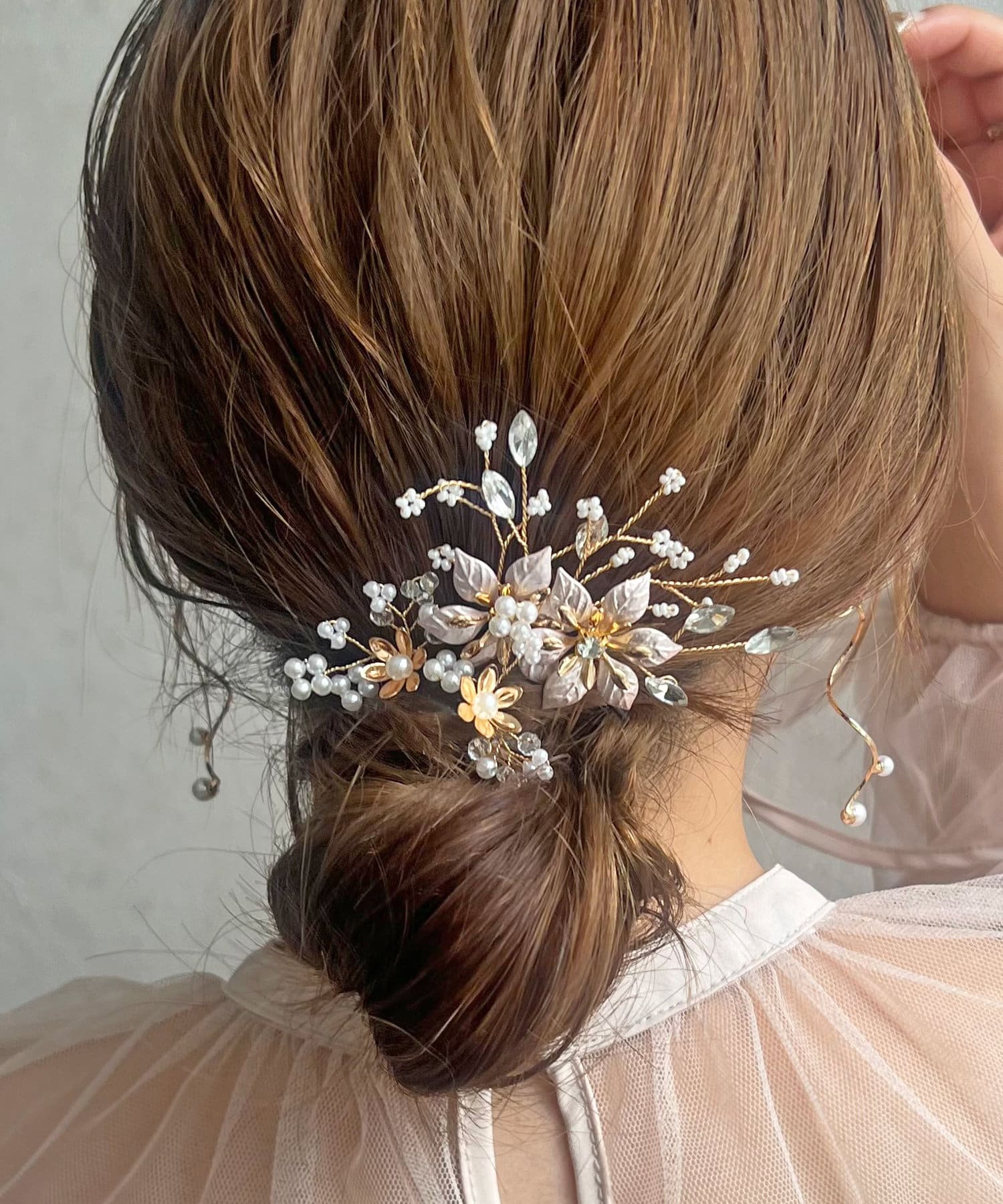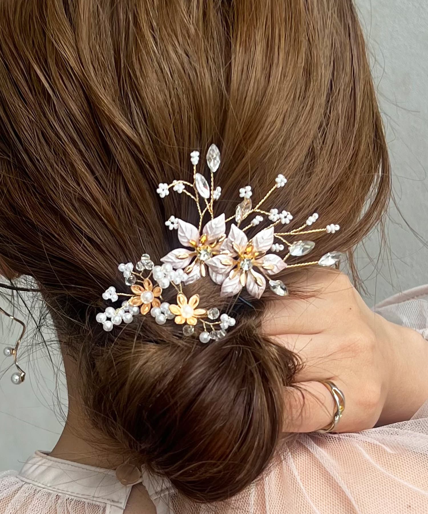 結んだ髪に留めるだけで簡単に華やかヘアに仕上がります。