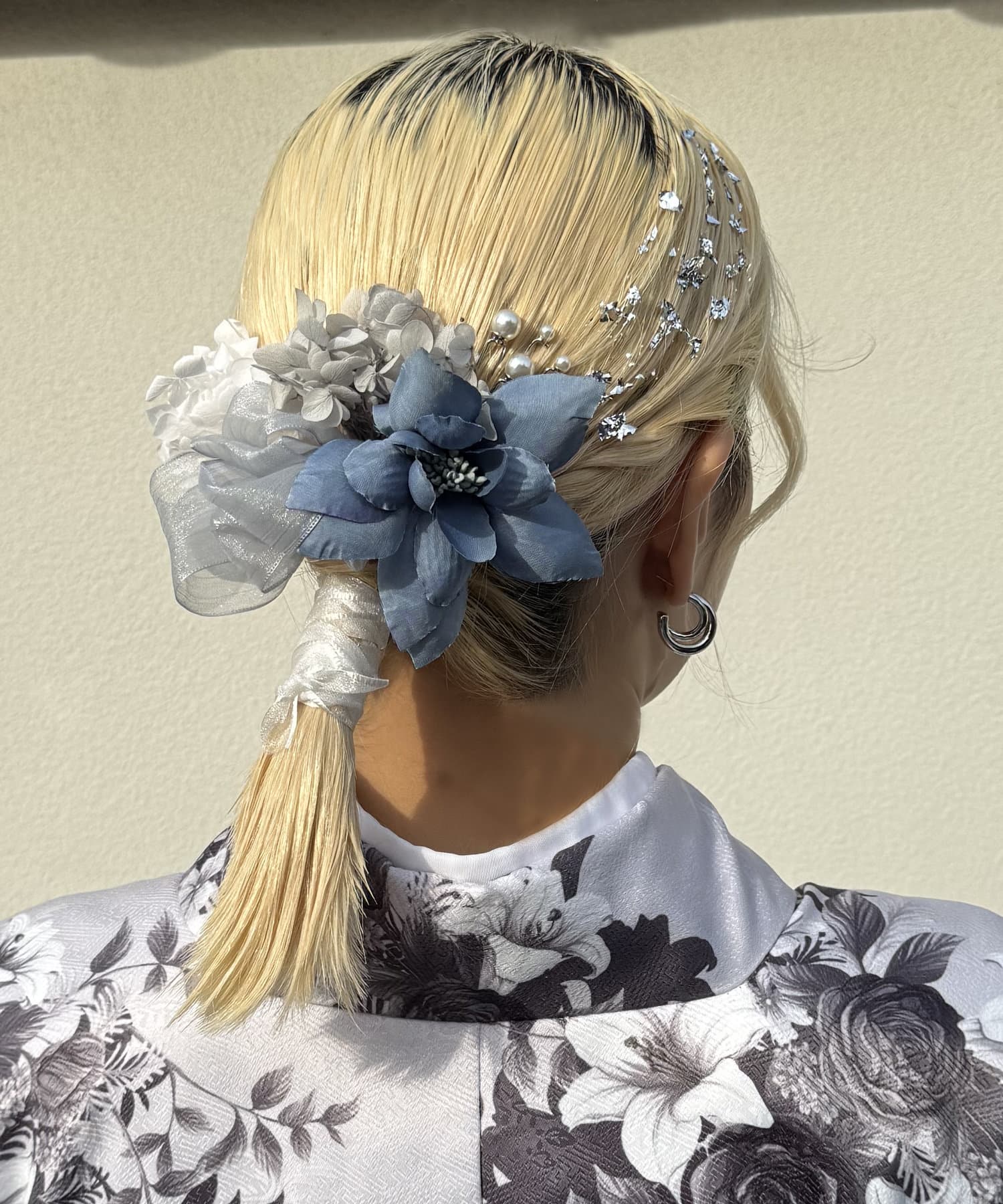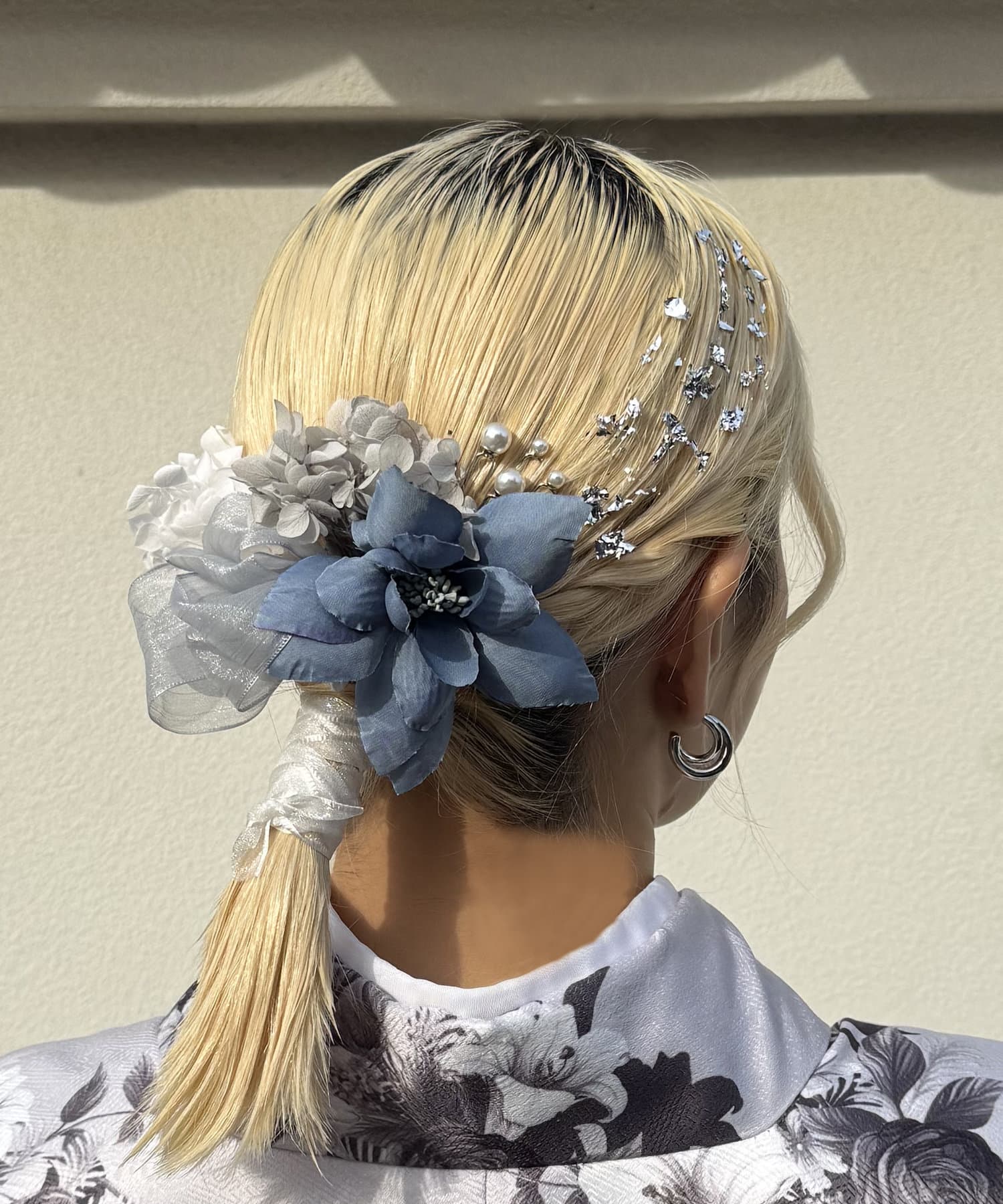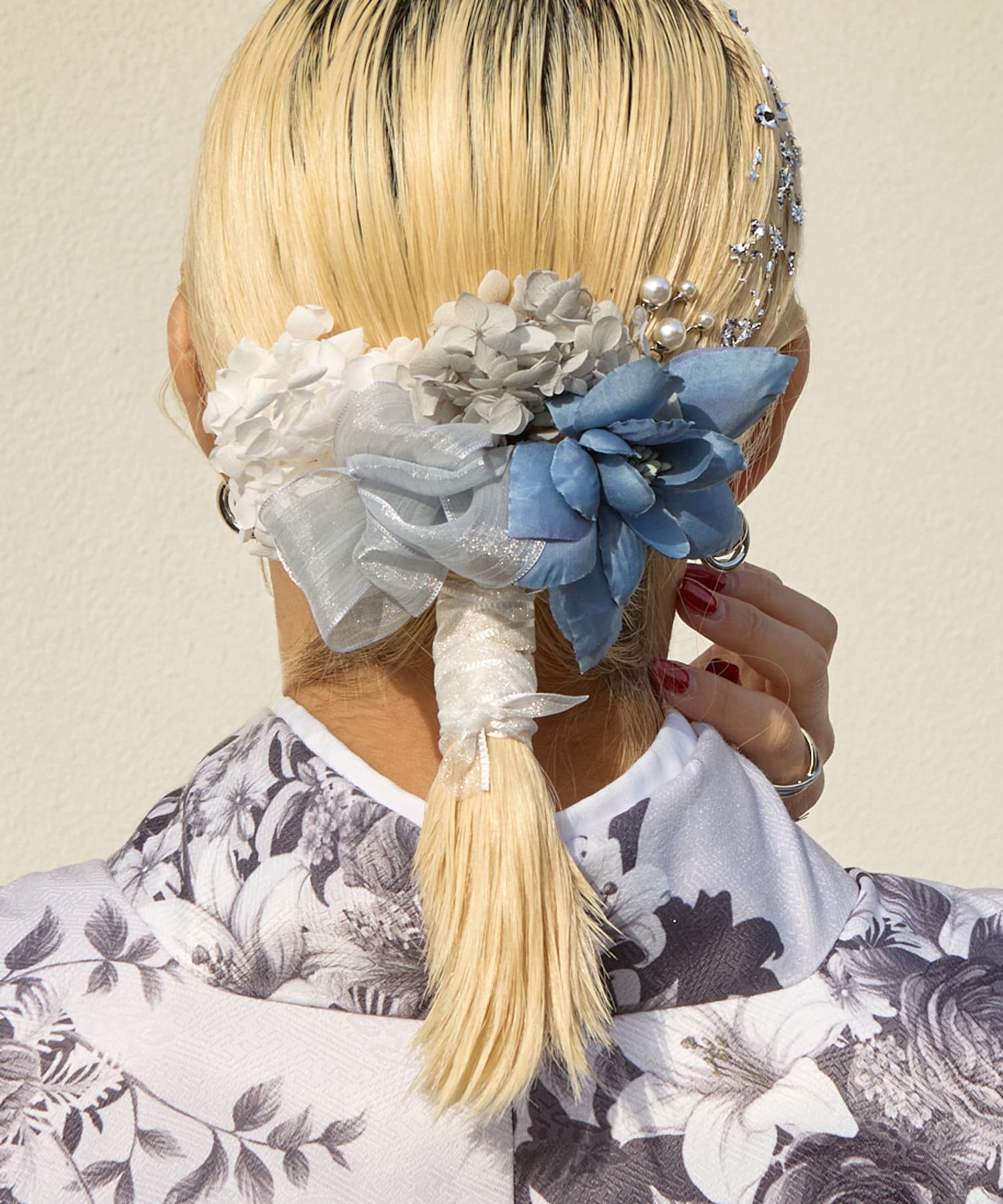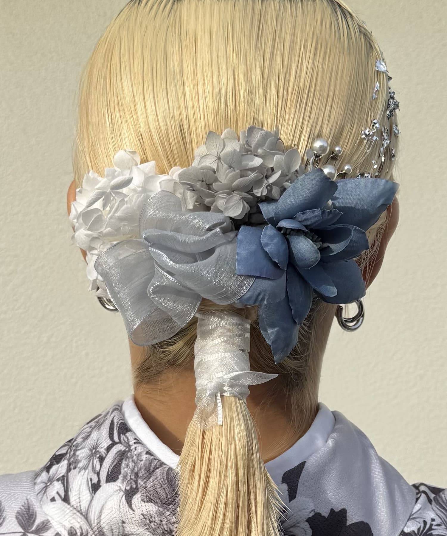 華やかなカラーのお花とパールがヘアスタイルをワンランクグレードアップしてくれます。