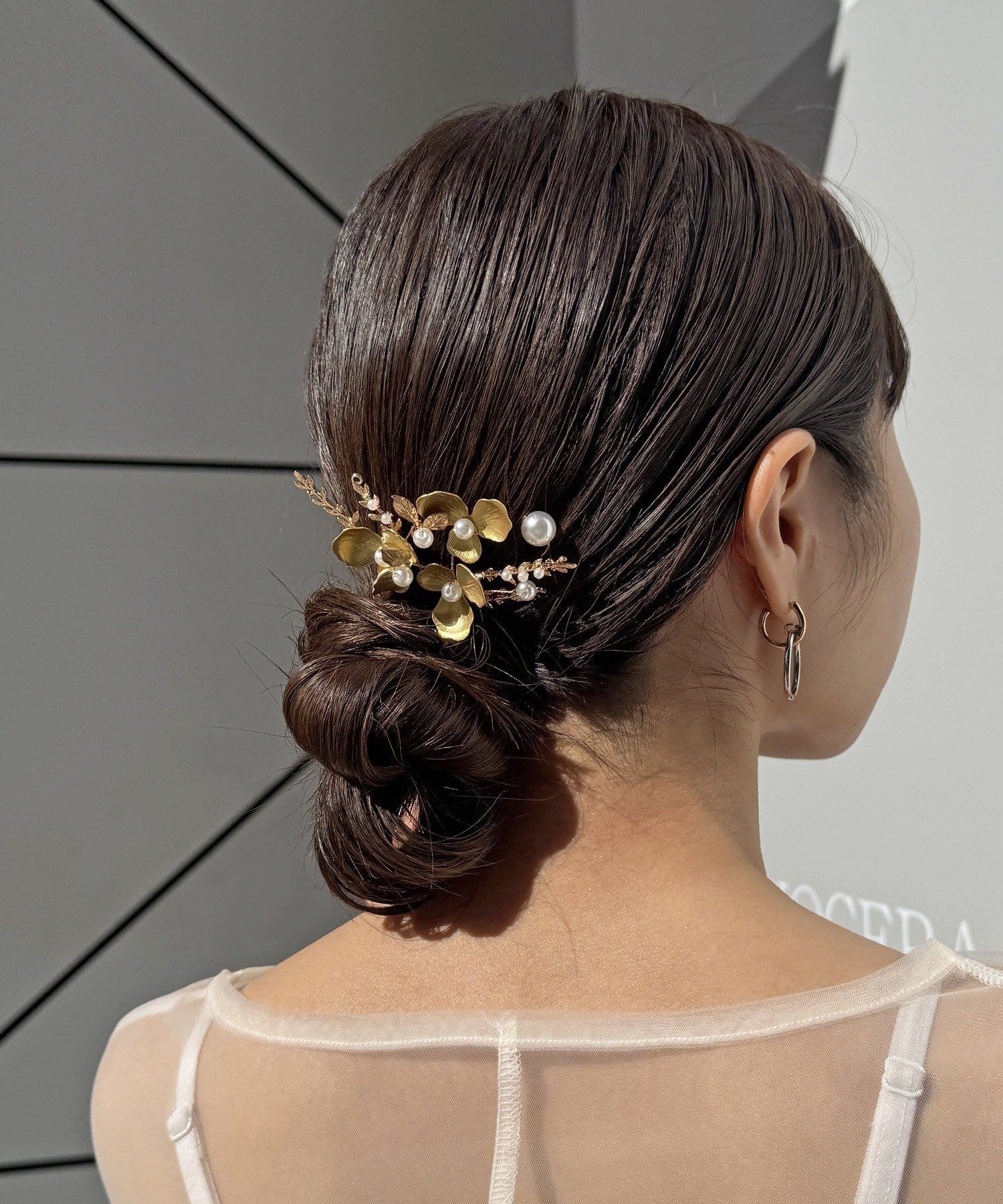 シニヨンや編みおろしにプラスするだけで、ぐっとこなれたお呼ばれヘアが完成。