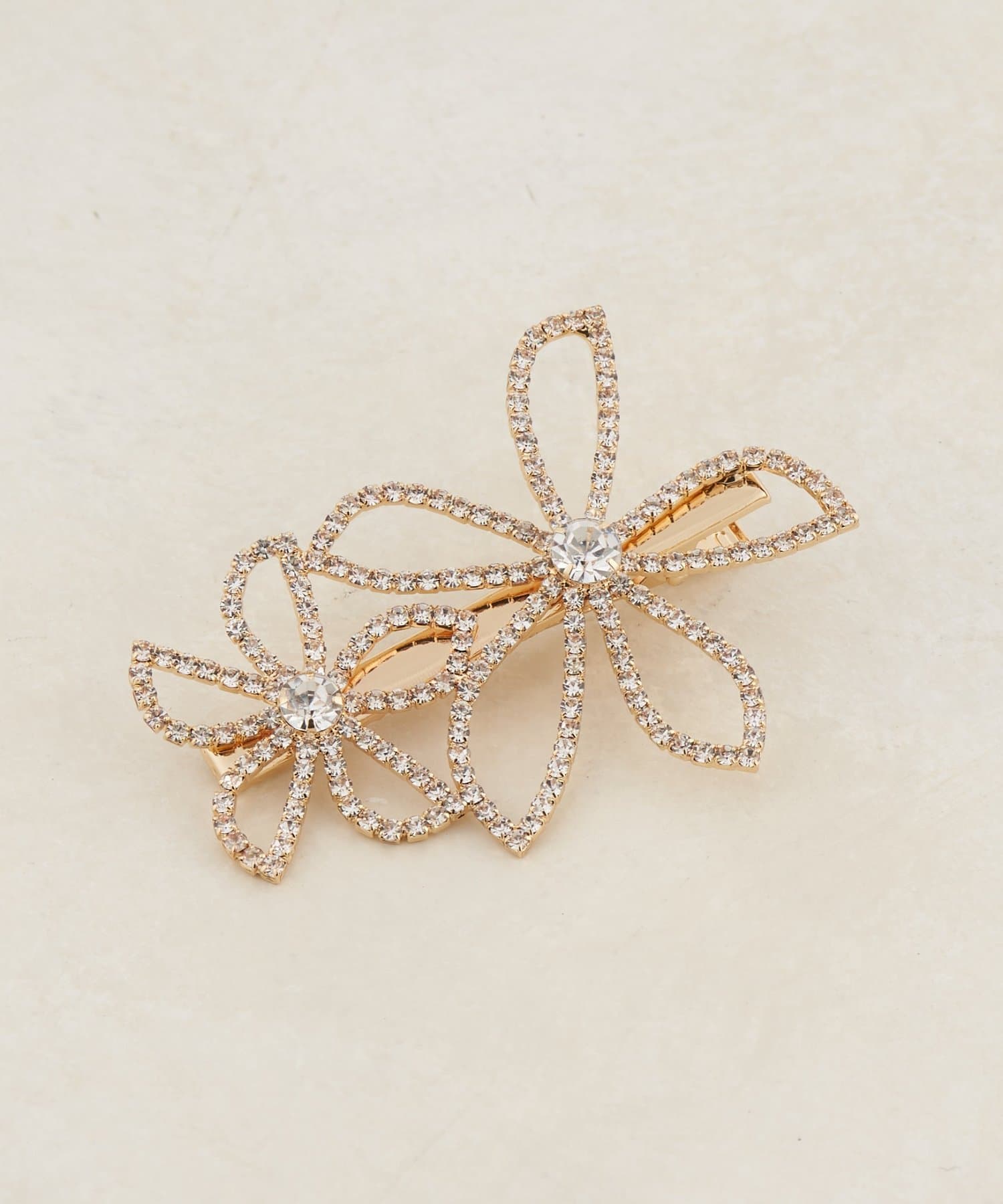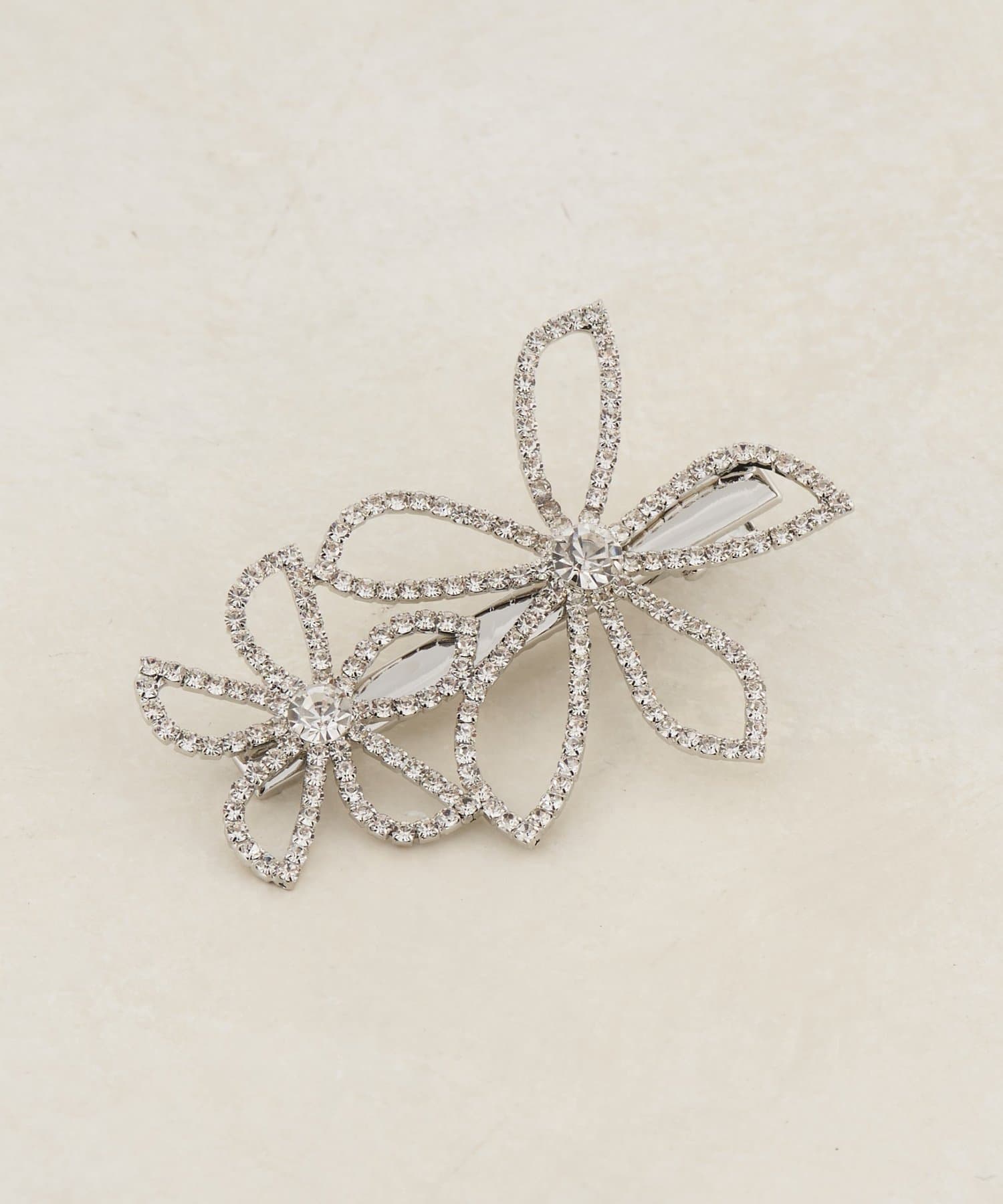 繊細なラインで描かれた2つのフラワーモチーフに、ガラス製のビジューを贅沢に敷き詰めました。