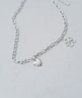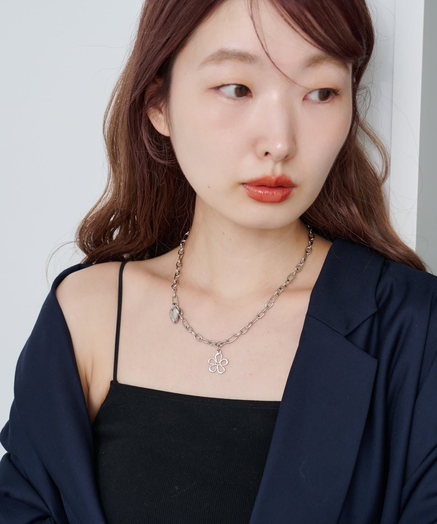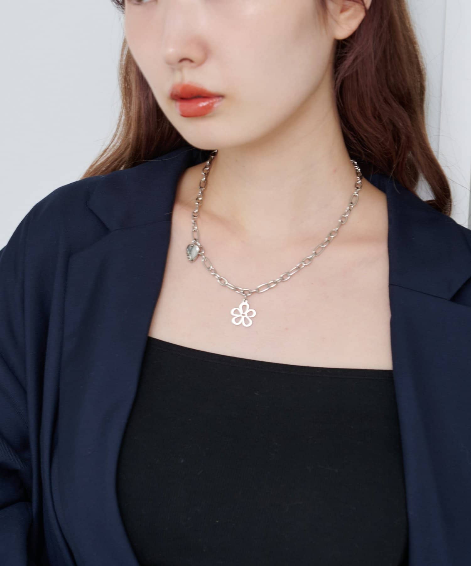 チェーンにハートとフラワーモチーフのチャームが揺れる、フェミニンで遊び心のあるデザインのネックレス。