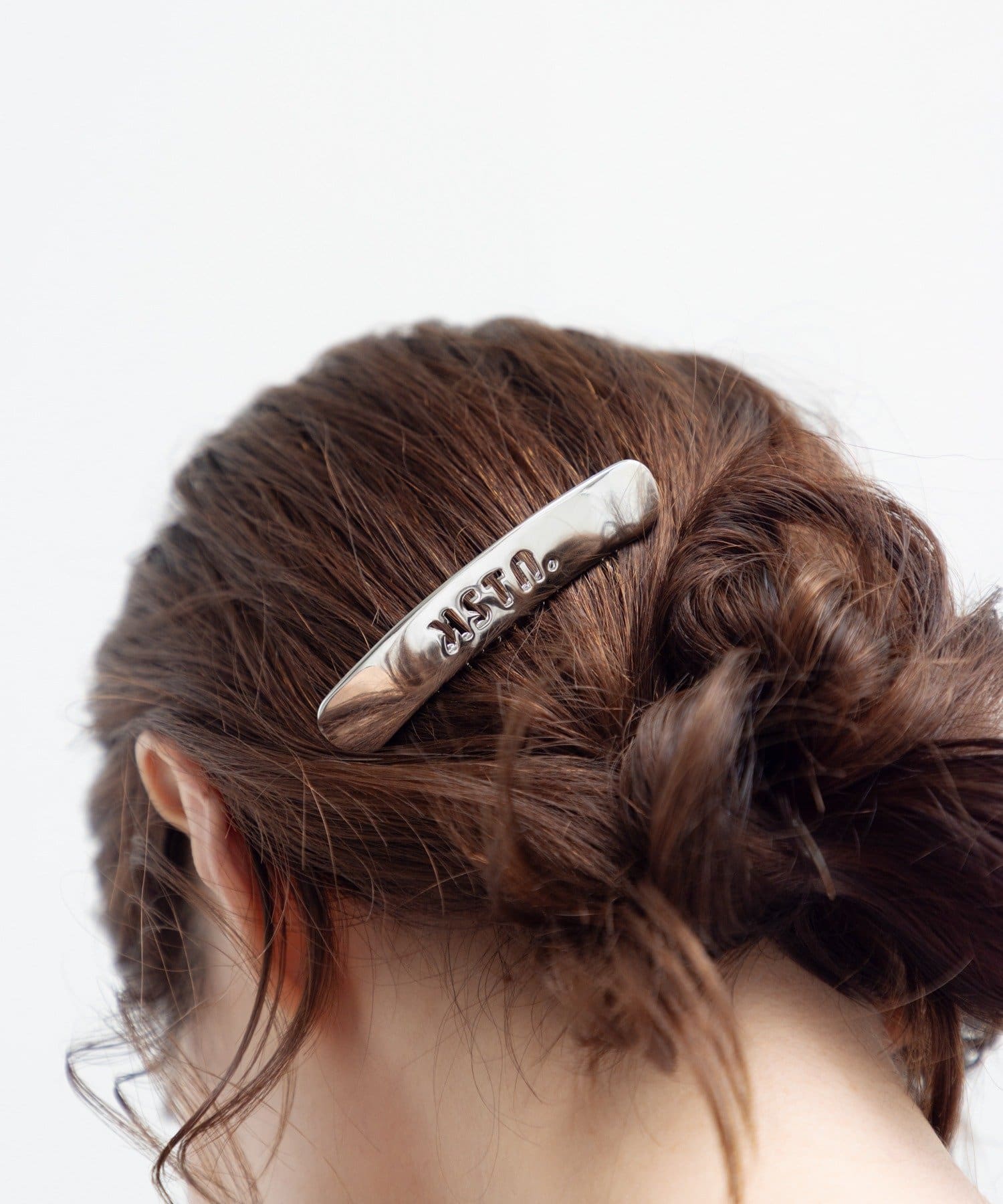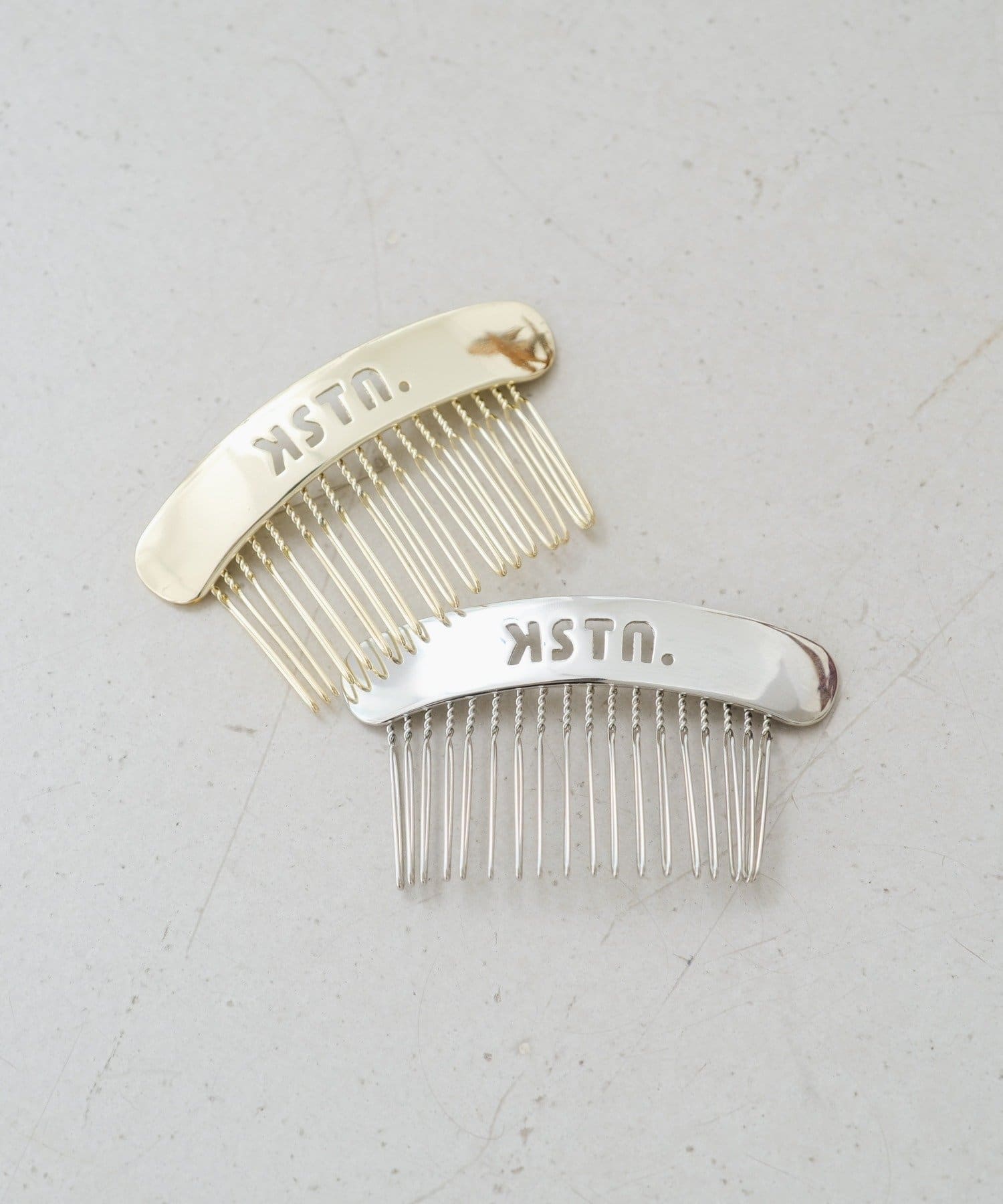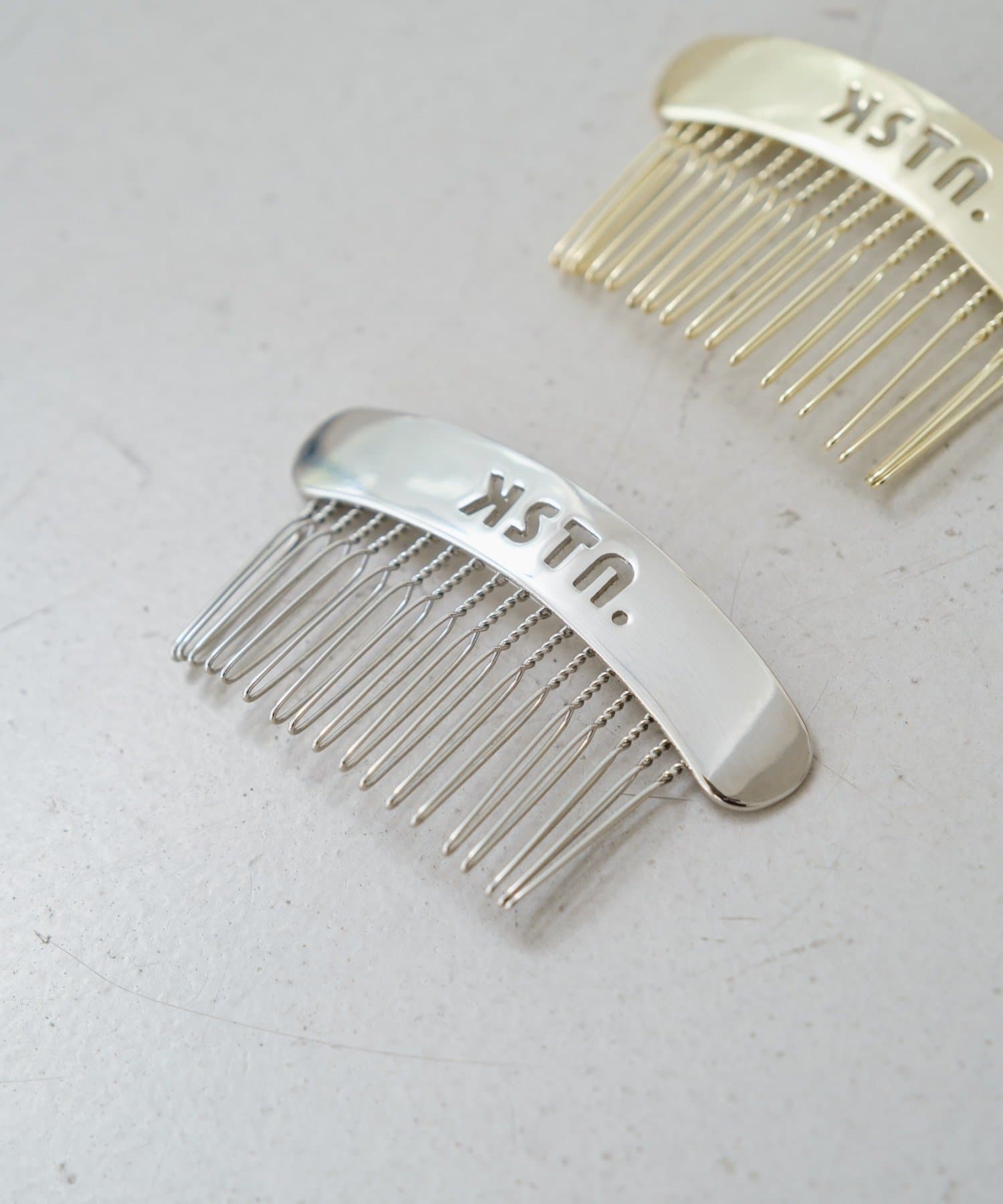 スタイリッシュなロゴデザインが目を引く、コームタイプのメタルヘアピン
